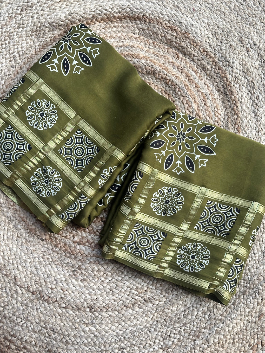 Mehendi green Ajrak modal silk sarees with out block prints