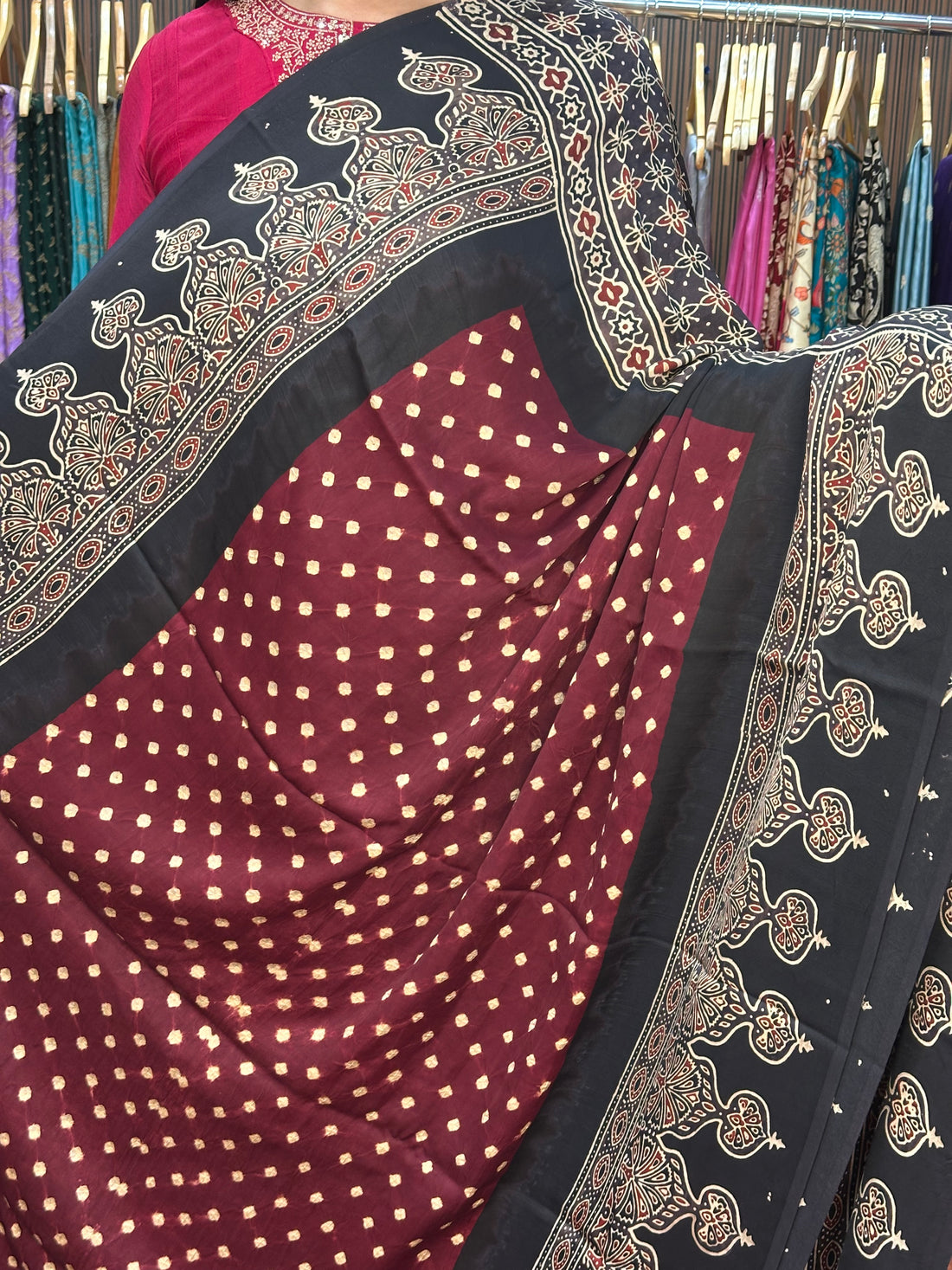 Maroon and black pure Ajrak modal Sarees