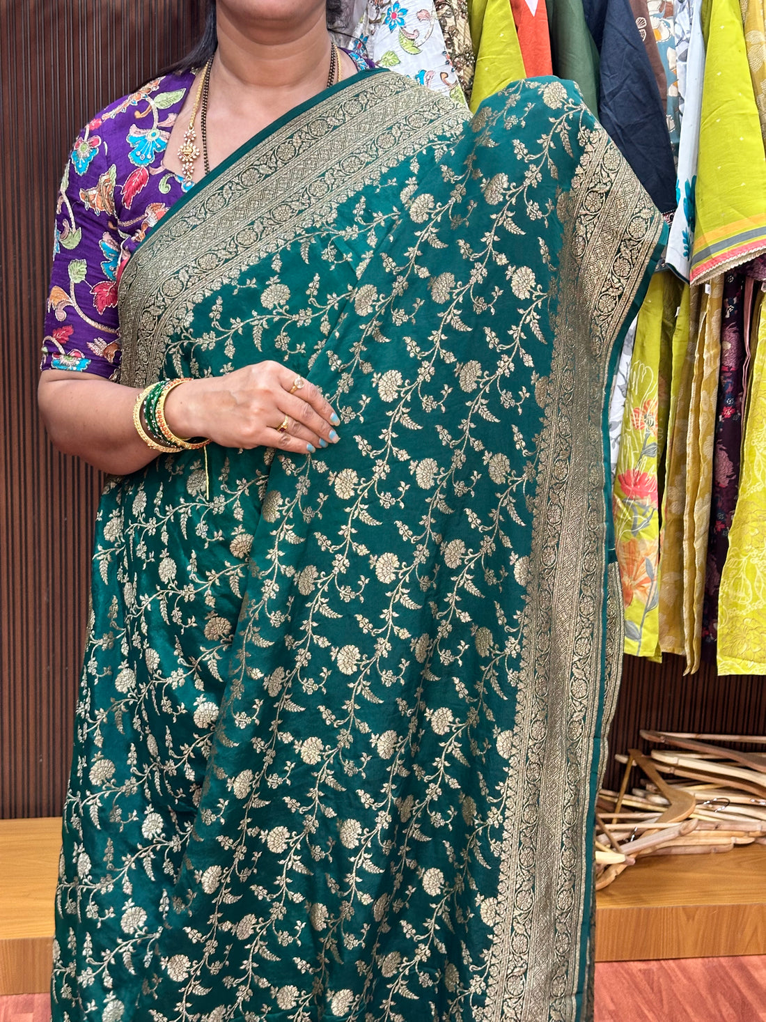 Dark green with purple pure crepe Mysore Silk sarees butterfly border 120 gsm