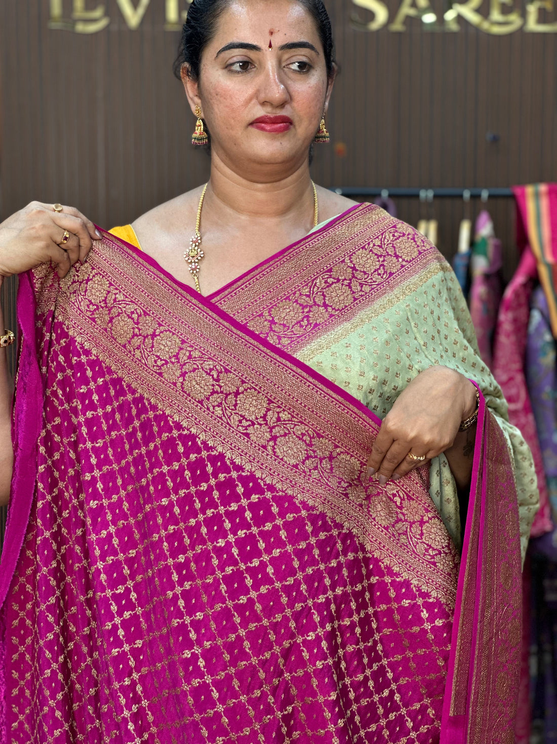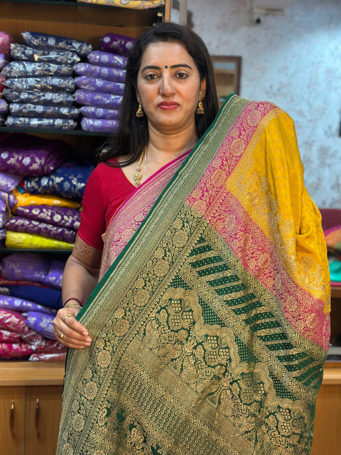 Mustard and green pink pure crepe Banaras 3D pattern with brocade blouse