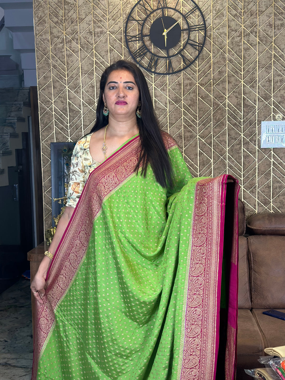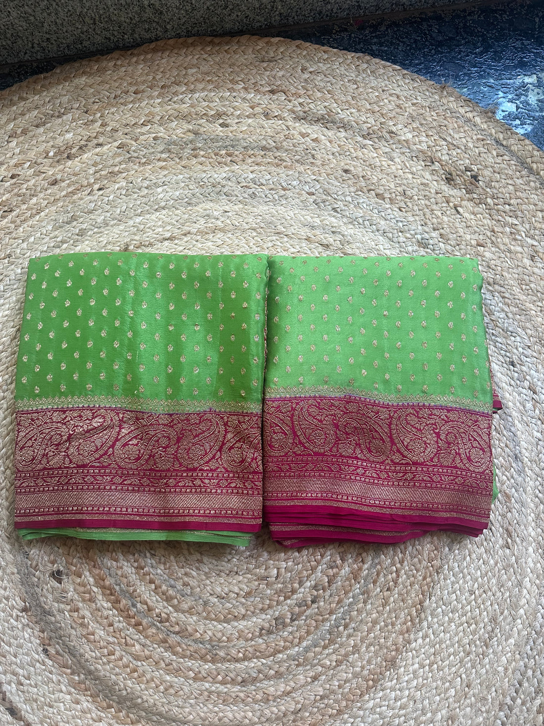 Green and mejentha pink pure crepe Banaras silk sarees.