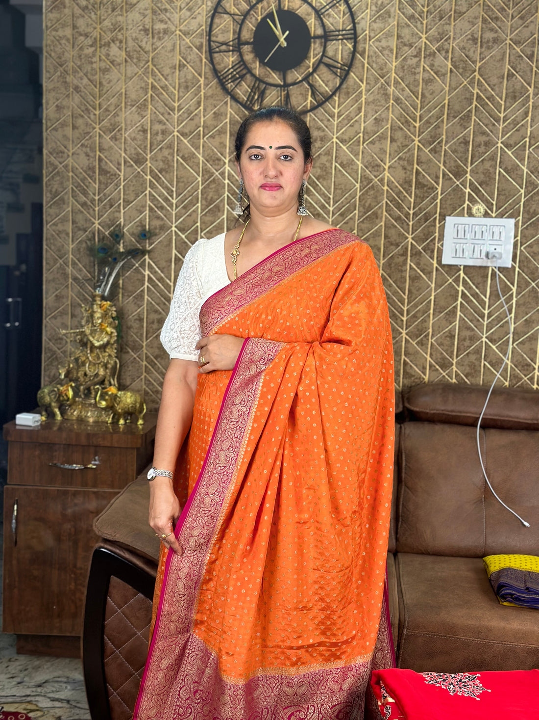 Orange and pink pure crepe Banaras silk sarees with Lehariya pattern blouse