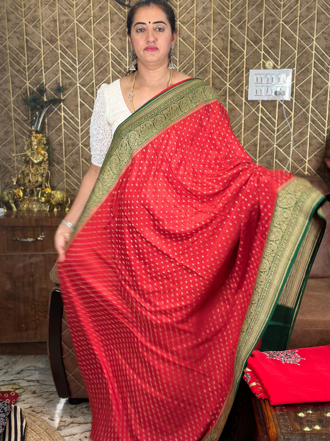 Red and green pure crepe Banaras silk sarees.