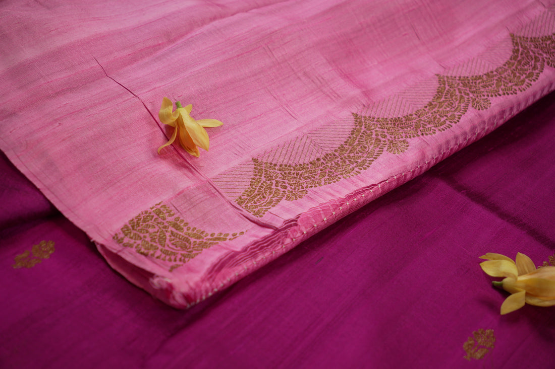 pink pure raw silk saree with scallop border.