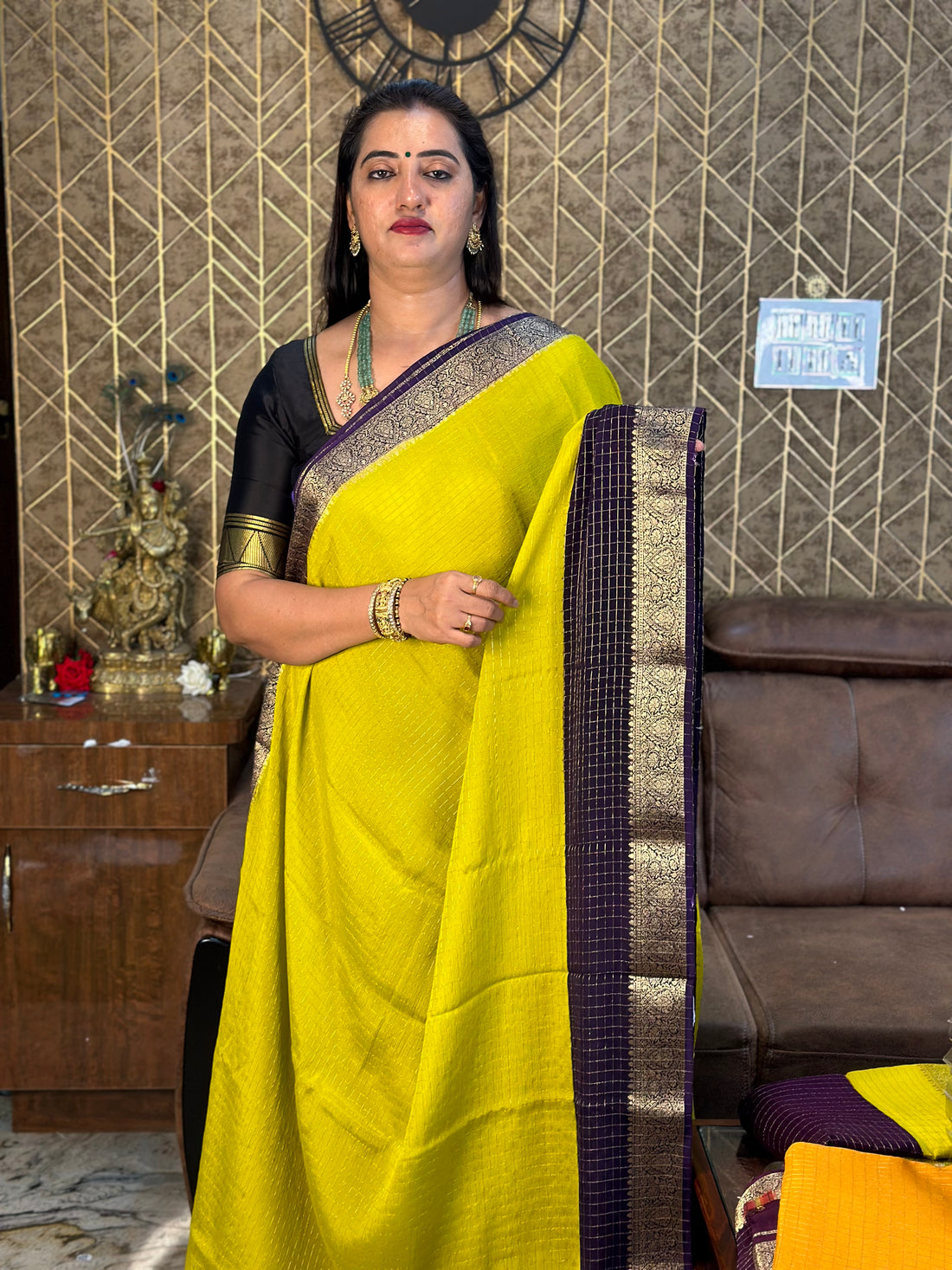 Chocolate brown with mustard semi checks crepe with designer blouse.