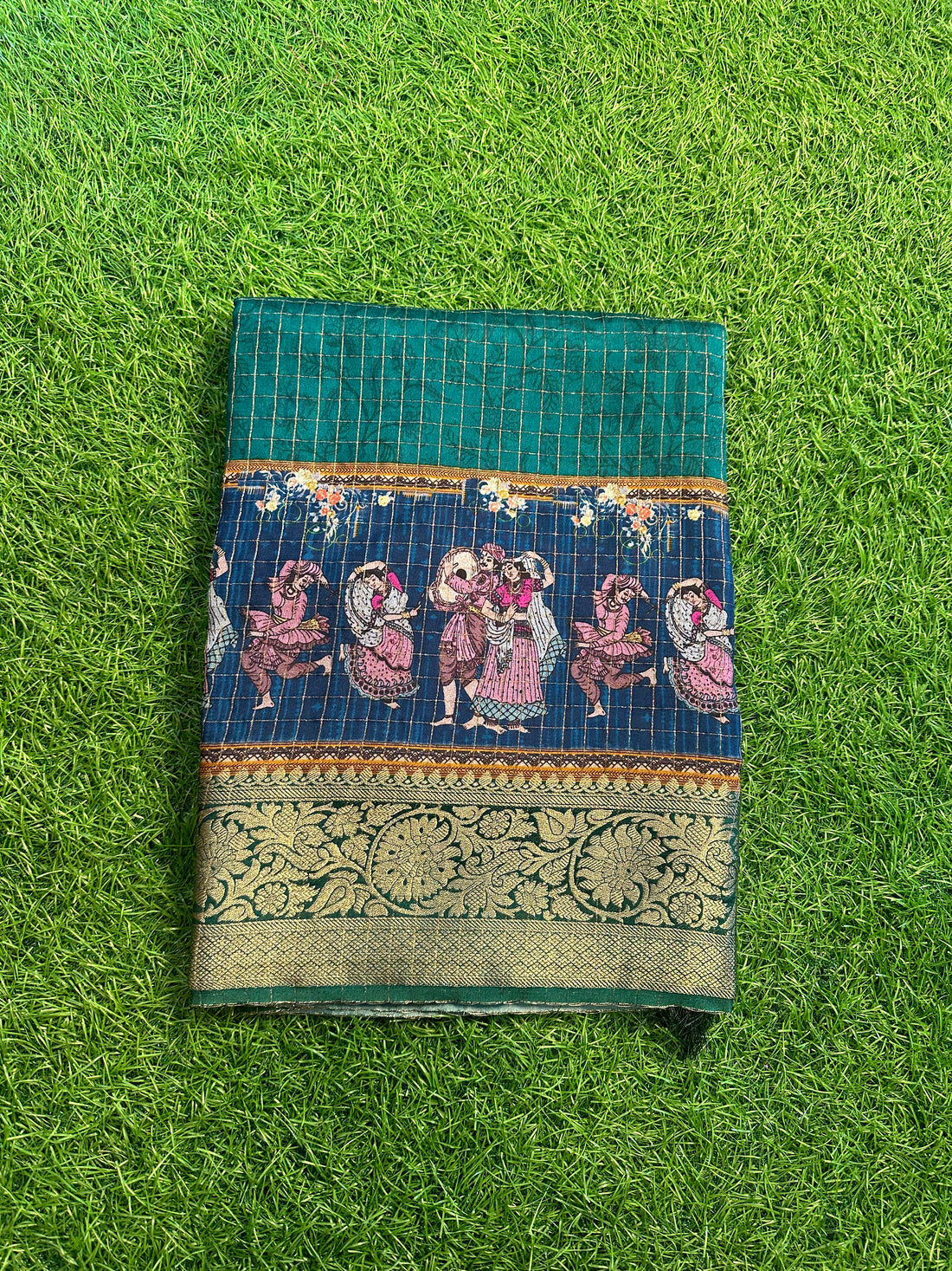Half white and grey Semi checks crepe with digital kalamkari horizontal stripes.
