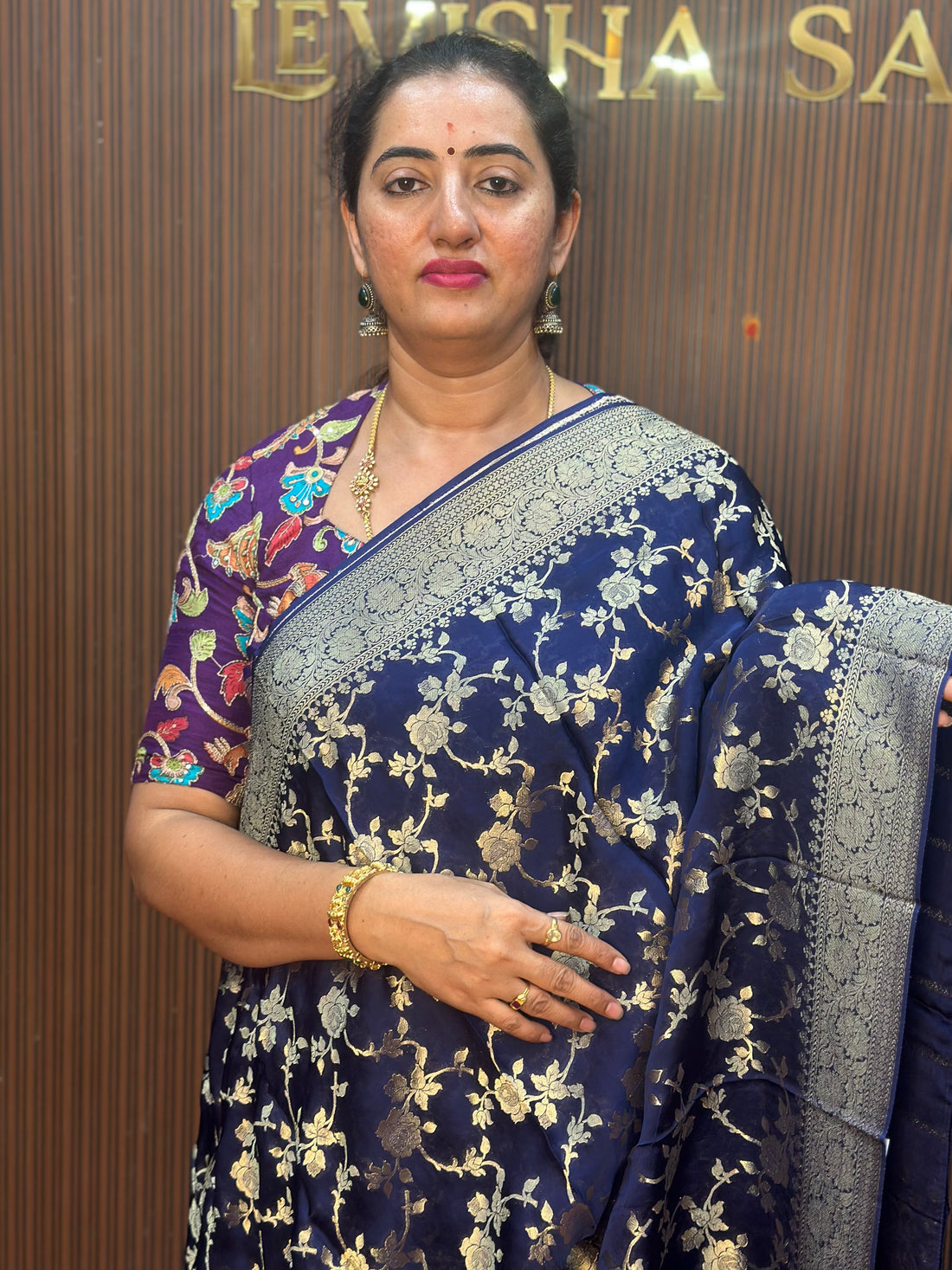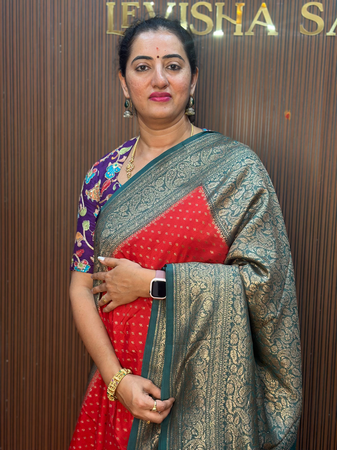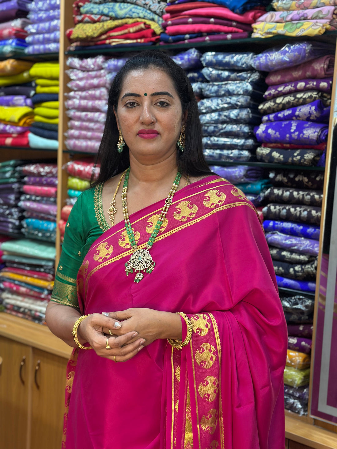 Rani pink pure crepe Banaras silk sarees. Gandaberunda border