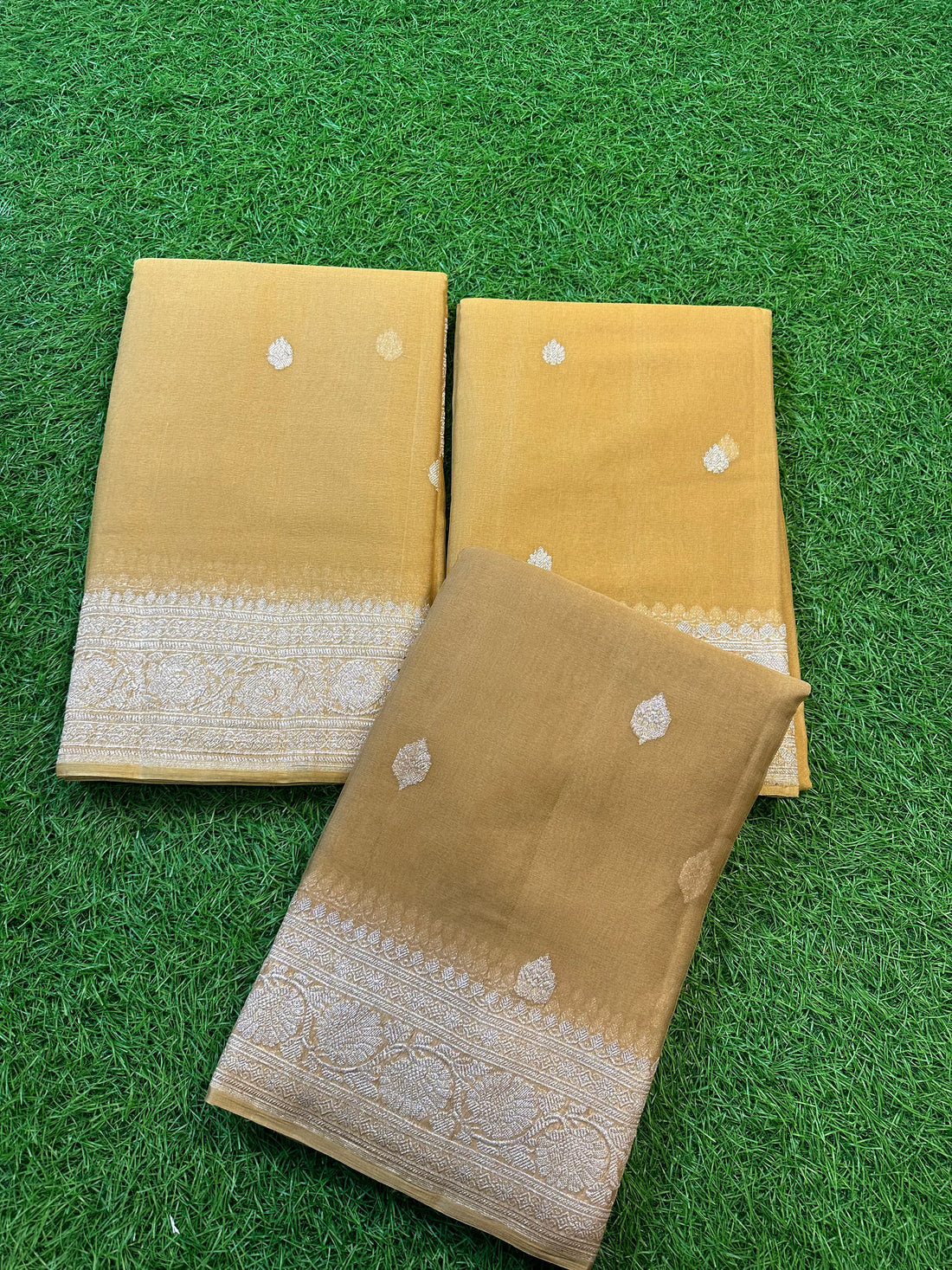Deep green and mustard pure crepe Mysore Silk sarees 100 gsm