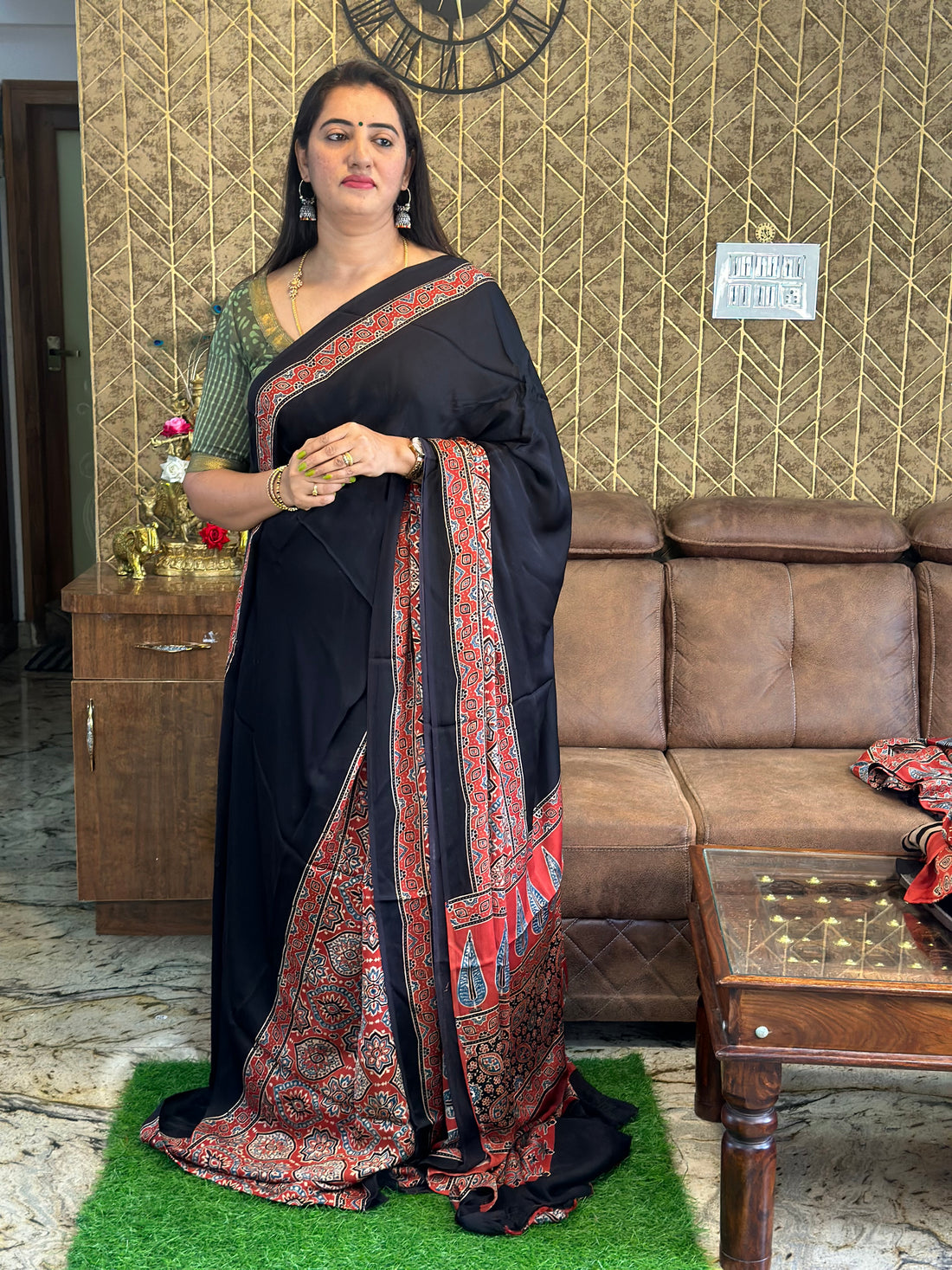 Expertly crafted with pure crepe, this Banaras fabric boasts a classic black base with striking...