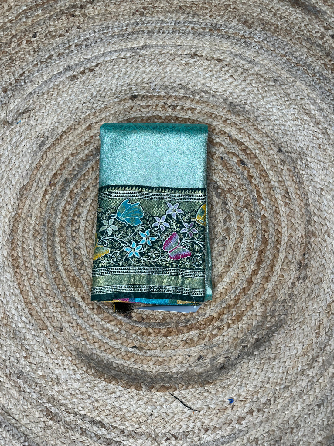 Teal green with lavender pure khaddi chiffon Banarasi sarees.