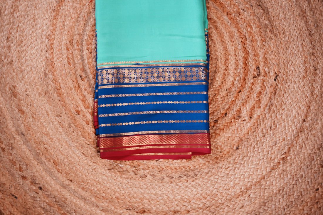 Teal blue with deep blue and pink border Pure Mysore silk 120 gsm