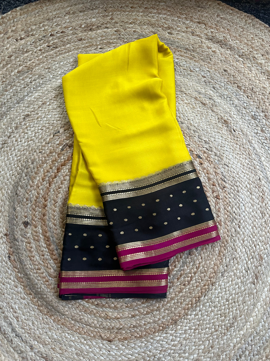 Yellow and dark mejentha mango bentex border pure crepe Mysore Silk crepe 120 gsm.