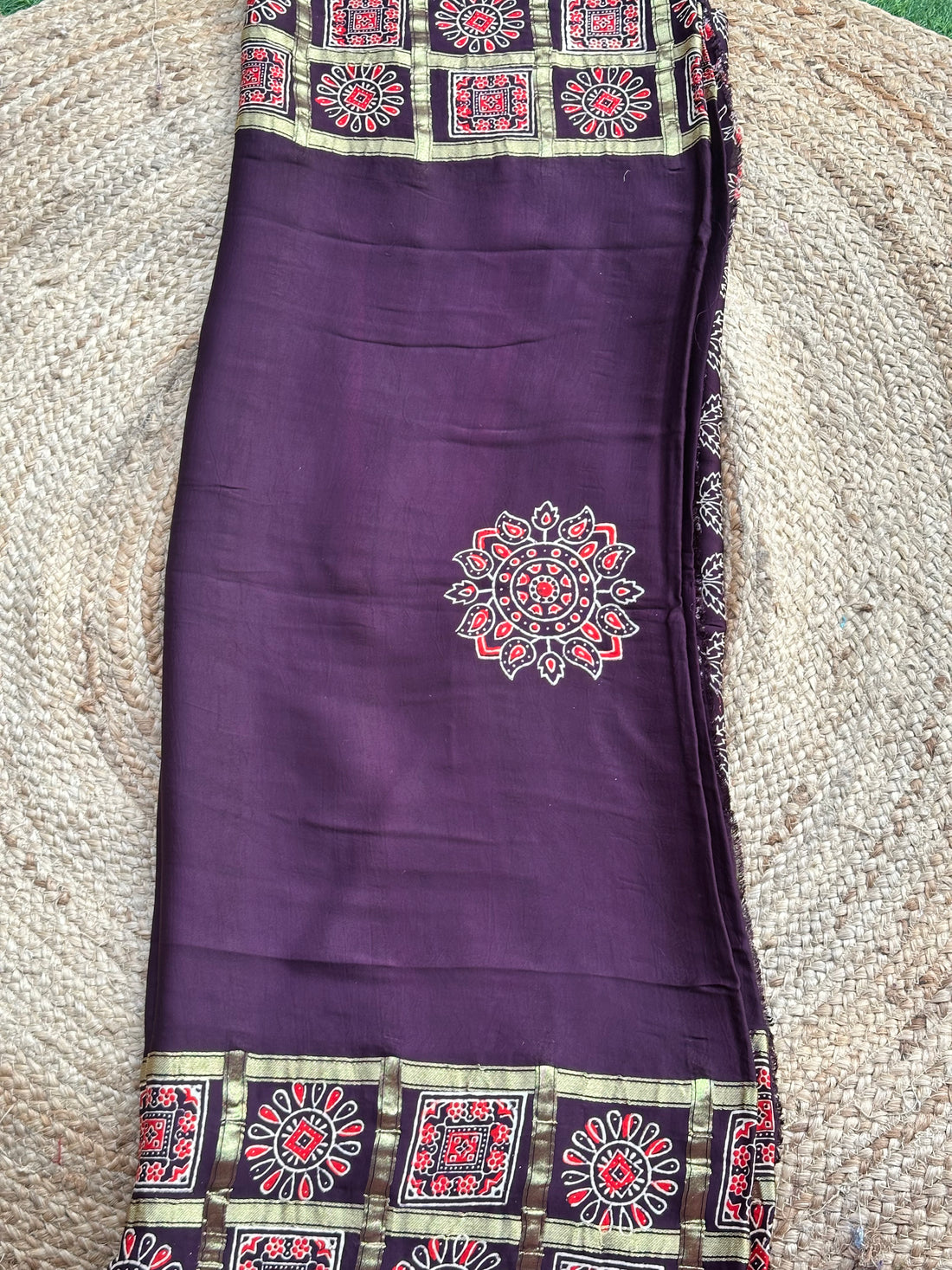 Deep coffee brown pure modal silk sarees with Ajrak blouse