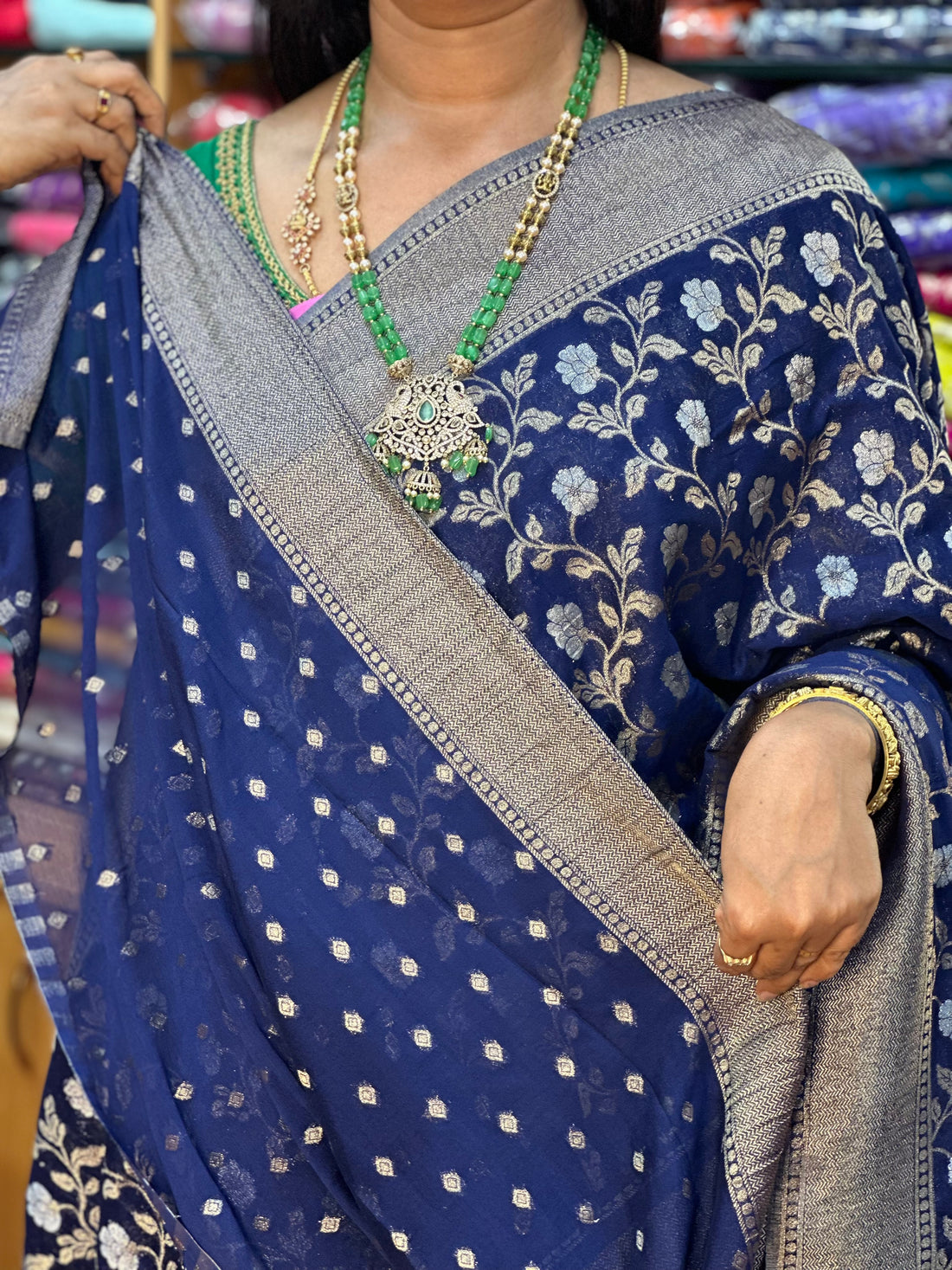 Red and green crepe chiffon with brocade blouse.