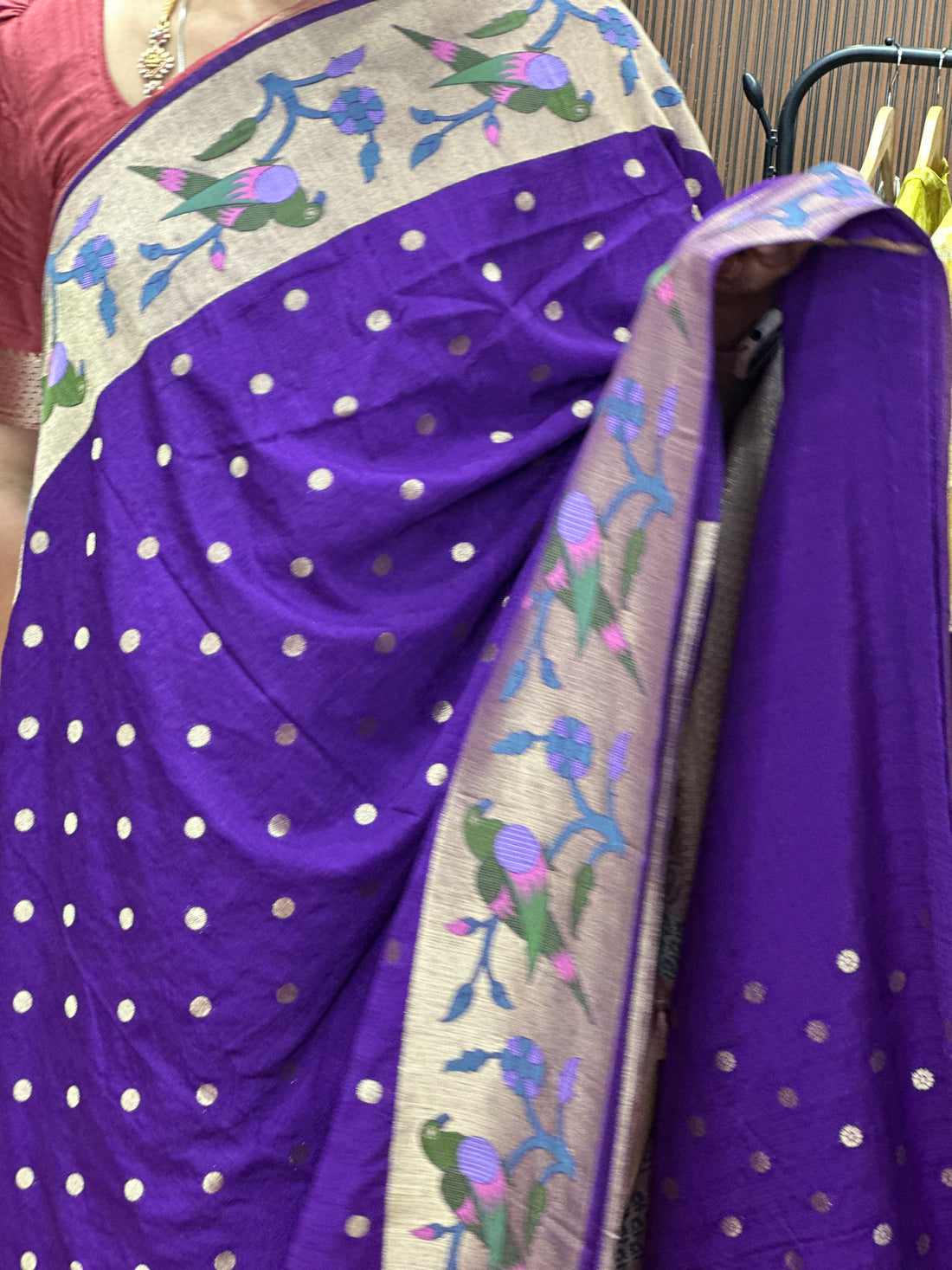Purple with mango yellow Pure Mysore Silk crepe with central lines