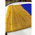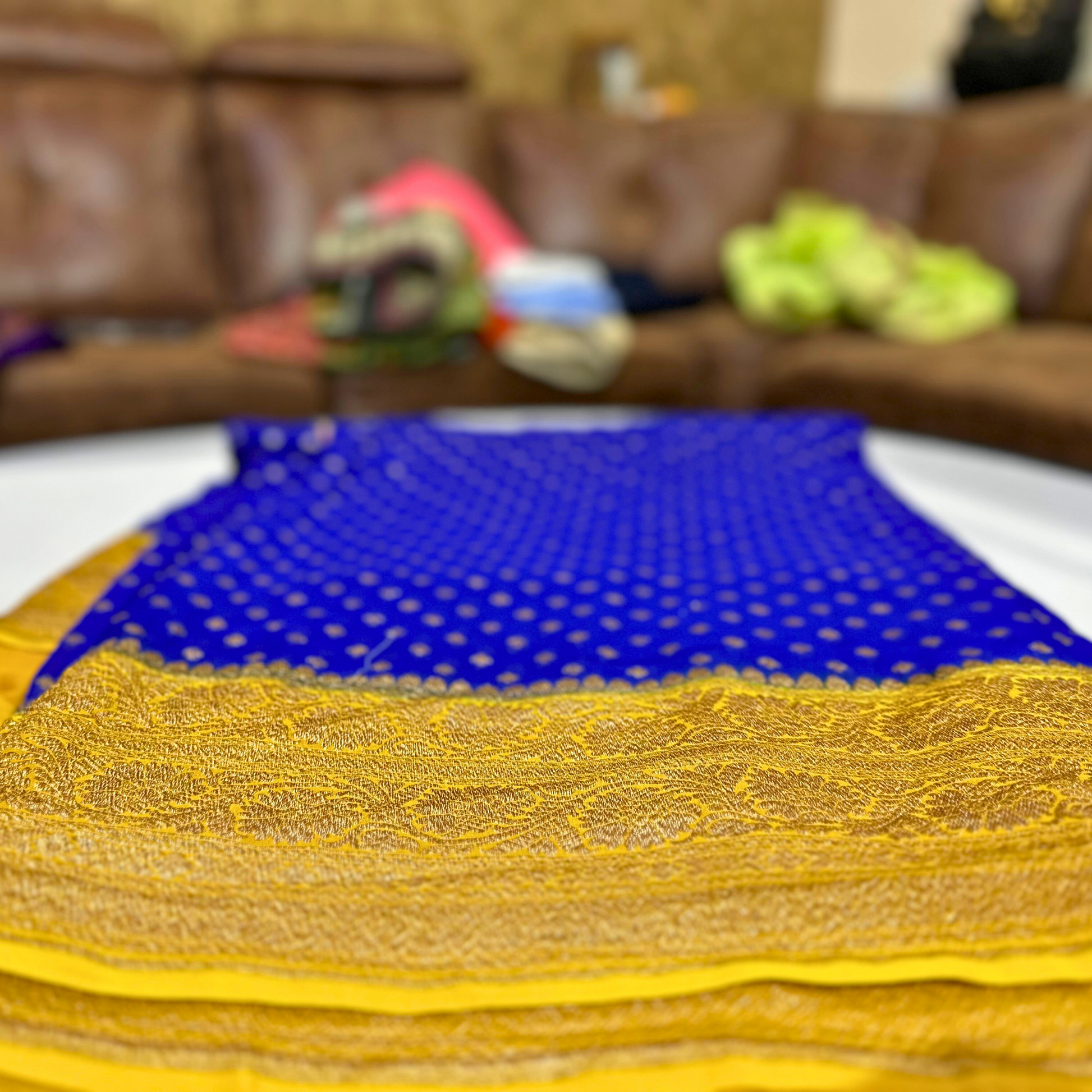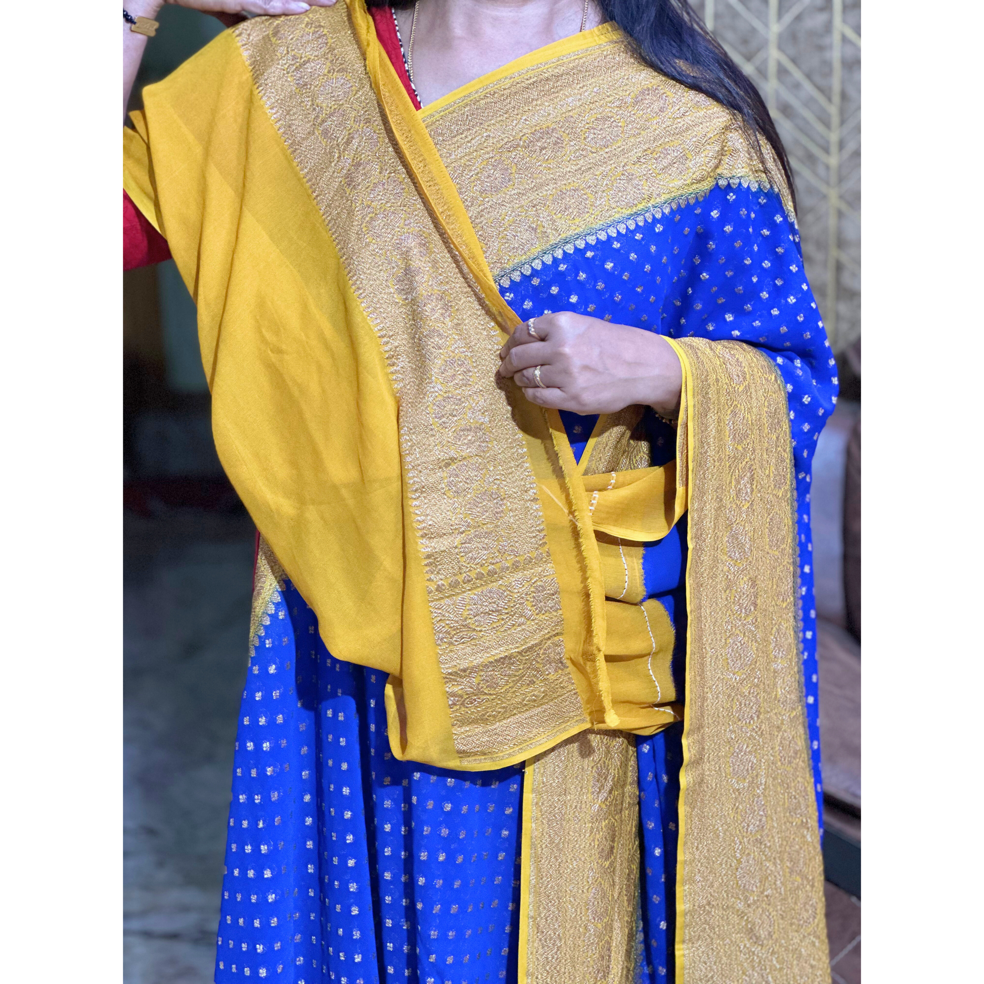This Blue pure zari woven Benaras georgette saree with zari woven butta running all over the saree and a contrast border and pallu is very elegant and traditional suitable for all your occasions and events, can be styled by any age group. Comes with a plain blouse with border