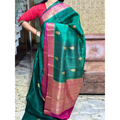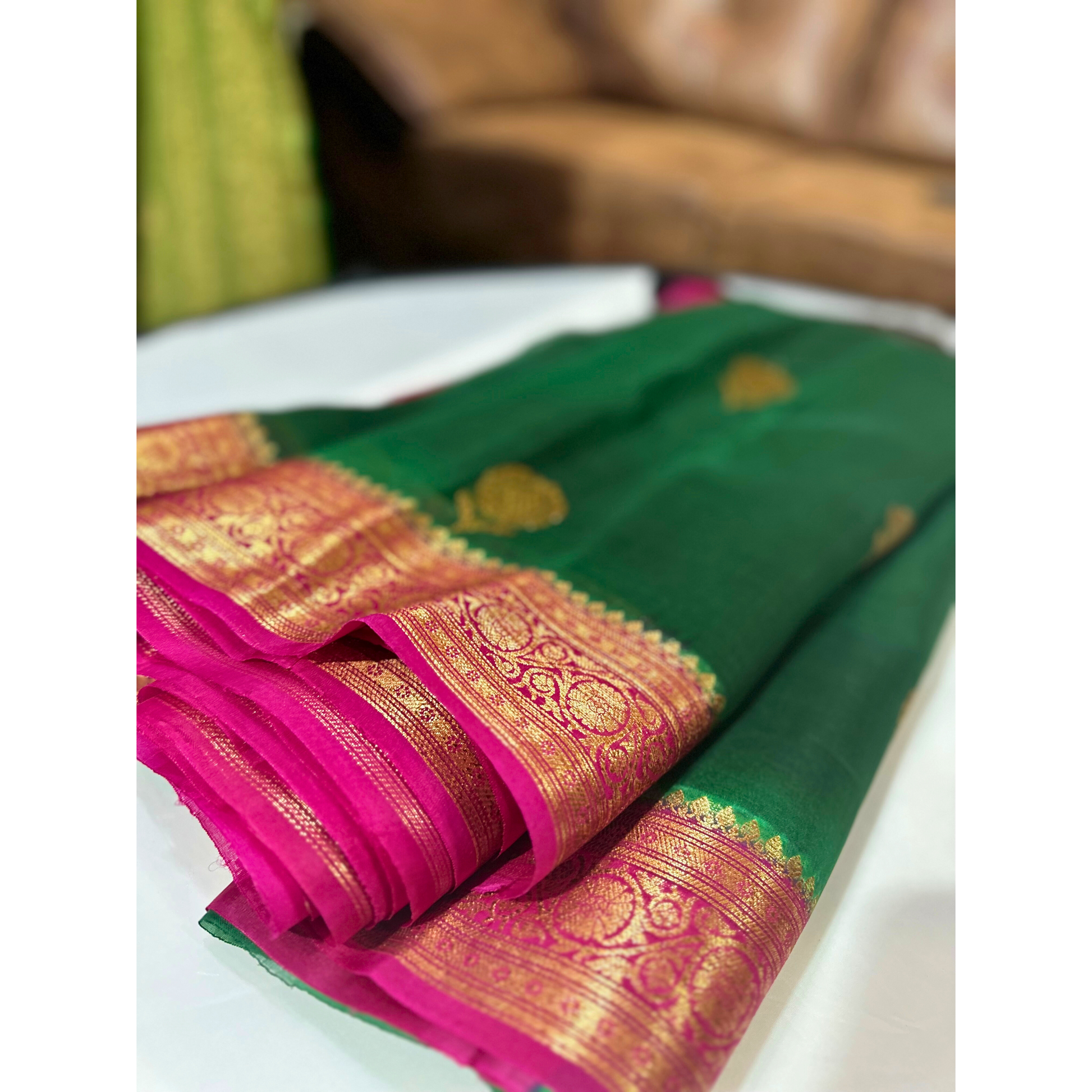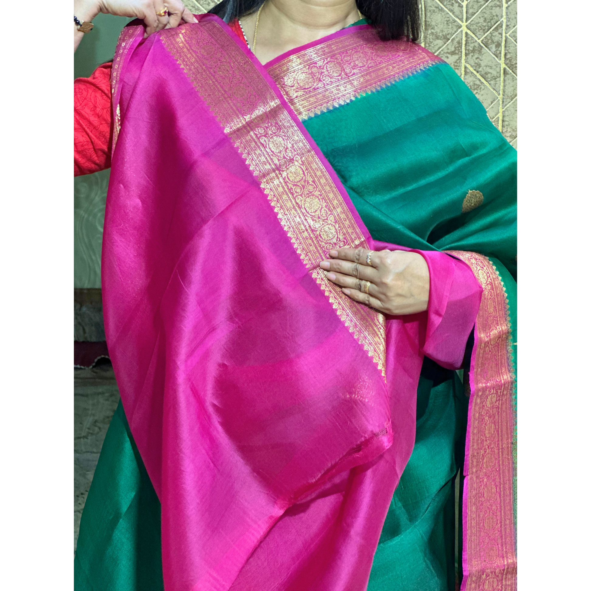 Our Pure Kora Silk Saree is made from the finest fabrics, featuring a traditional banarasi border and stripe zari work. Perfect for special occasions and formal events, this saree is sure to make you stand out with its exquisite detailing.