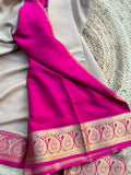 Beige with pink mango border pure crepe Mysore Silk sarees 120 gsm