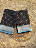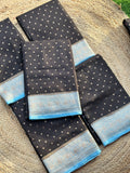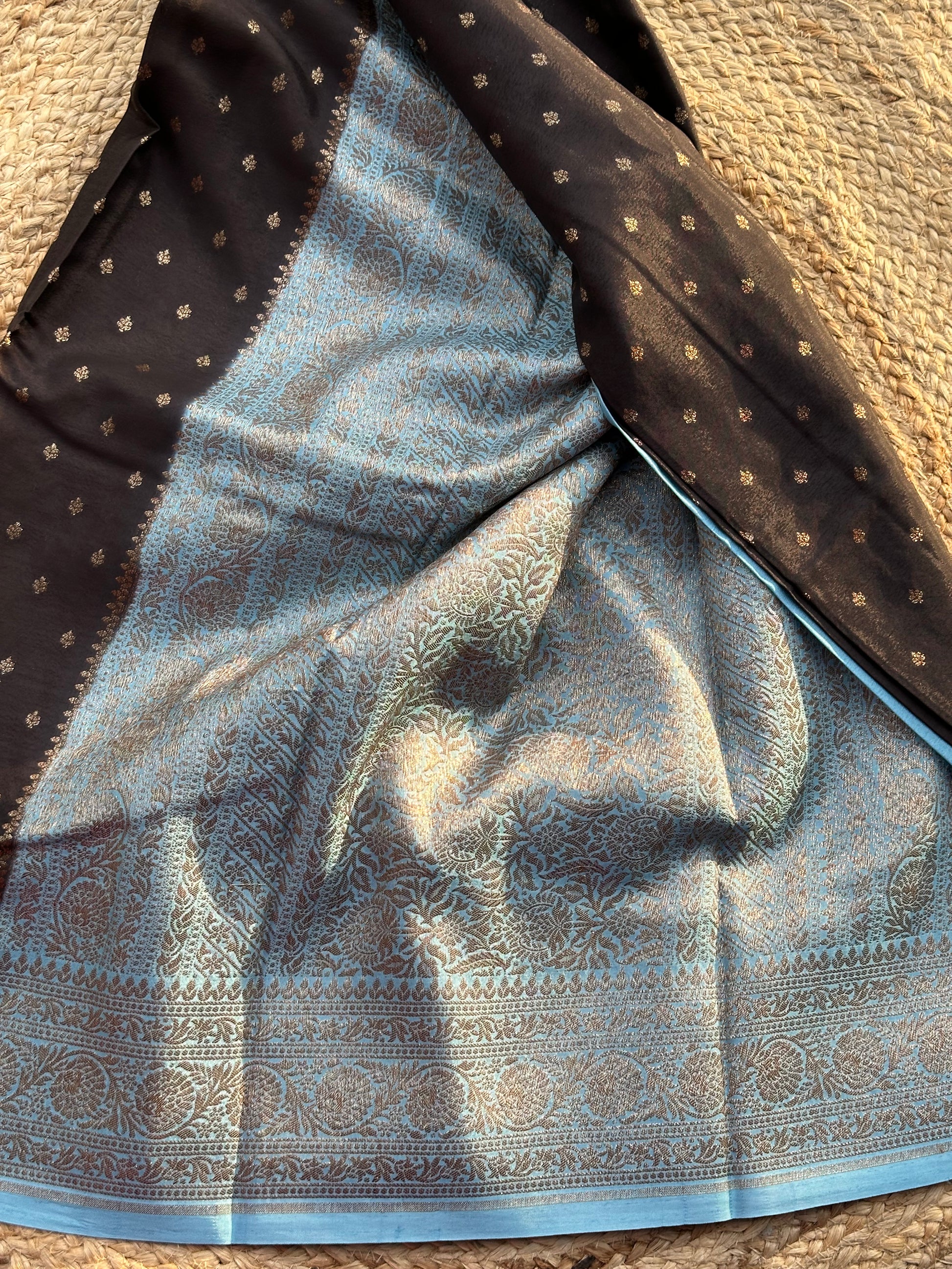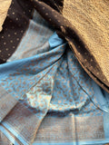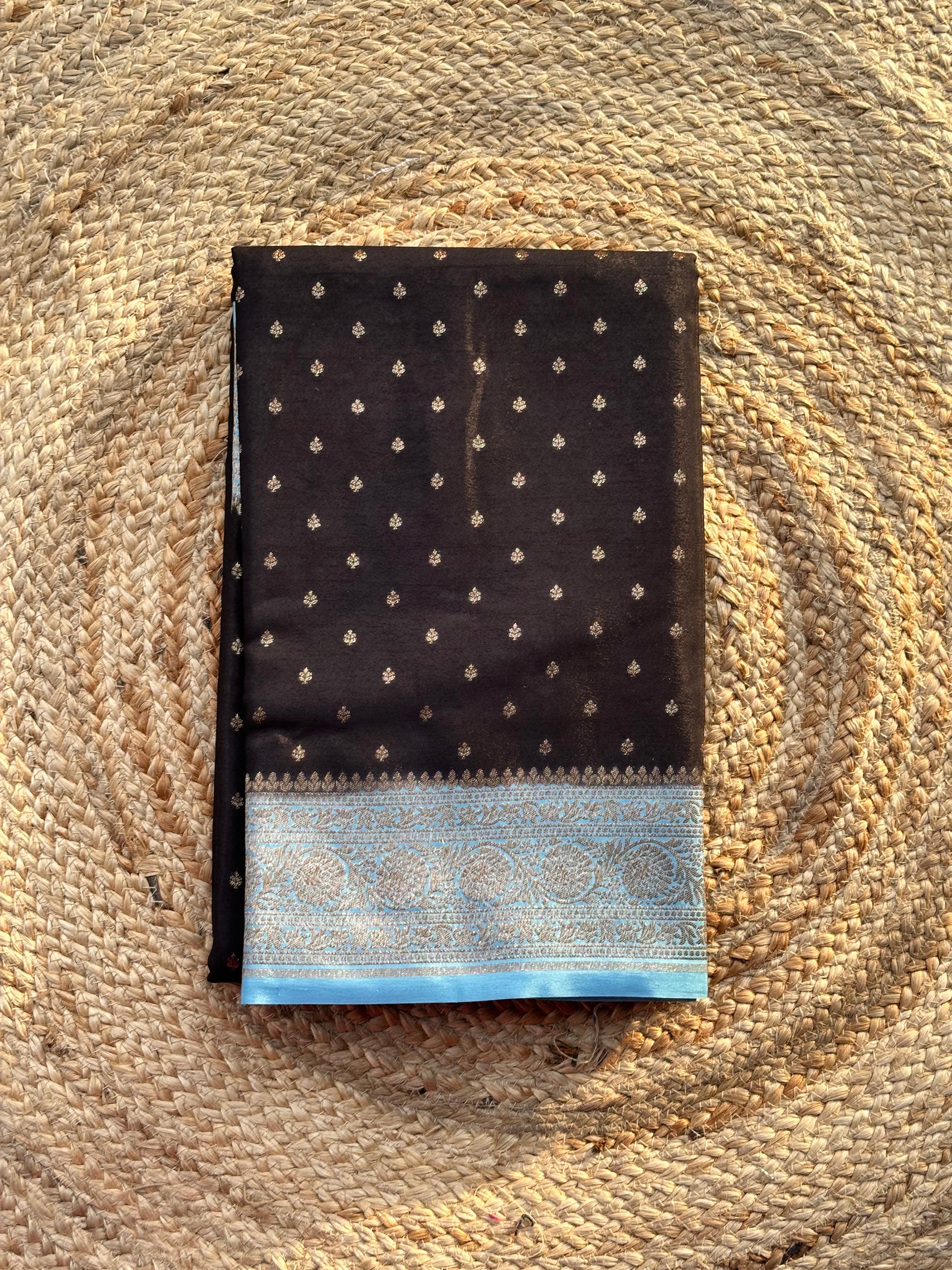 Black and sky blue Banarasi crepe chiffon sarees with brocade blouse