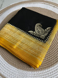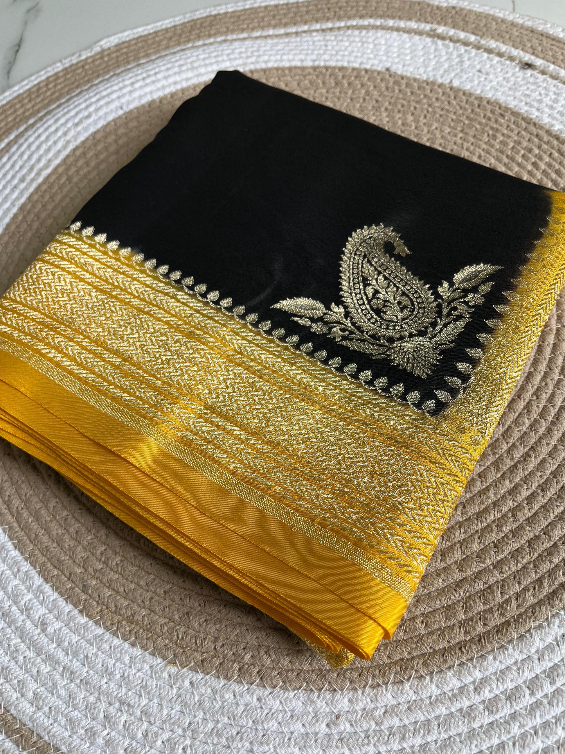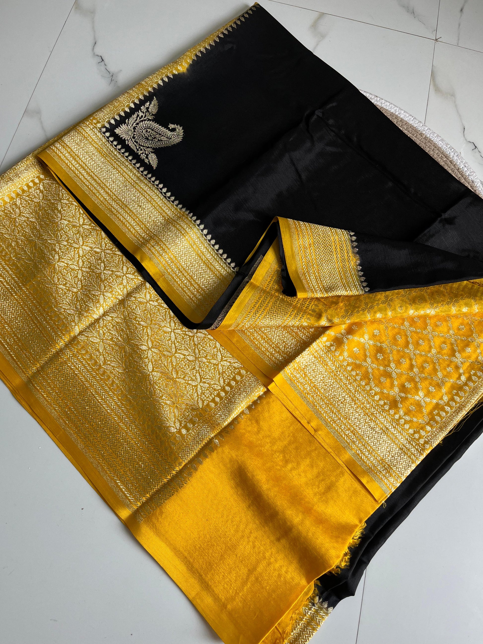 Black and yellow Banaras crepe chiffons sarees antique zari