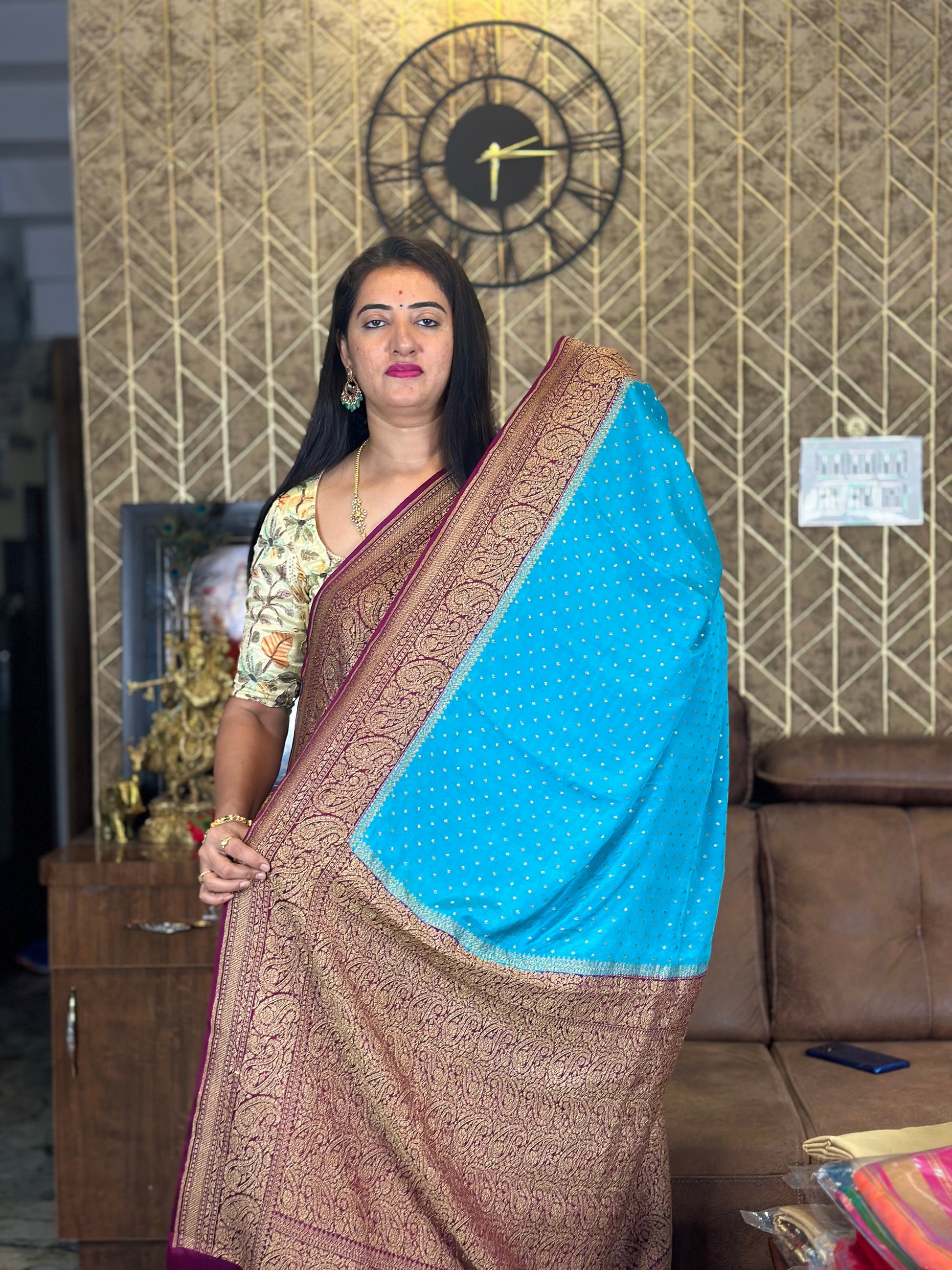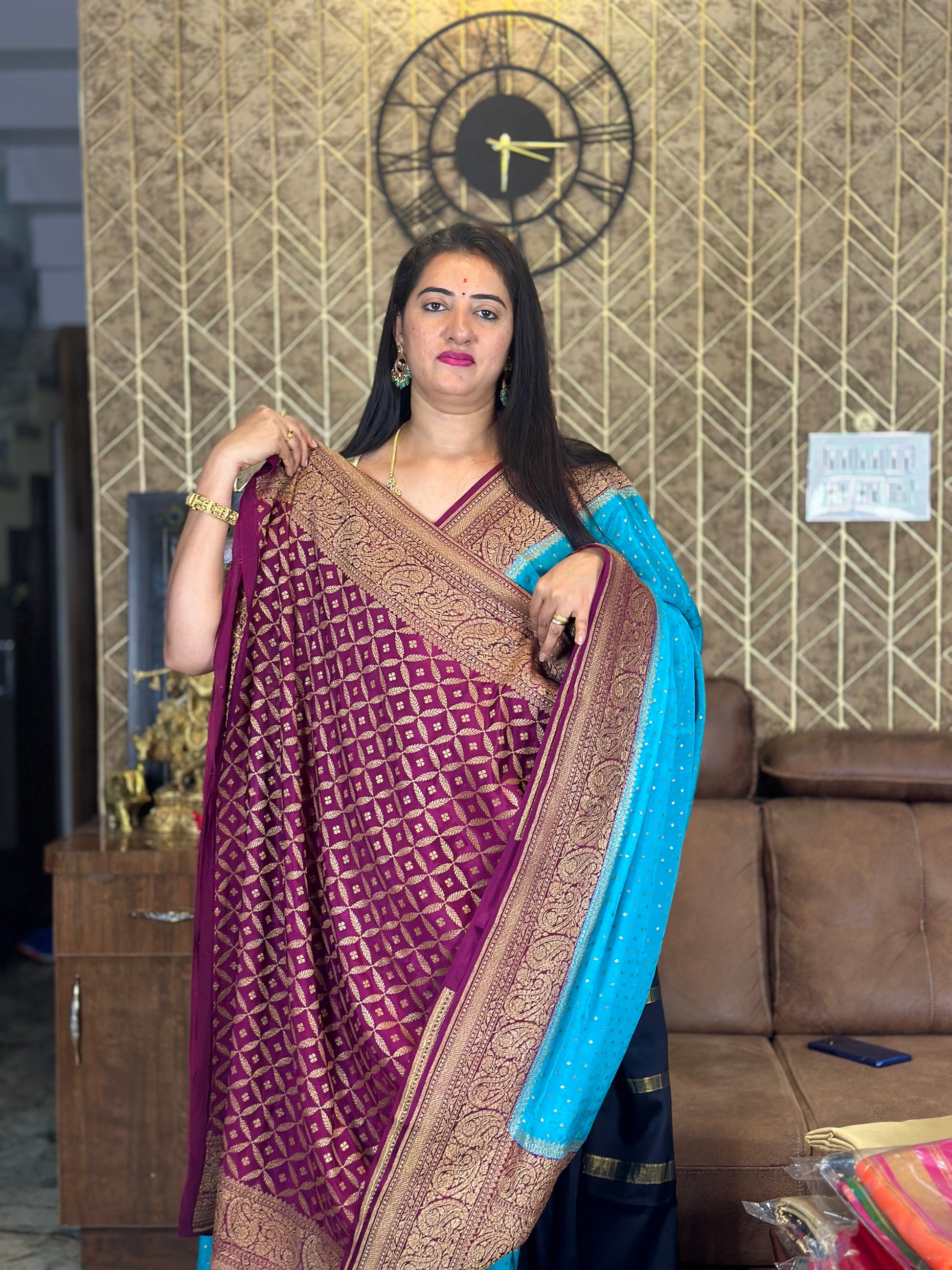 Blue with dark mejentha pure crepe Banaras silk sarees.
