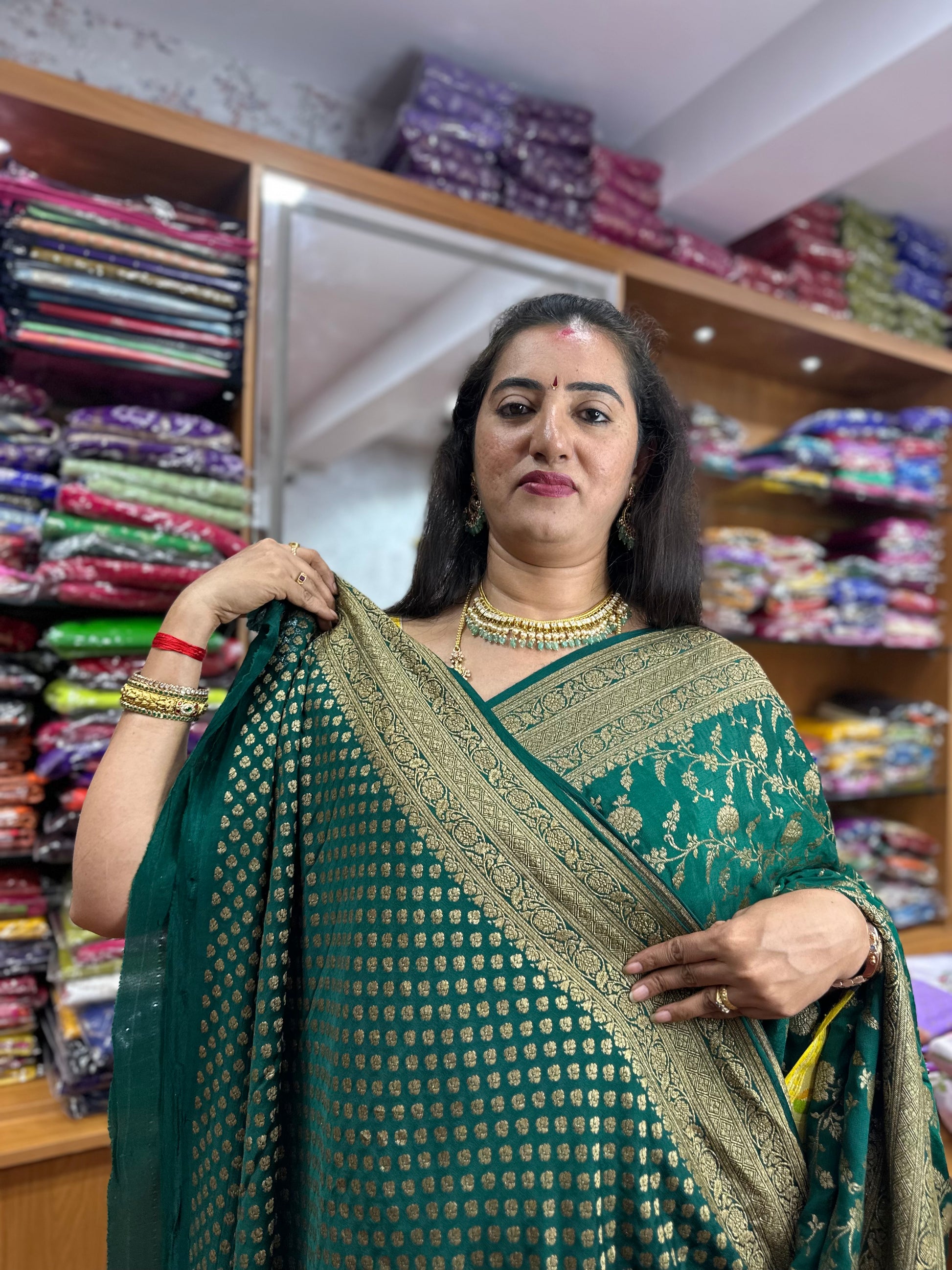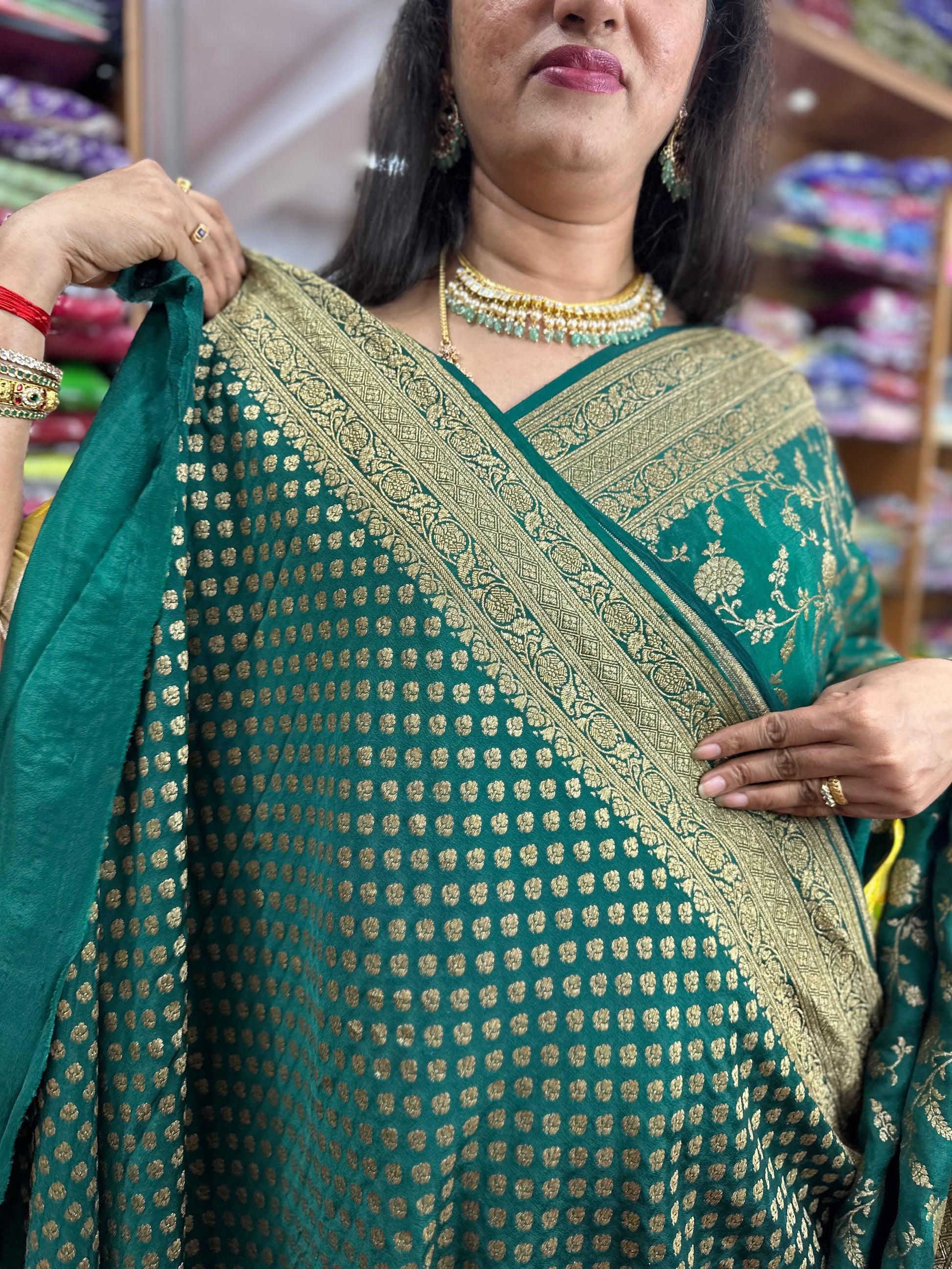 Dark green Pure crepe Banaras handwoven silk saree jaal pattern