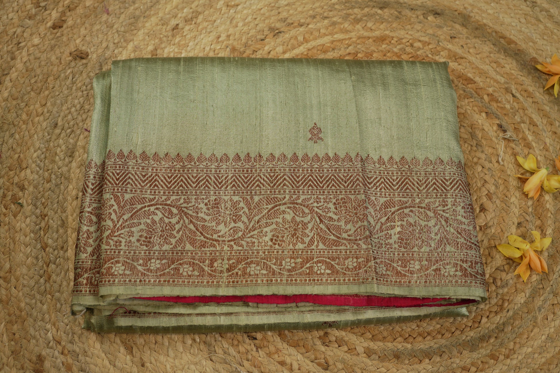 This elegant green saree is made from pure raw silk, providing a luxurious and timeless look. The natural sheen and texture of raw silk make it a versatile and comfortable choice for any occasion. Enhance your wardrobe with this high-quality and stylish saree