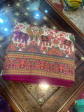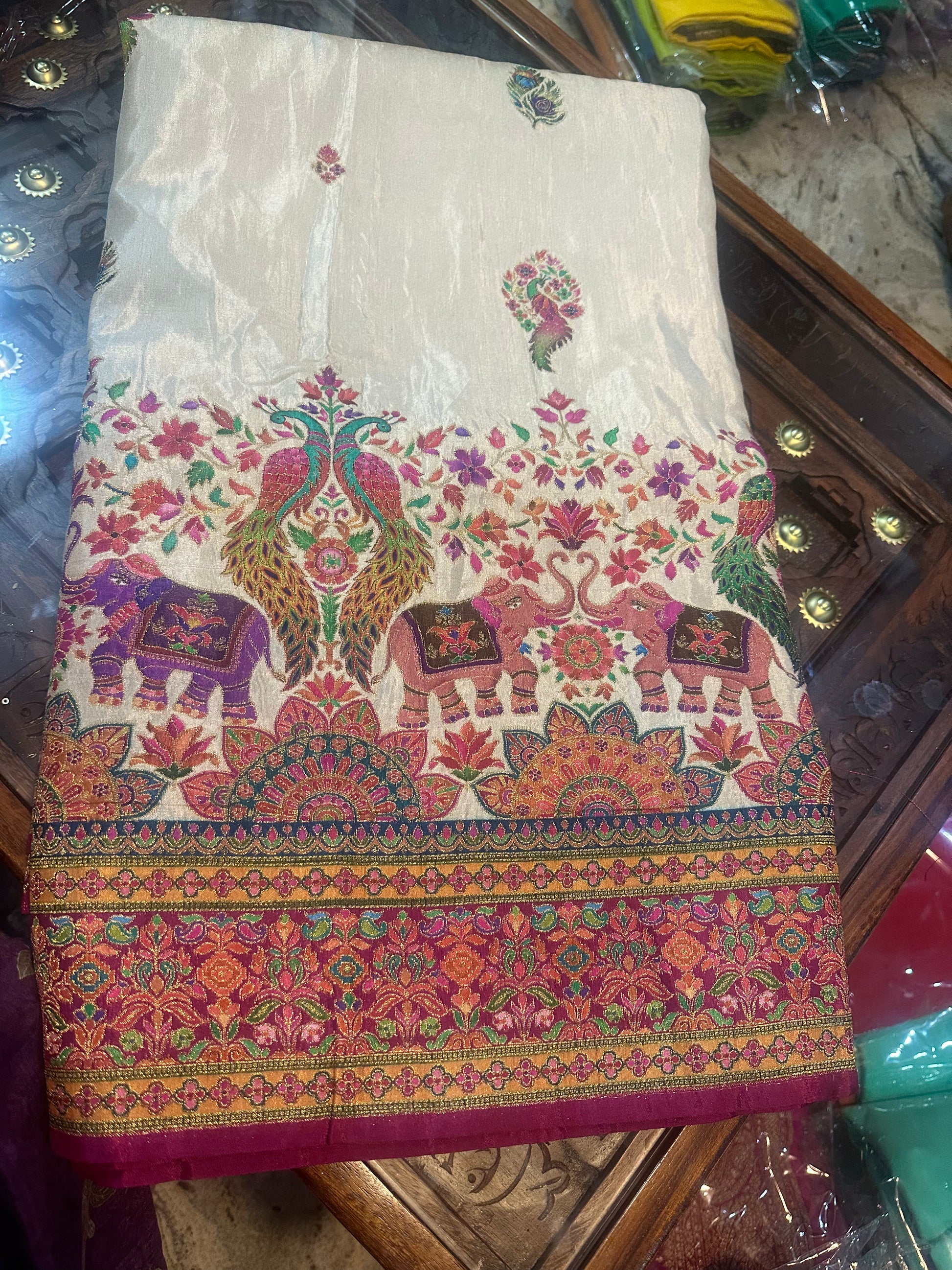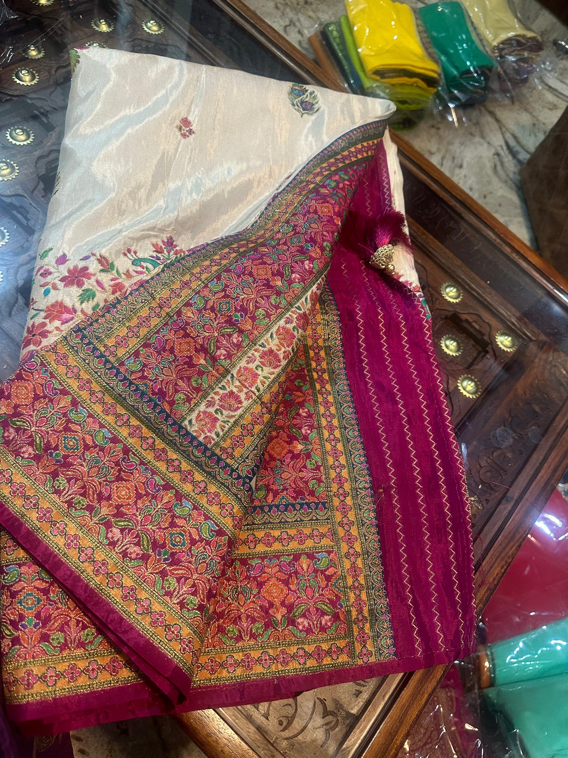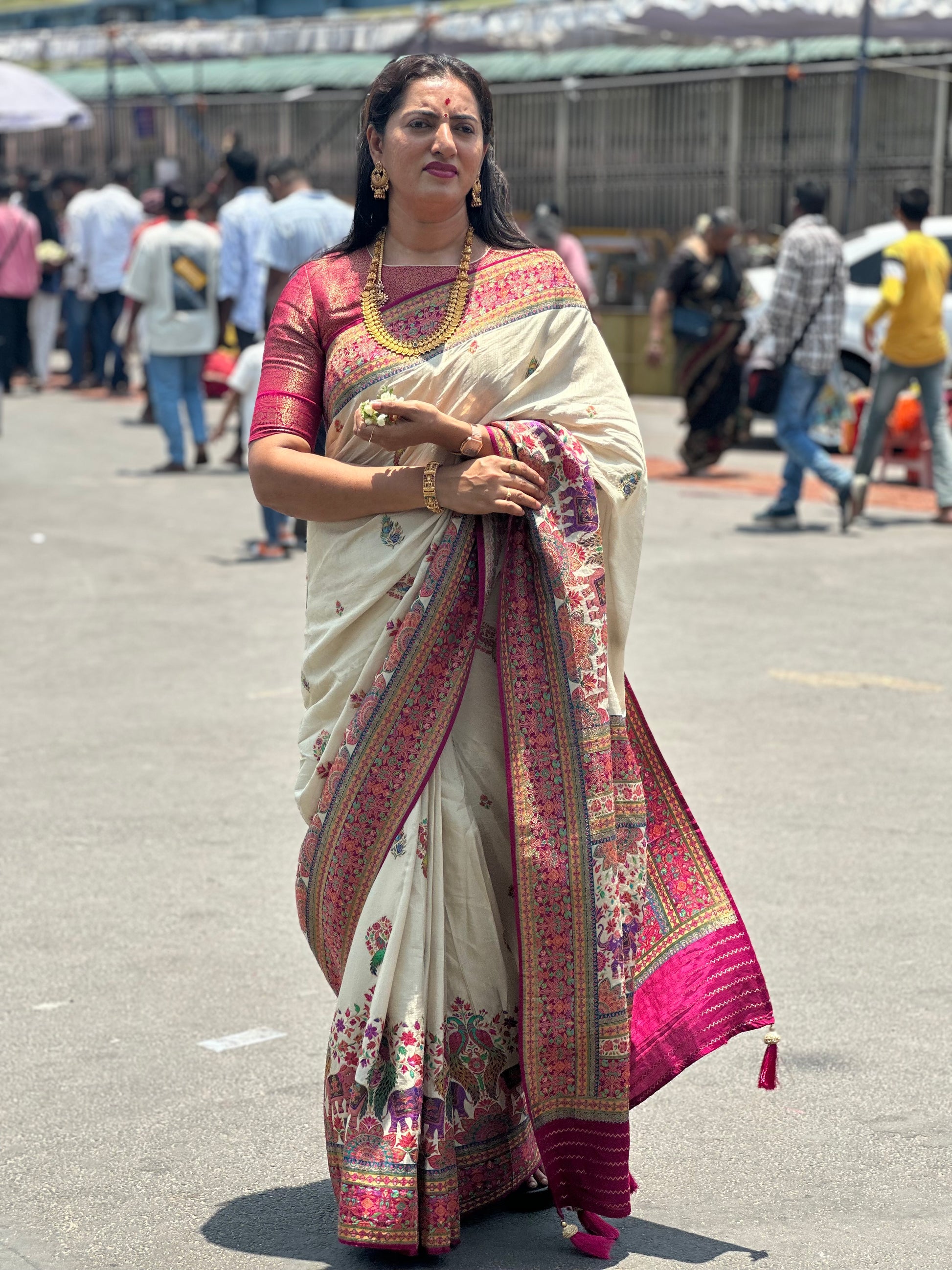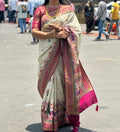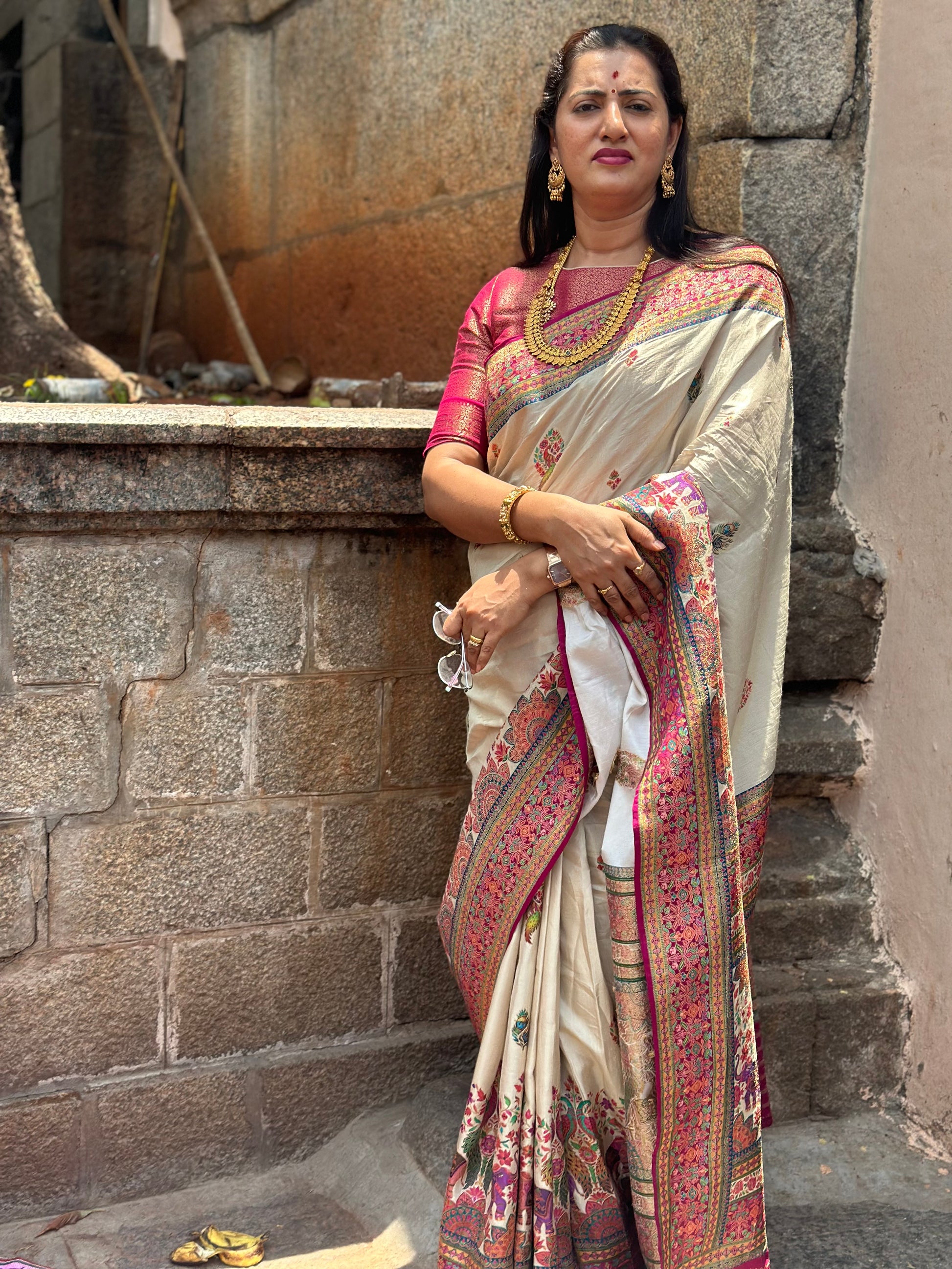 Half white pure moonga crepe with Kashmiri weaving. Pink Brocade blouse.