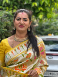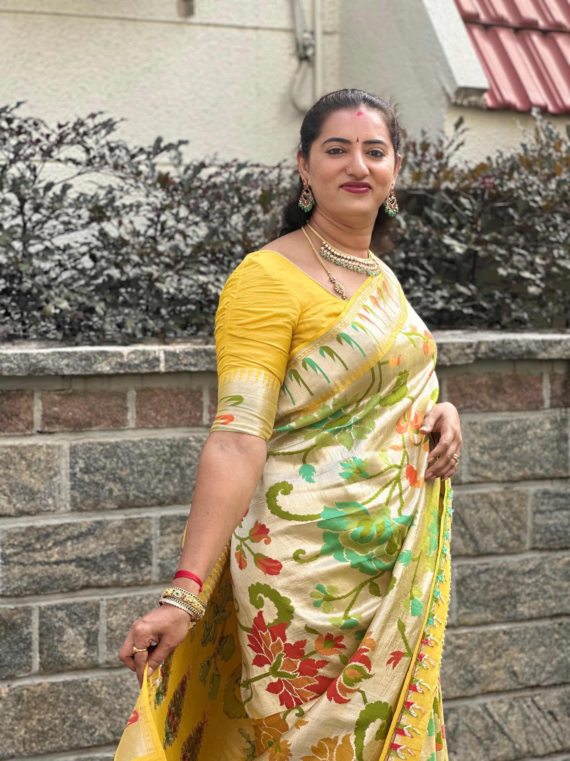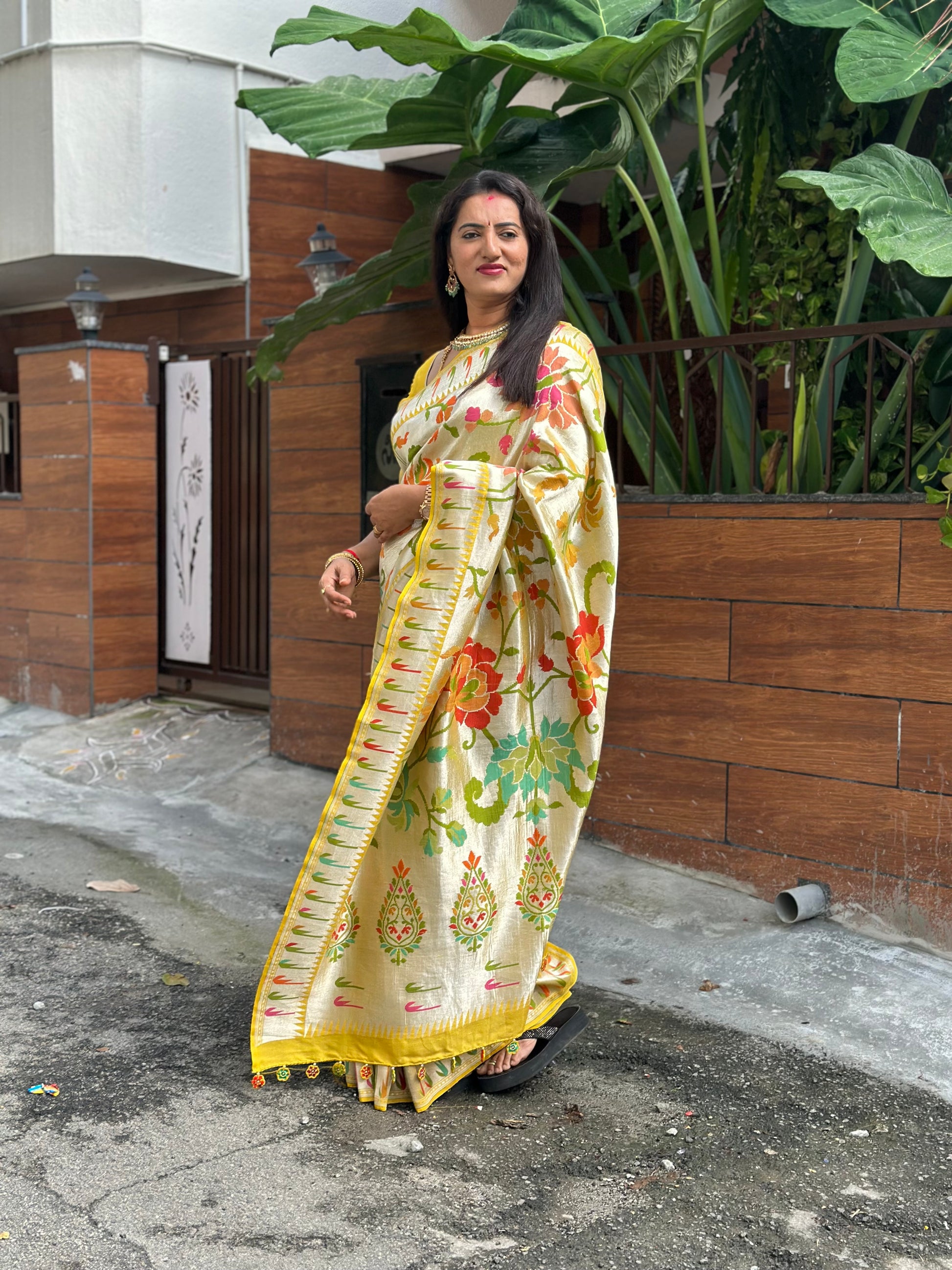 Lemon yellow pure tusser tissue georgette with Paithani weaving muniya border.