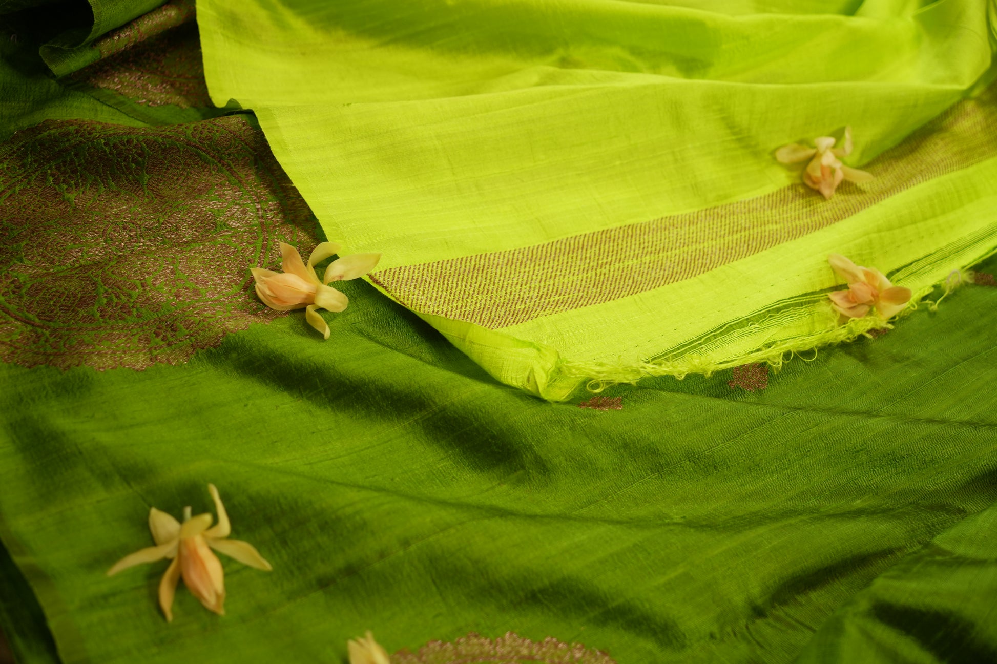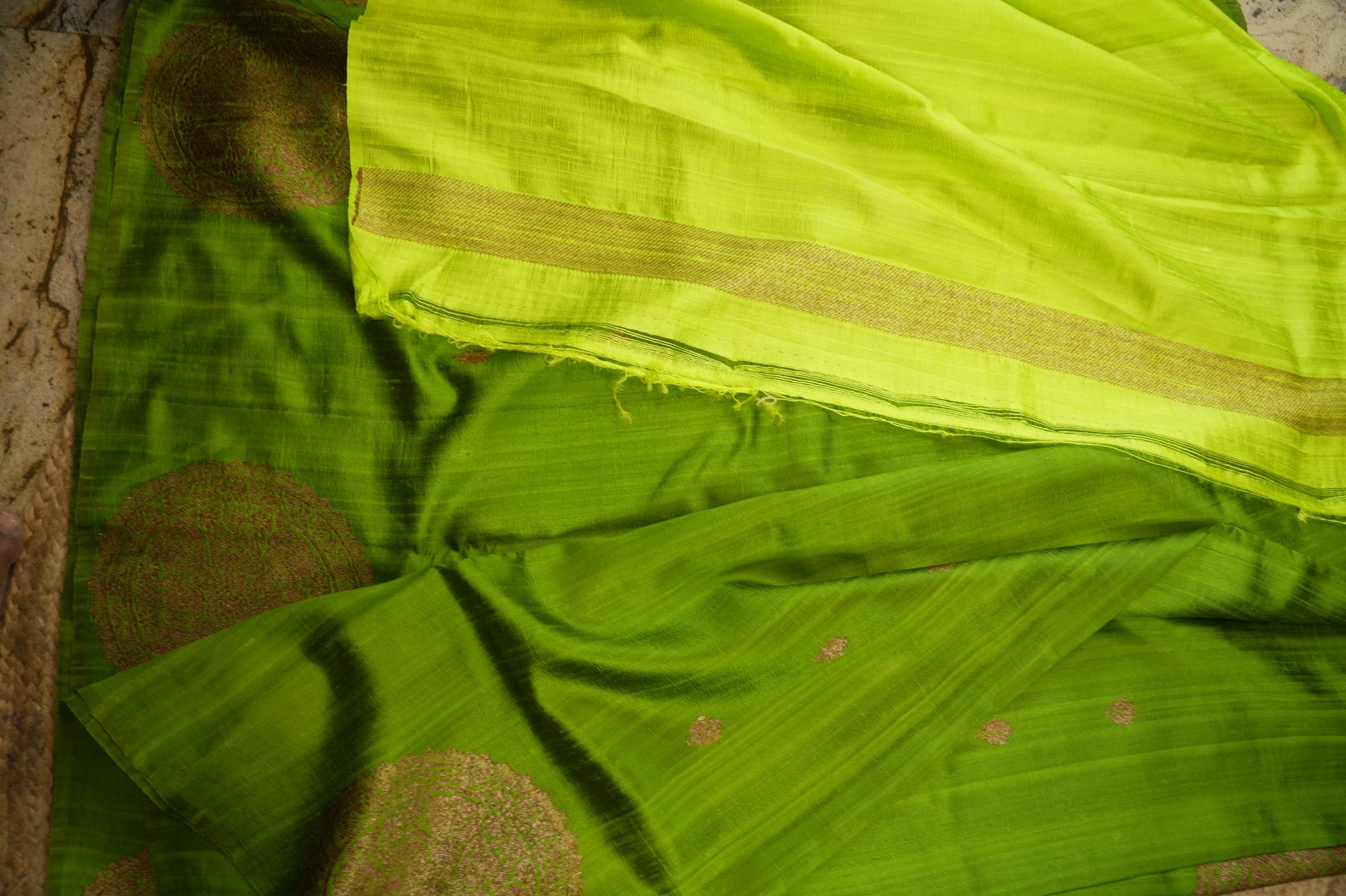 This light green pure raw silk saree showcases a stunning combination of purple and yellow. Made from high-quality raw silk, this saree exudes a luxurious and elegant look perfect for special occasions. Trust in its pure and raw silk material for a comfortable and classy wear.