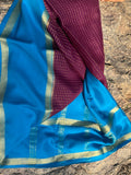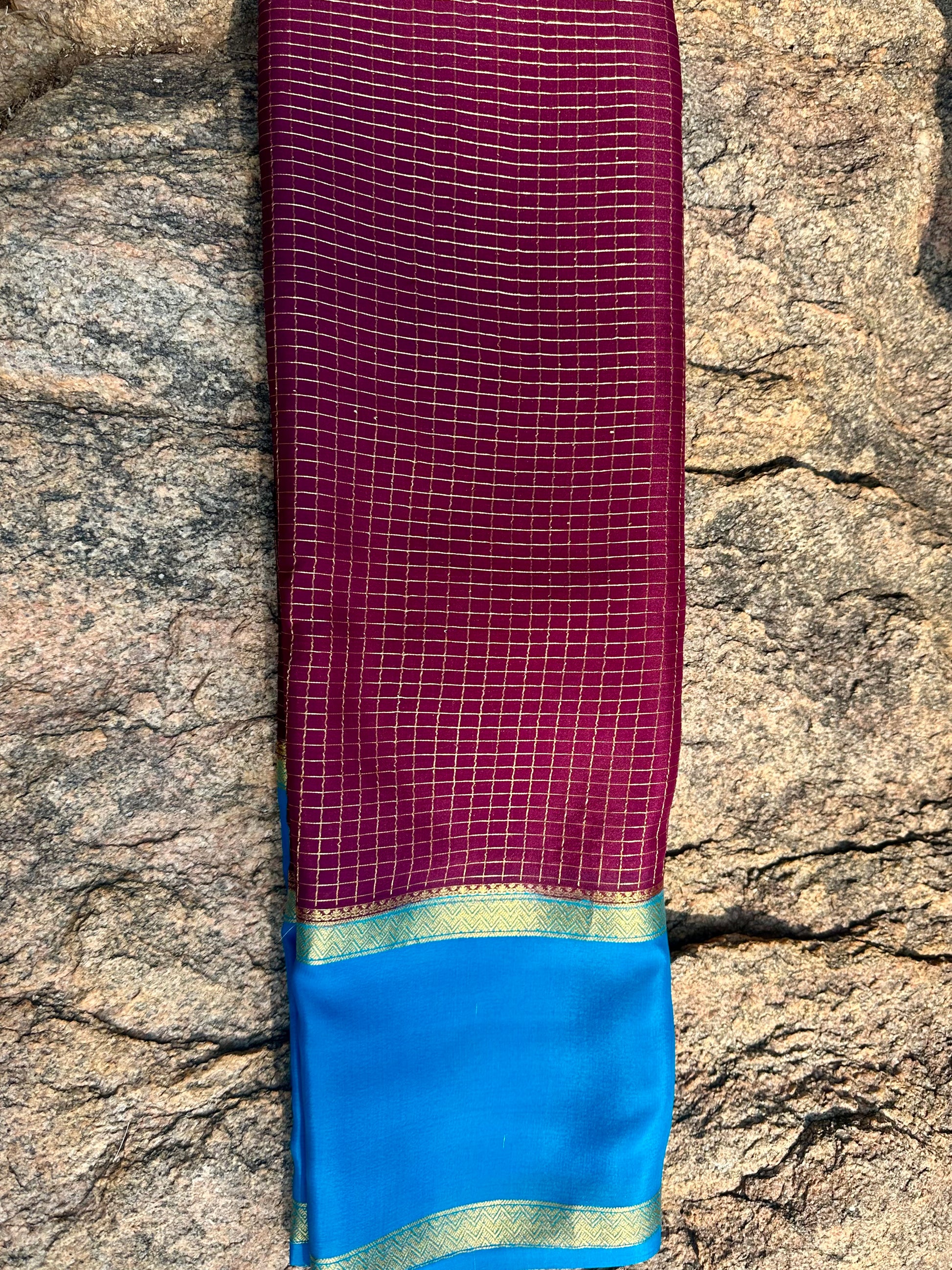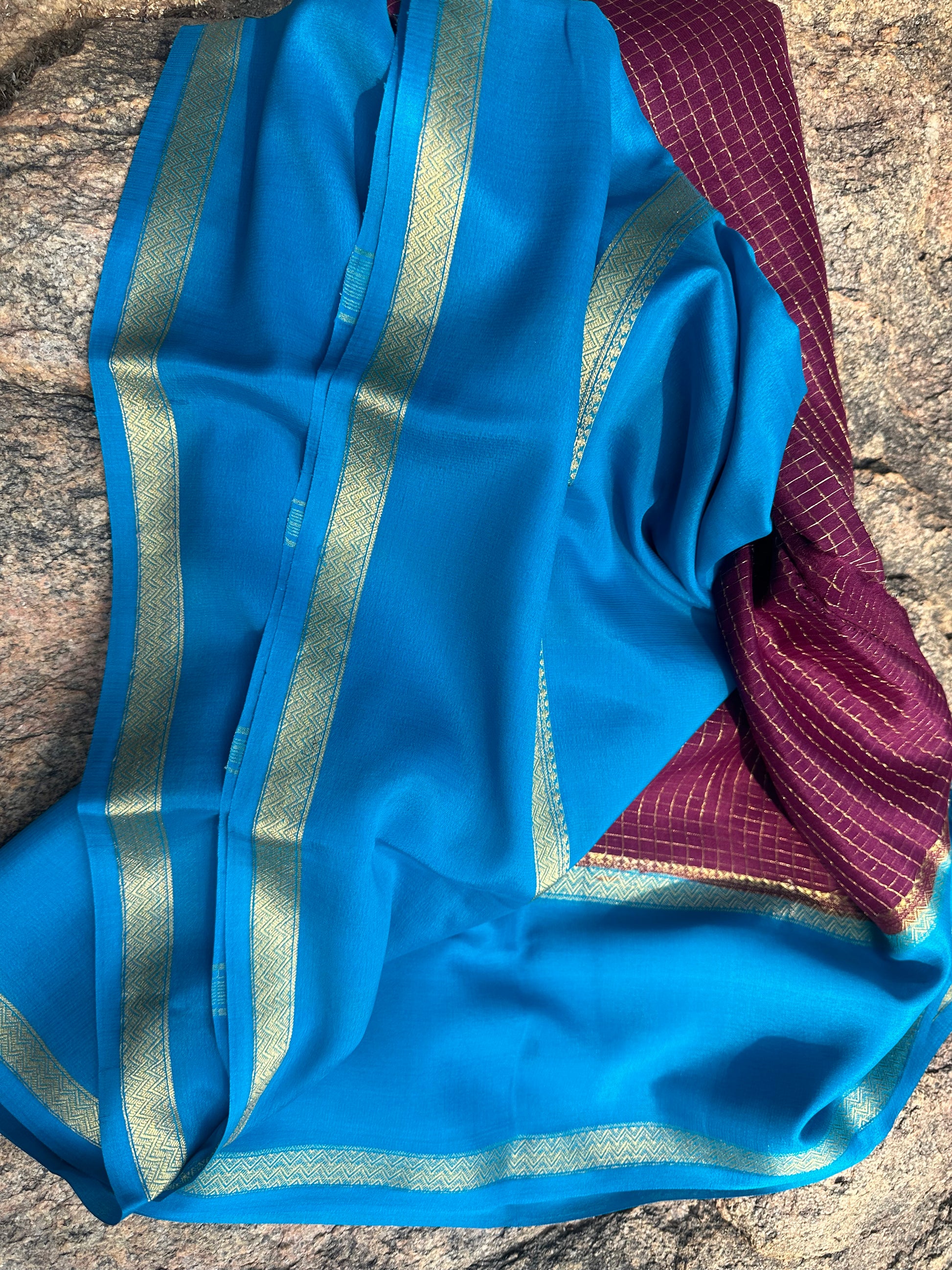 Mejentha with sky blue, Mysore Silk crepe checks with bentex border. 70 grams thickness.