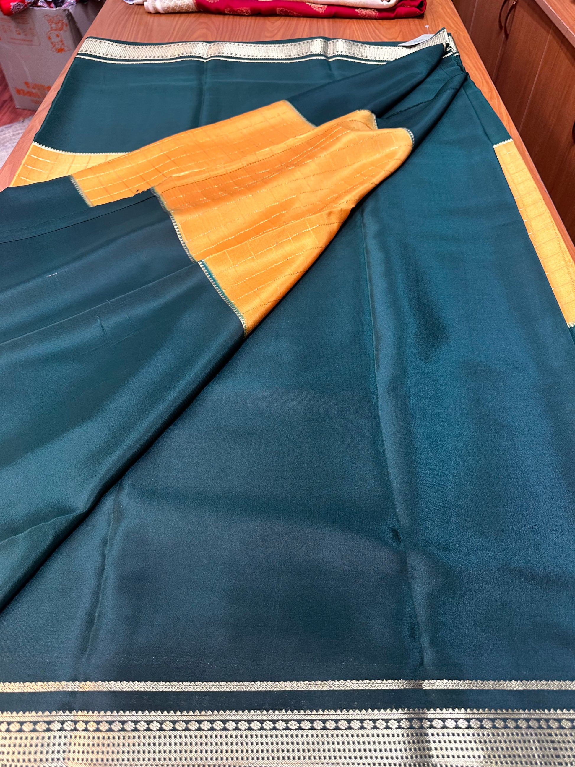 Mustard and bottle green pure crepe Mysore Silk 120 gsm