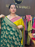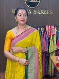 Mustard and green pink, pure crepe Banaras silk sarees.