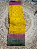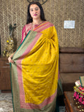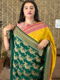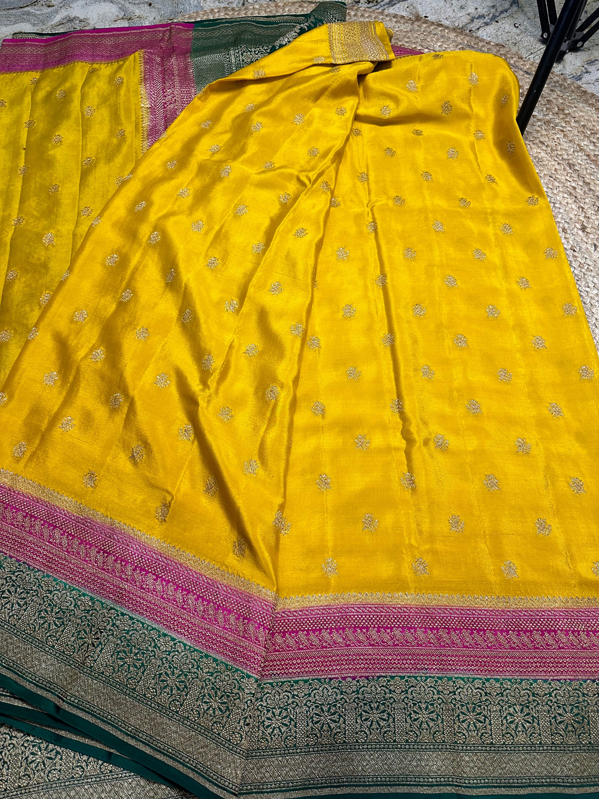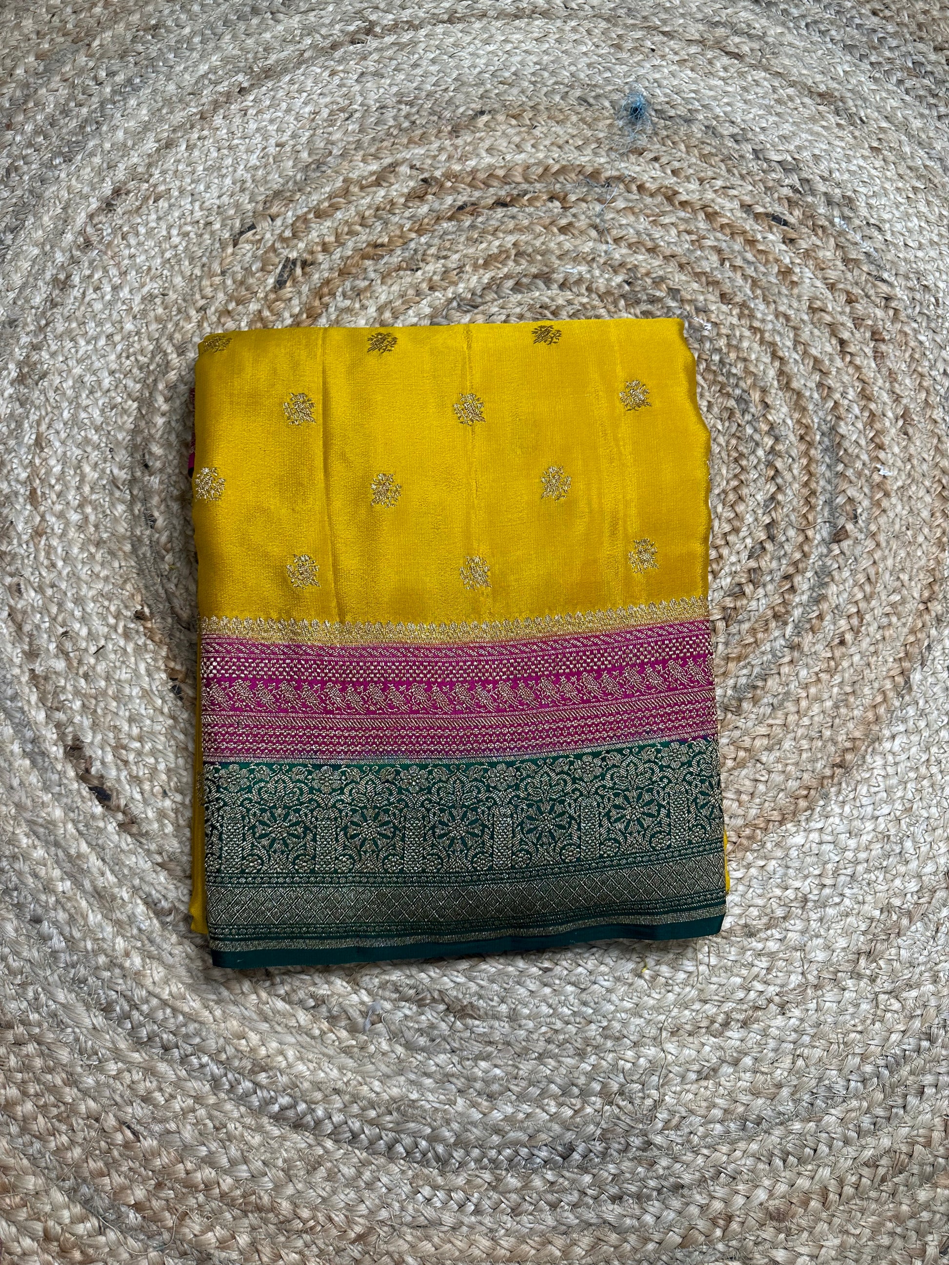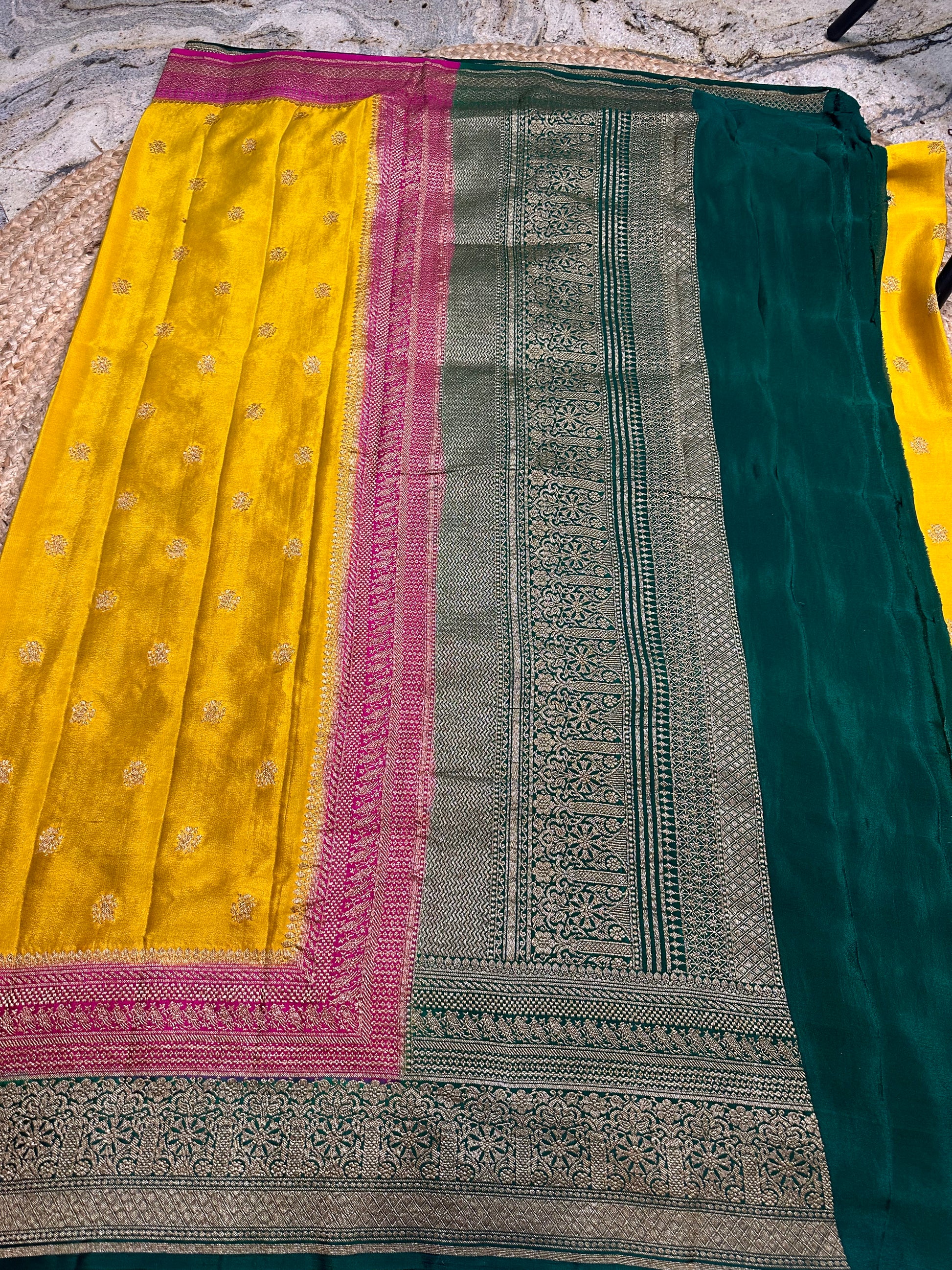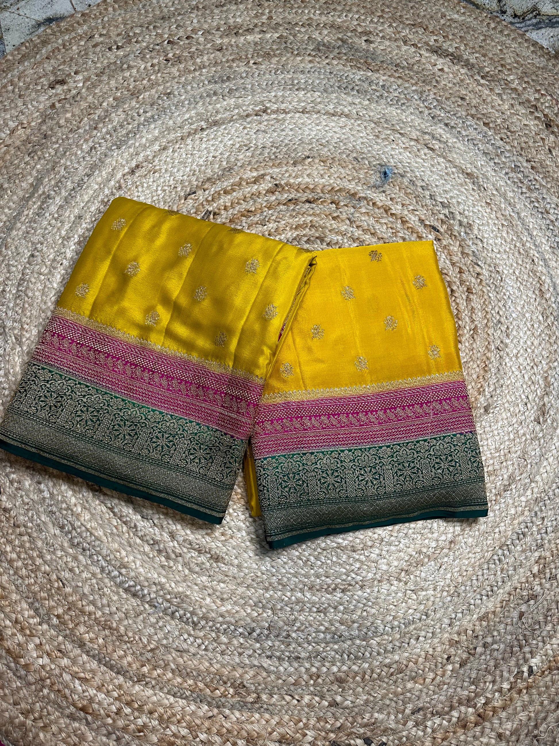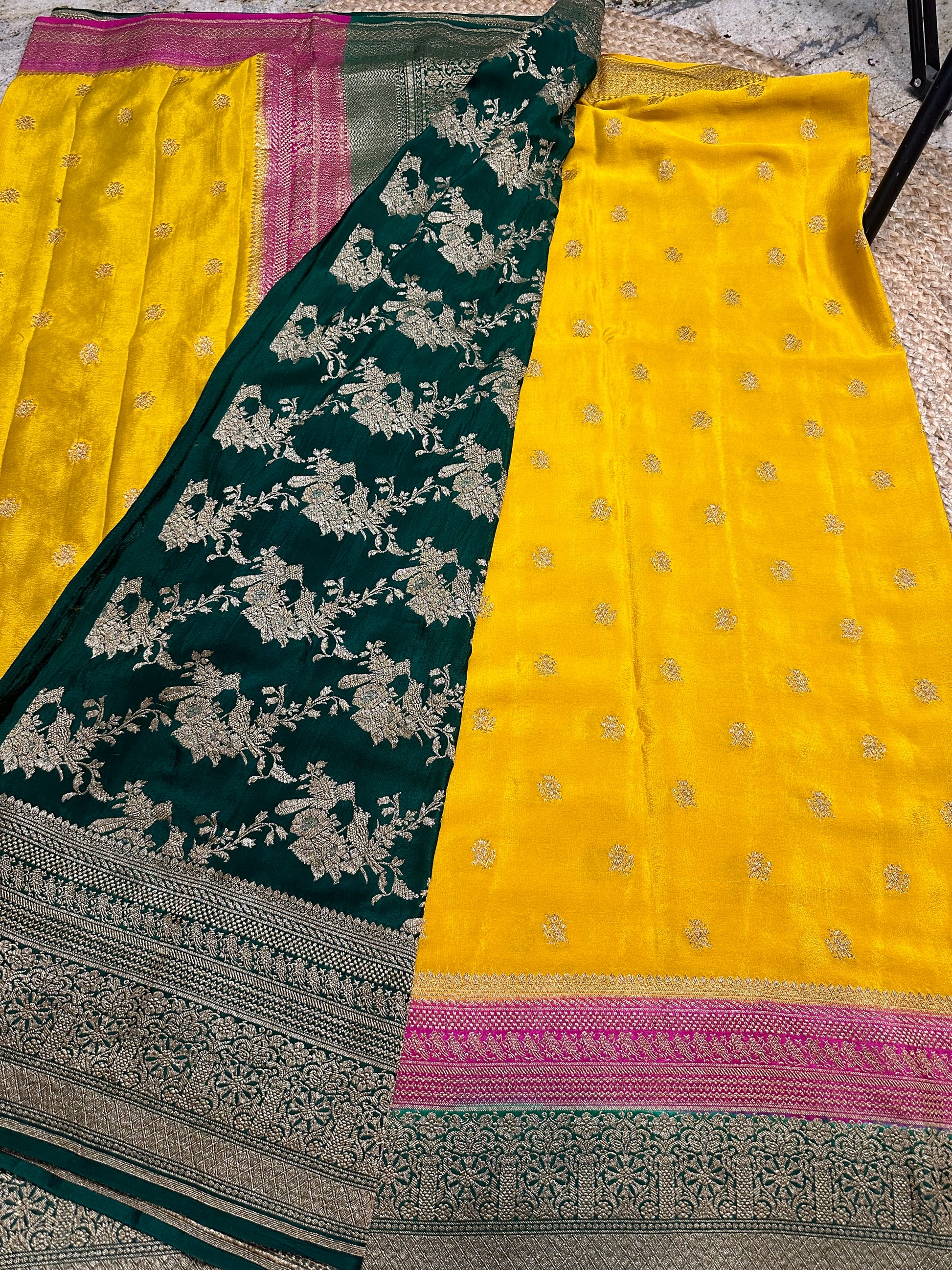 Mustard pink and green, pure crepe Banaras silk sarees.
