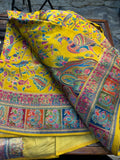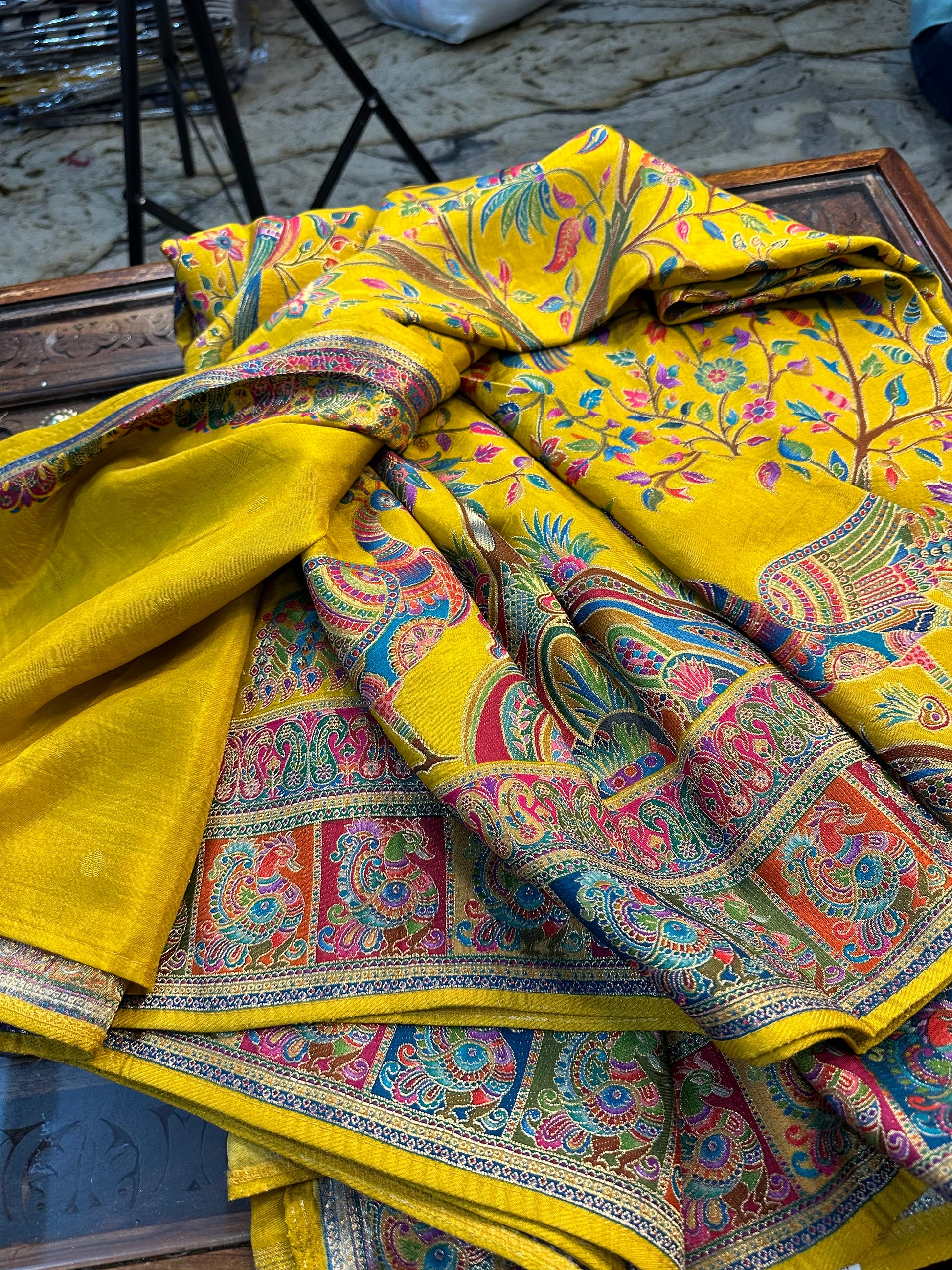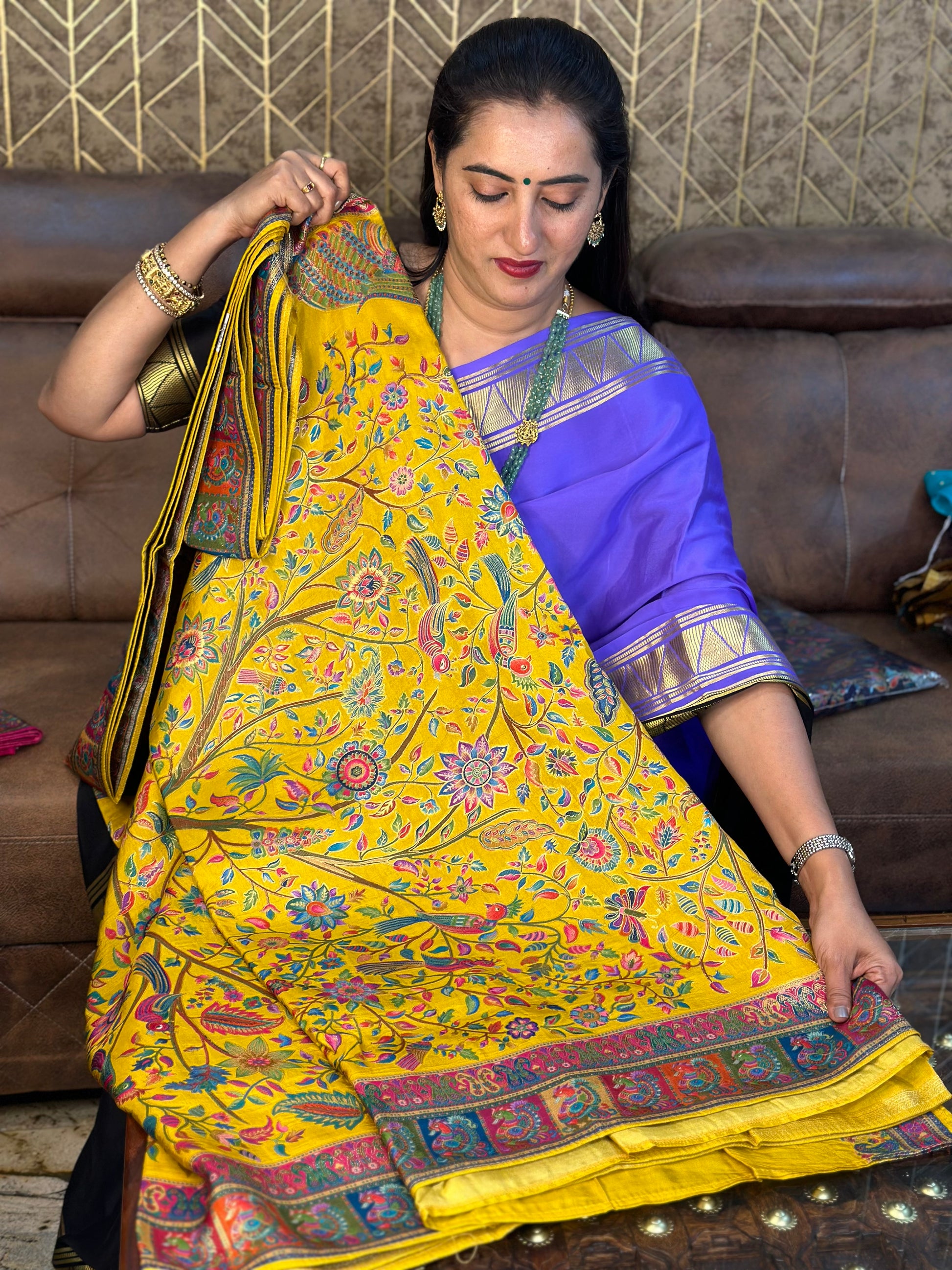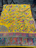 Mustard pure moonga crepe Kashmiri work all over the body.