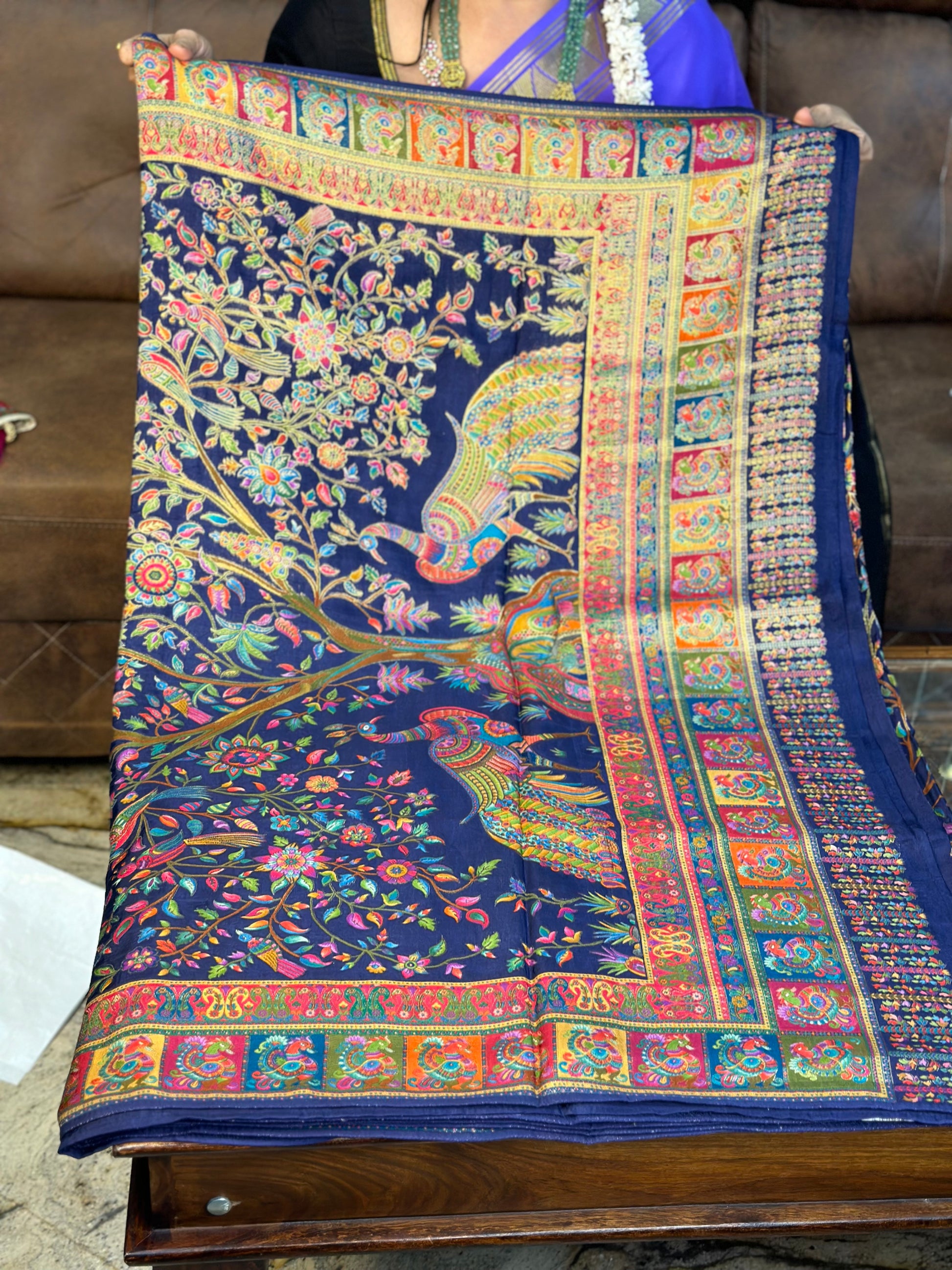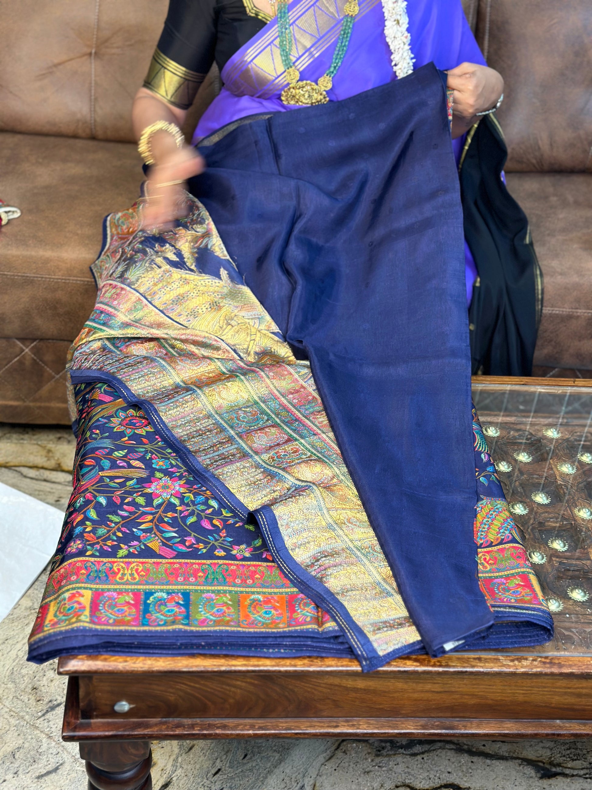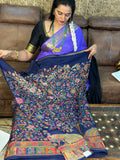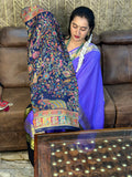 Navy blue pure moonga crepe saree with Kashmiri work all over the body.