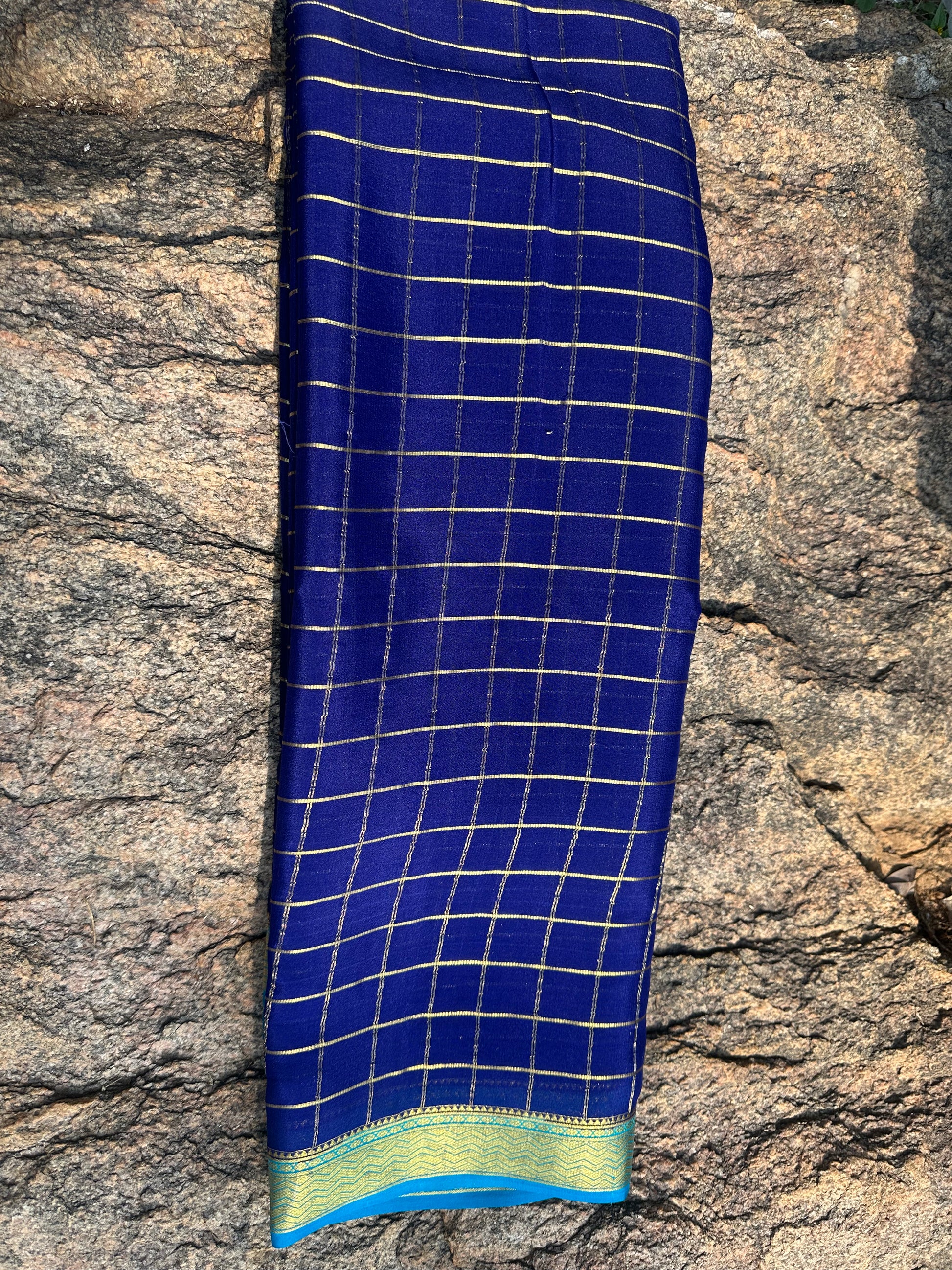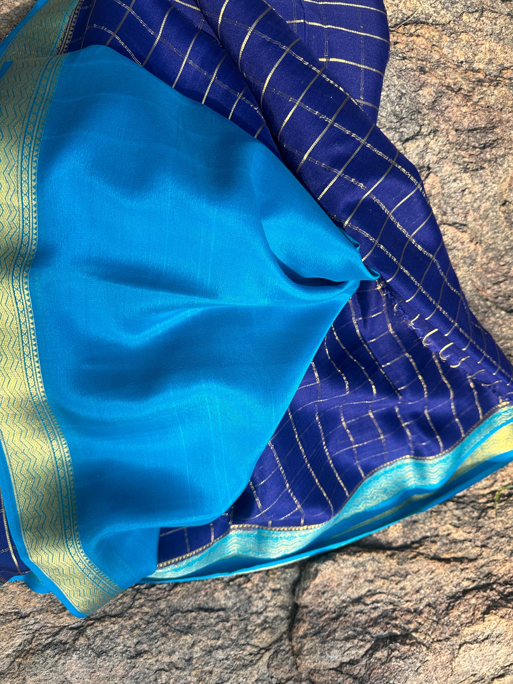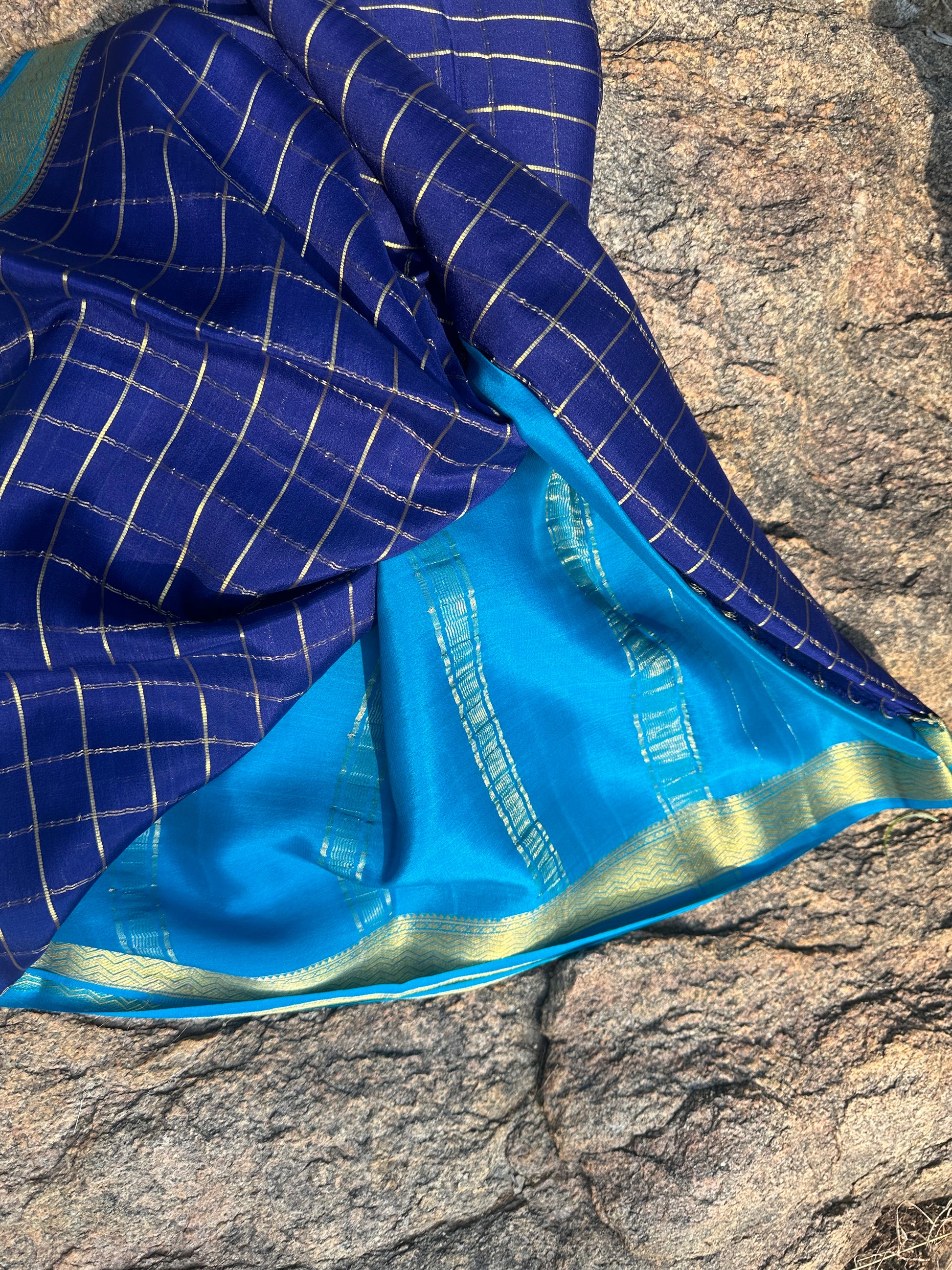 Navy blue with sky blue Mysore Silk crepe checks all over the body with contrast border. 75 grams thickness.