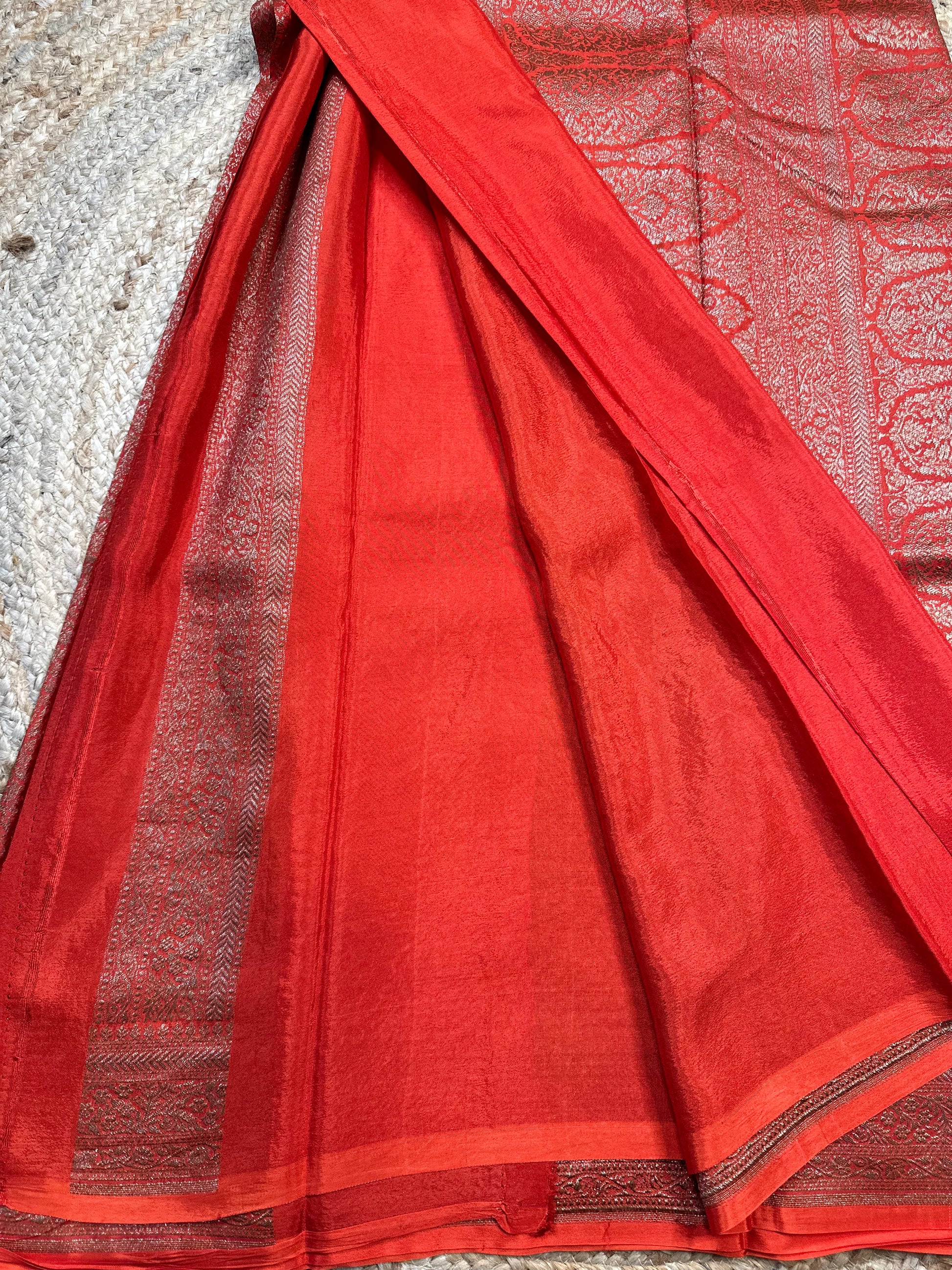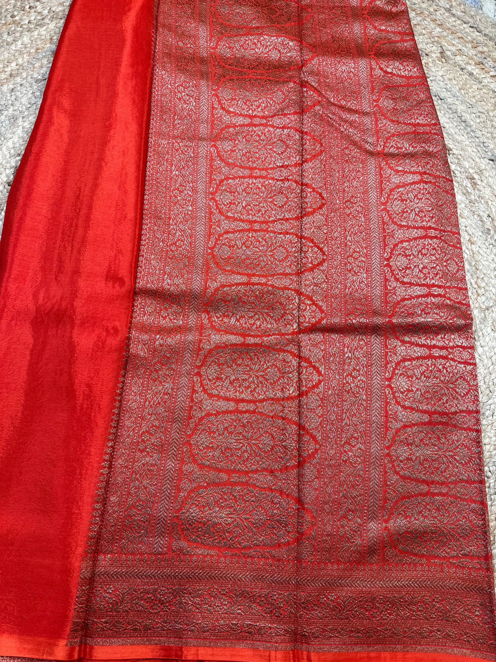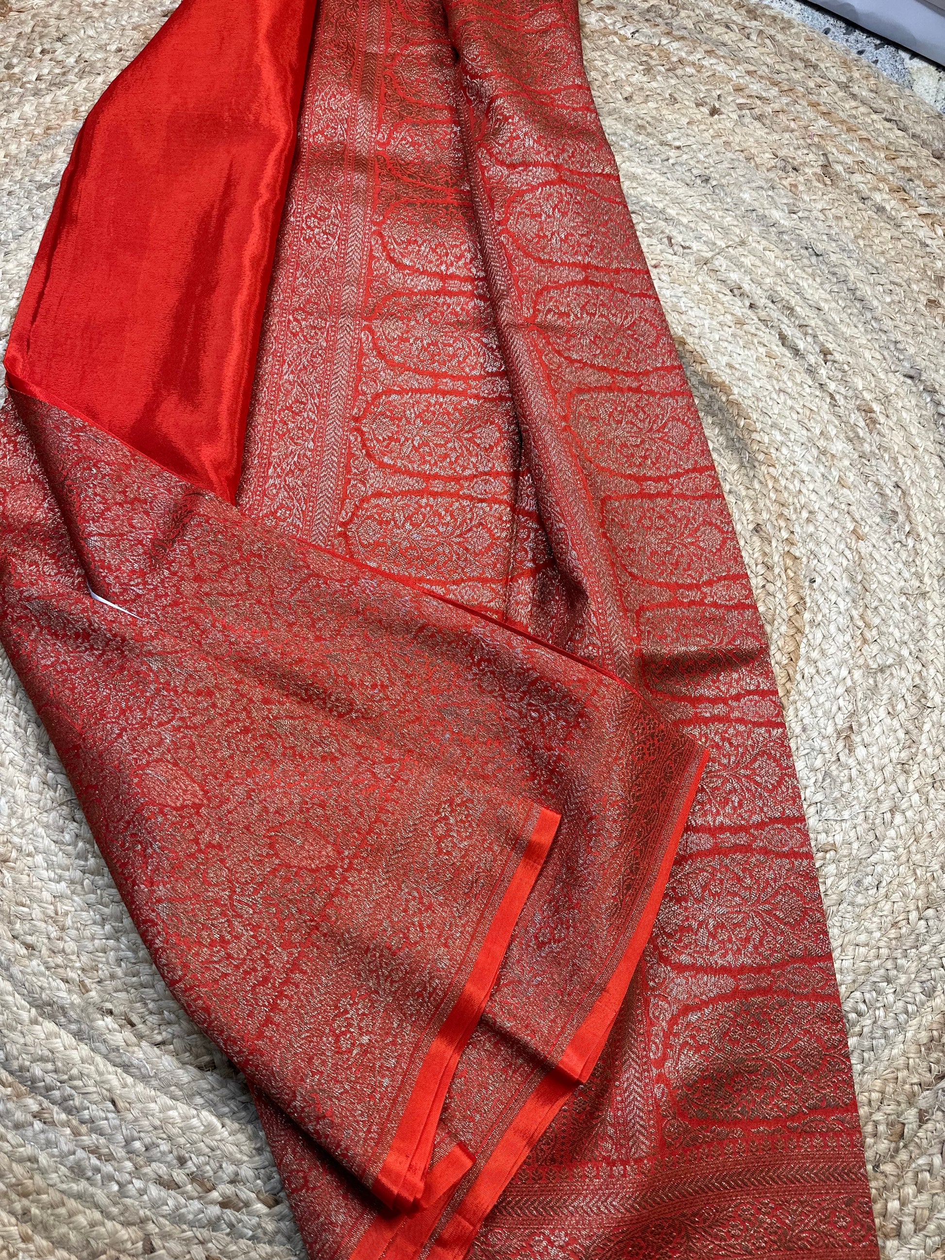 Orange brocade crepe chiffon sarees.