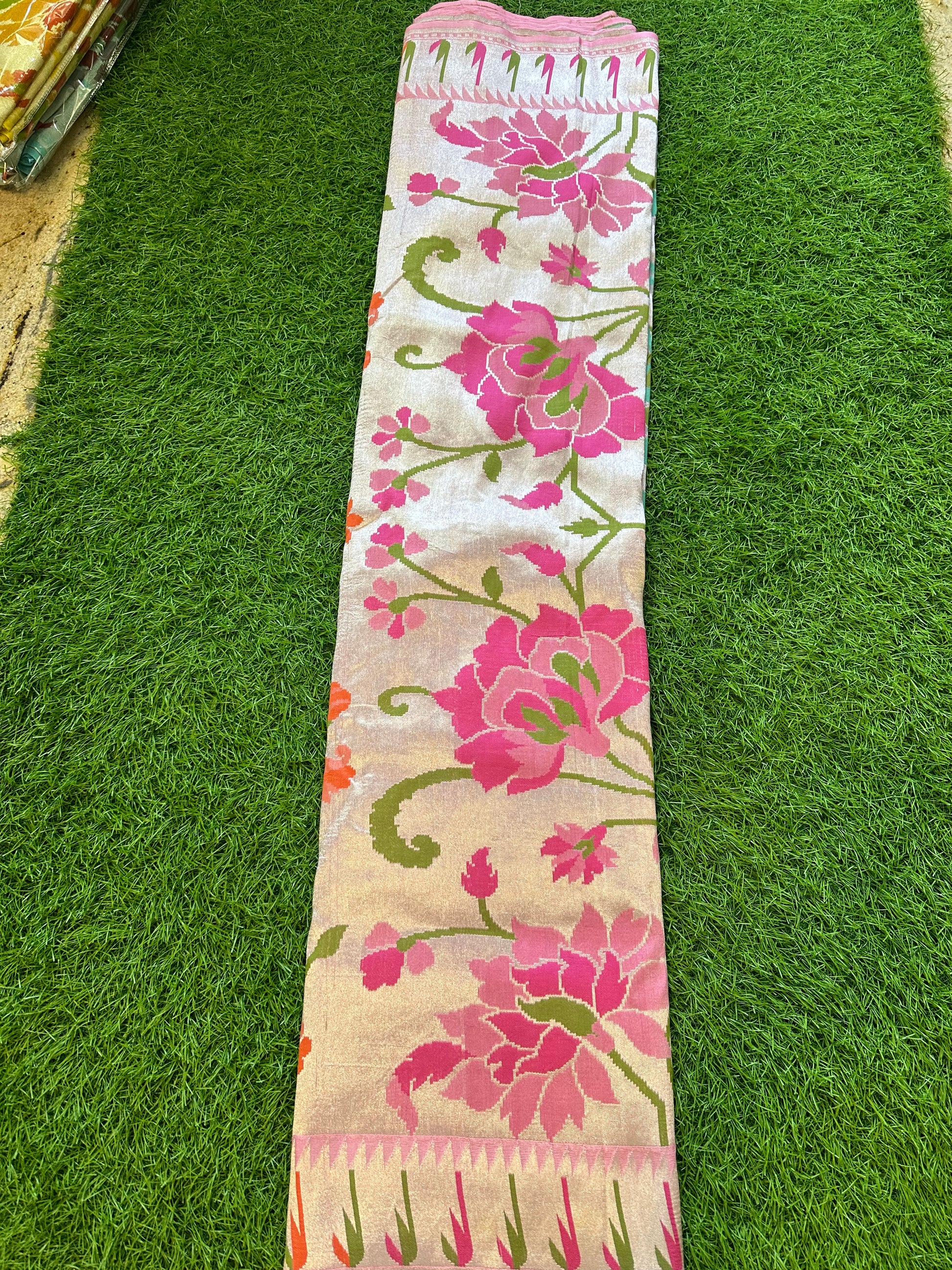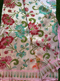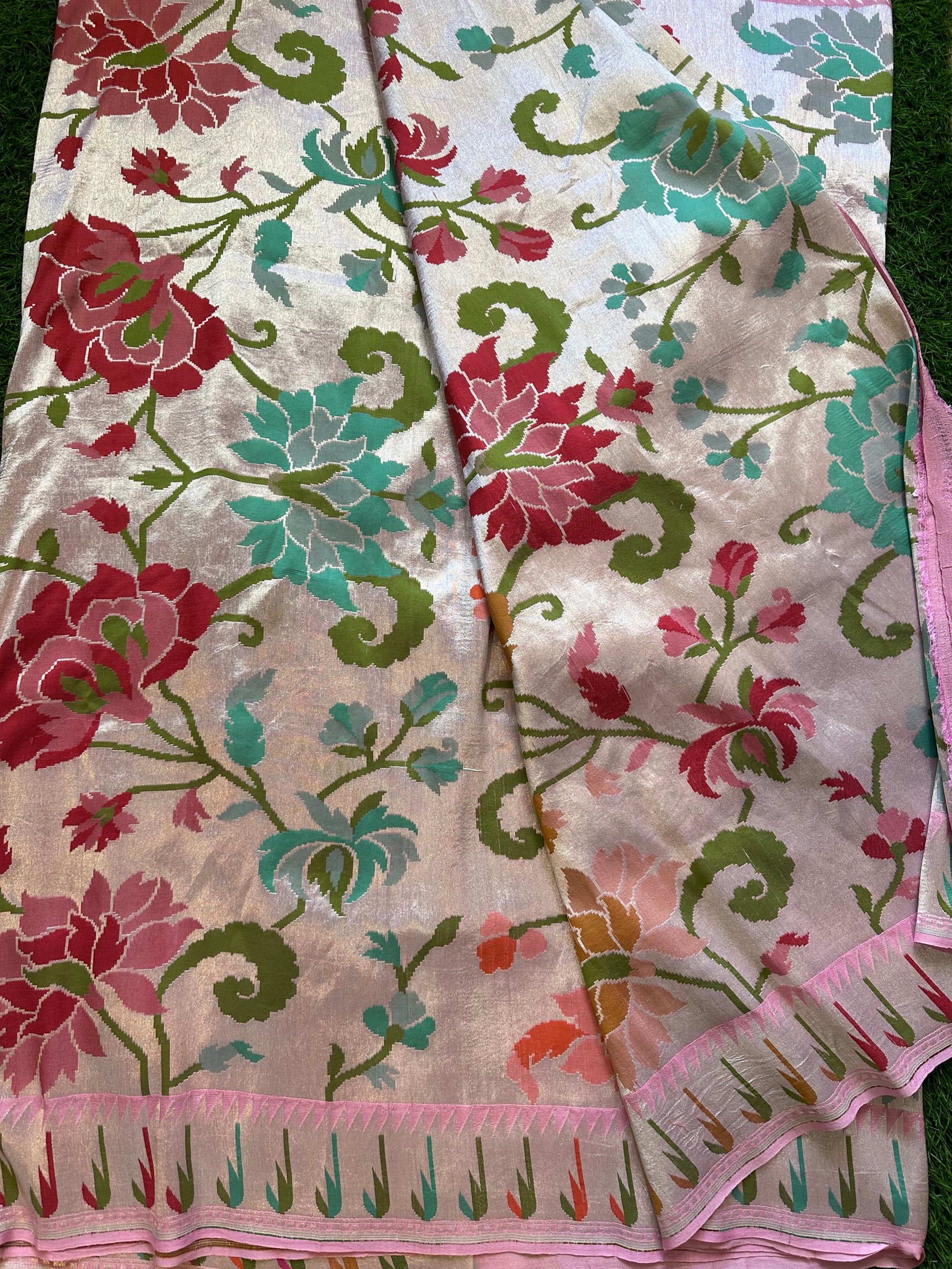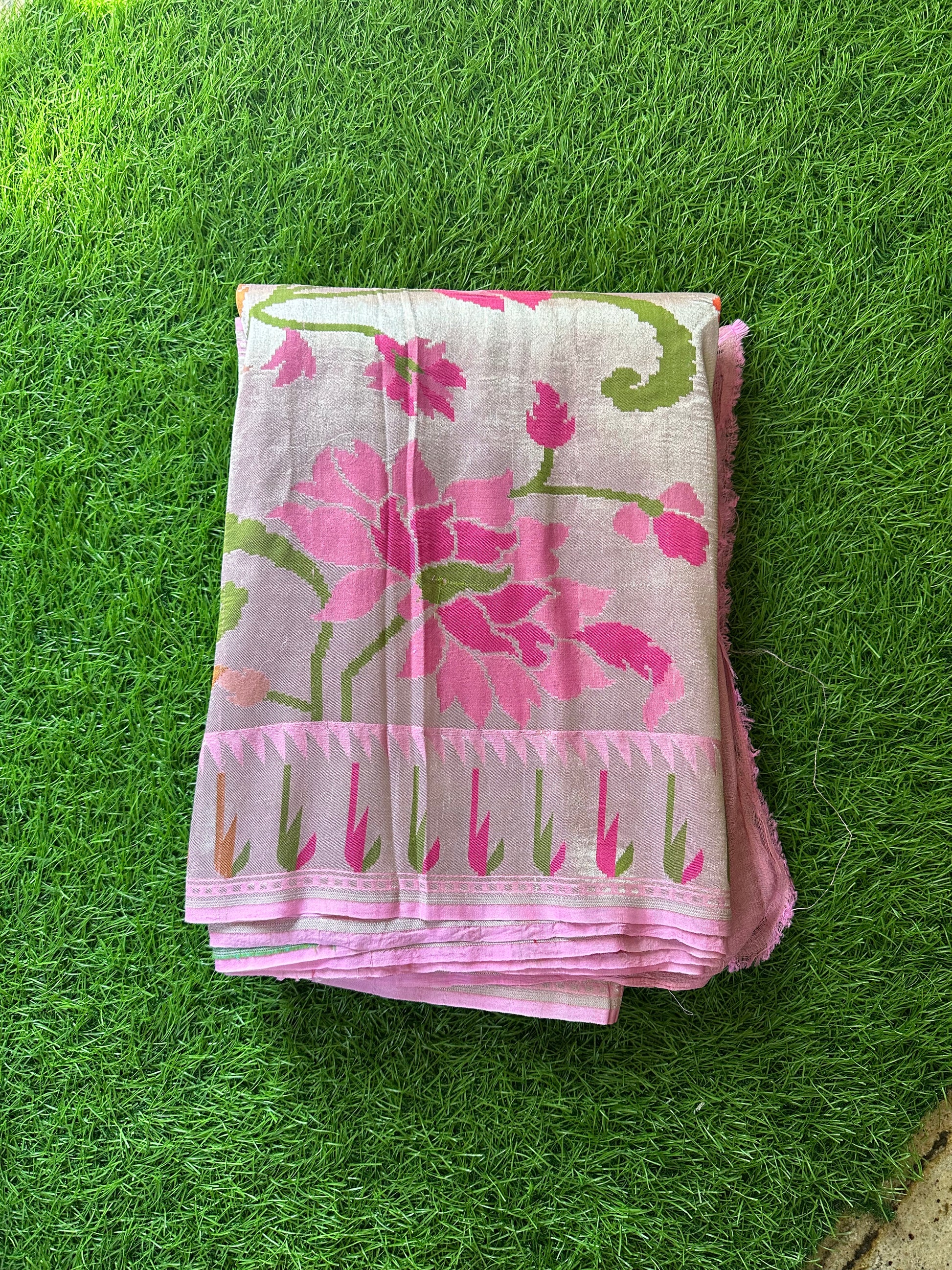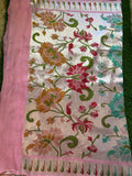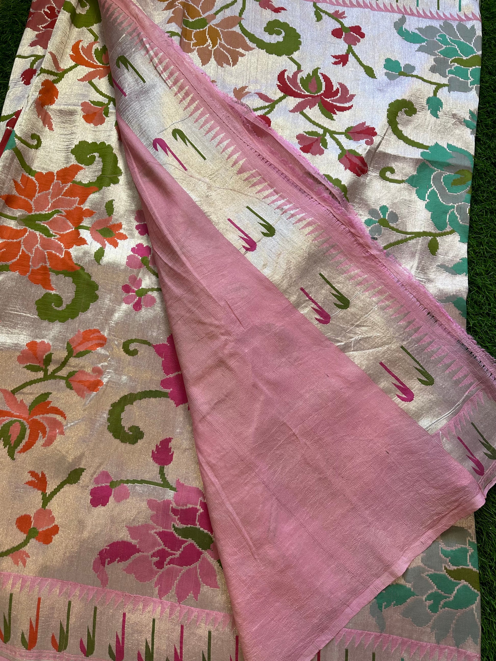 Pastel pink pure tusser tissue georgette with Paithani weaving muniya border.