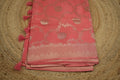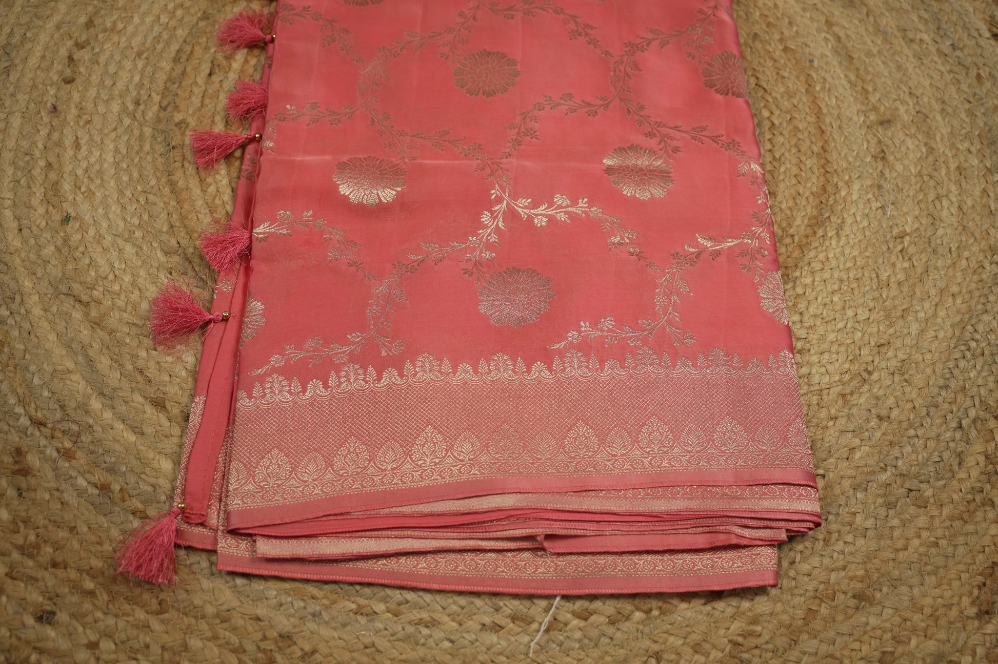 This peach pure satin silk has a beautiful jaal pattern that adds elegance and luxury to any outfit. Made from pure silk, it is soft and smooth on the skin, offering a comfortable and luxurious feel. Perfect for formal occasions, this unique fabric is sure to make a statement.