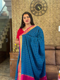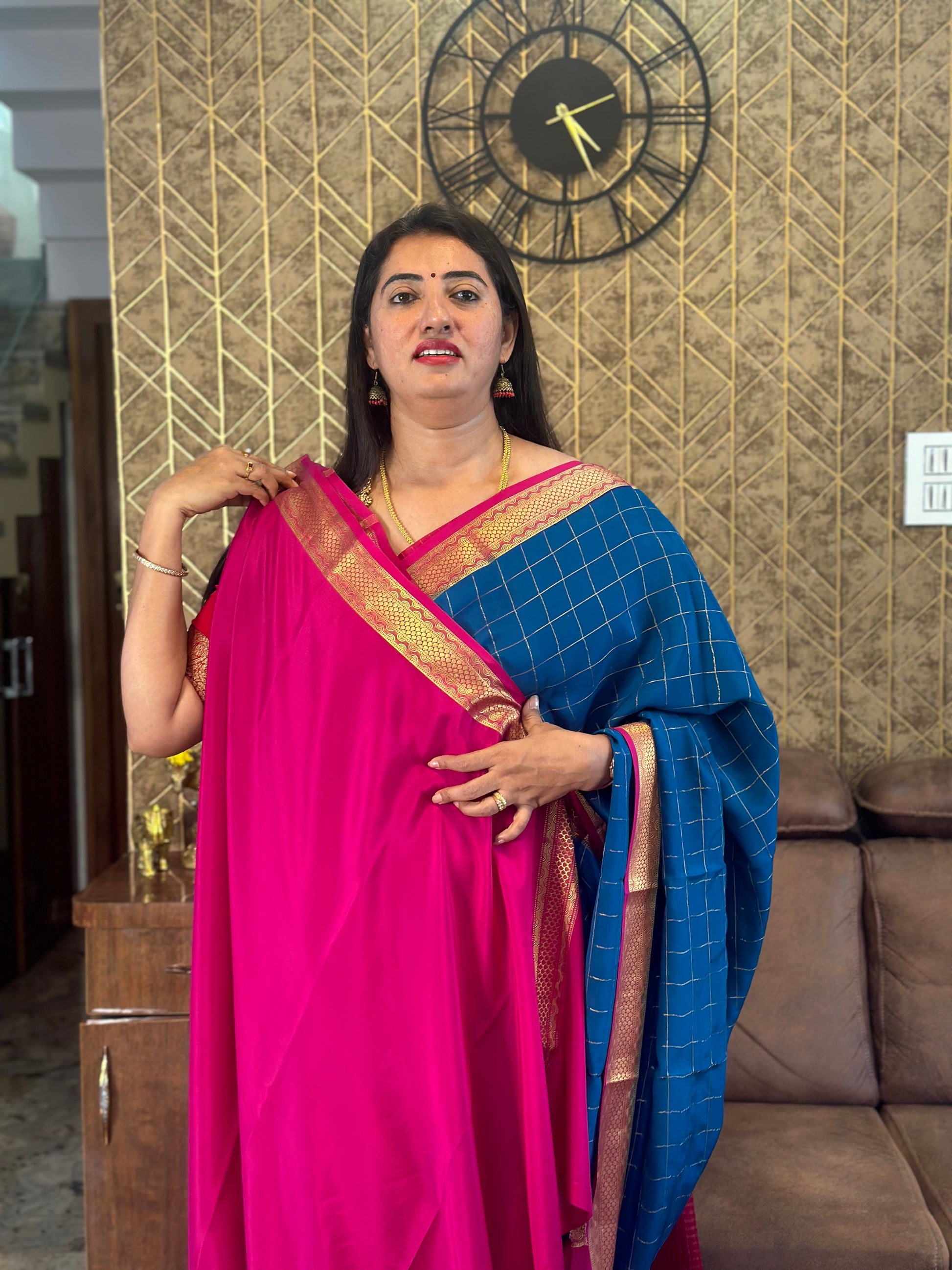 Peacock blue with pink pure crepe Mysore Silk sarees. 120 gsm