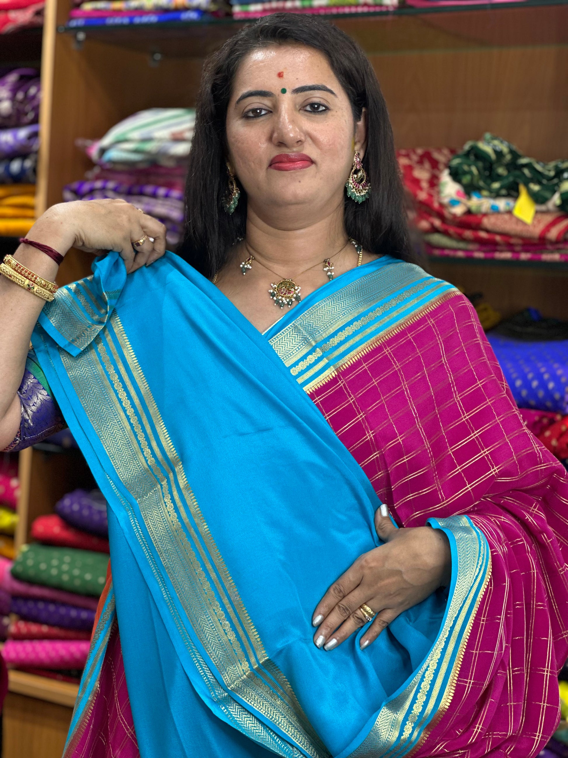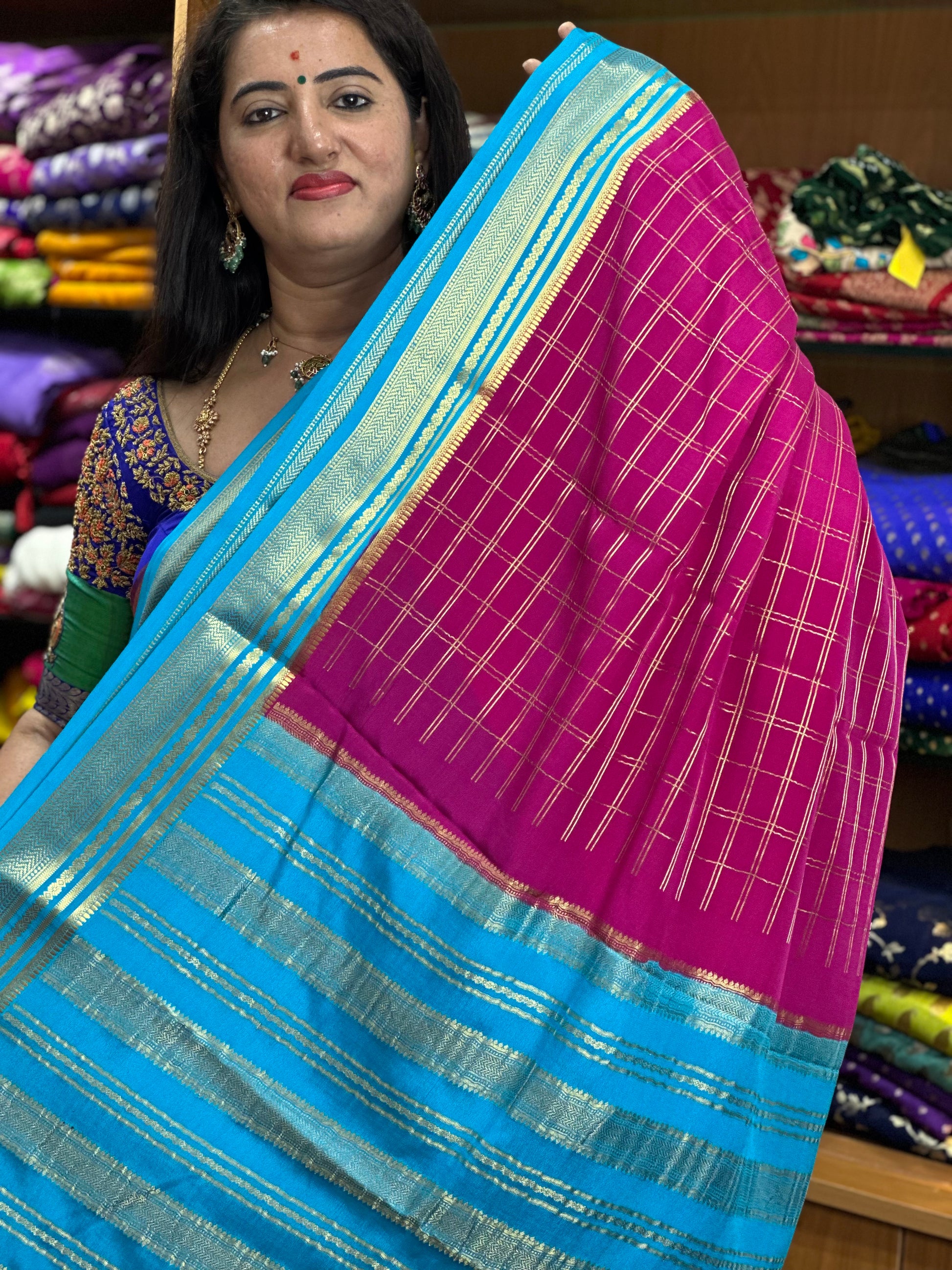 Pink and sky blue pure crepe Mysore Silk sarees 120 gsm