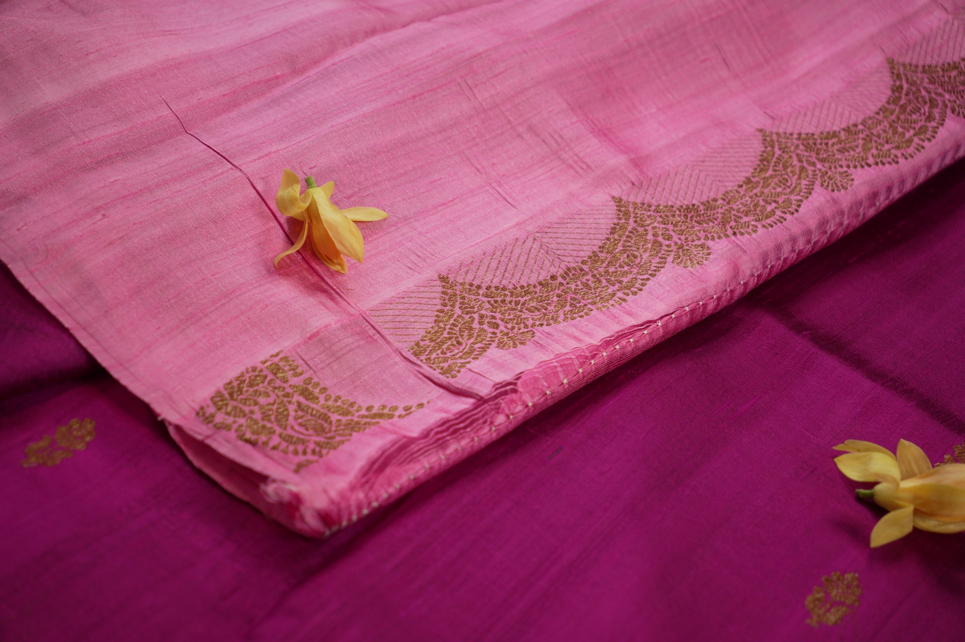 This pink pure raw silk saree is expertly crafted from high-quality silk, providing a luxurious touch to your wardrobe. The intricate weaving techniques result in a smooth, lightweight fabric that is comfortable to wear. Perfect for any occasion, this saree offers a beautiful drape and timeless elegance.