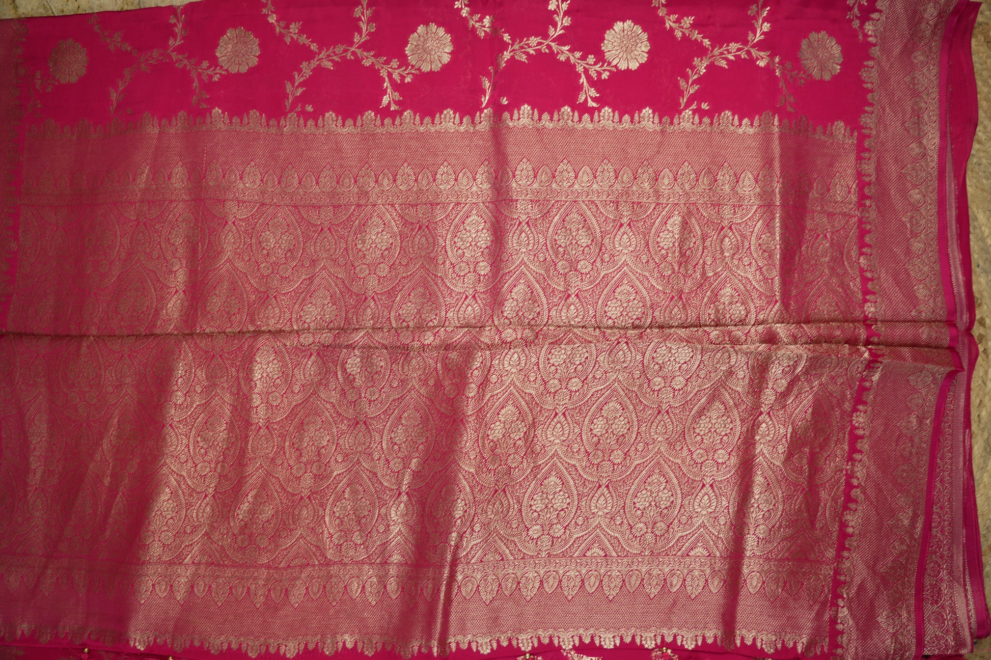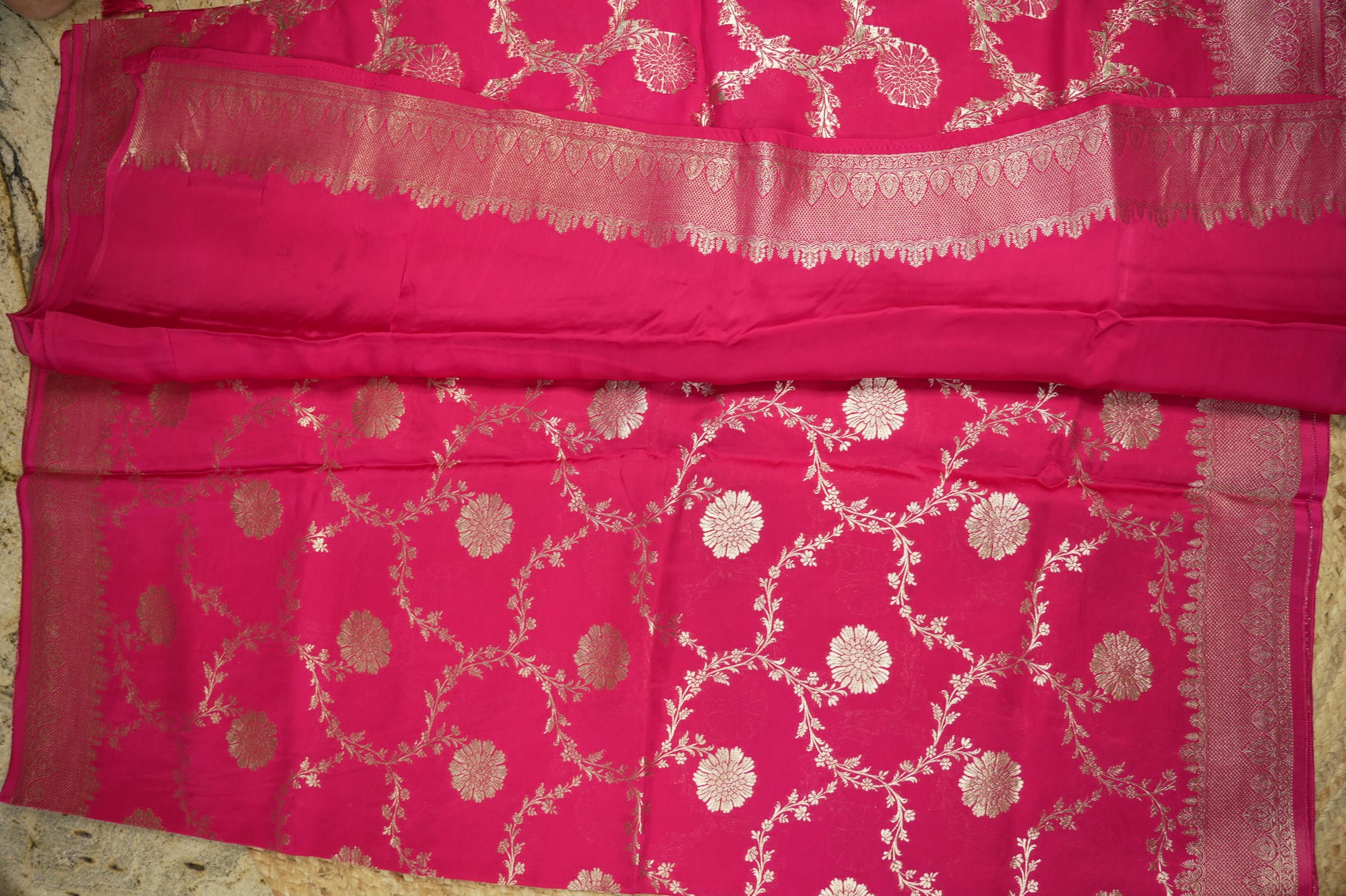 This pink pure satin silk features a delicate jaal pattern for a luxurious and elegant look. Made from pure satin silk, it offers a soft and smooth feel against the skin. Perfect for adding a touch of sophistication to any outfit.