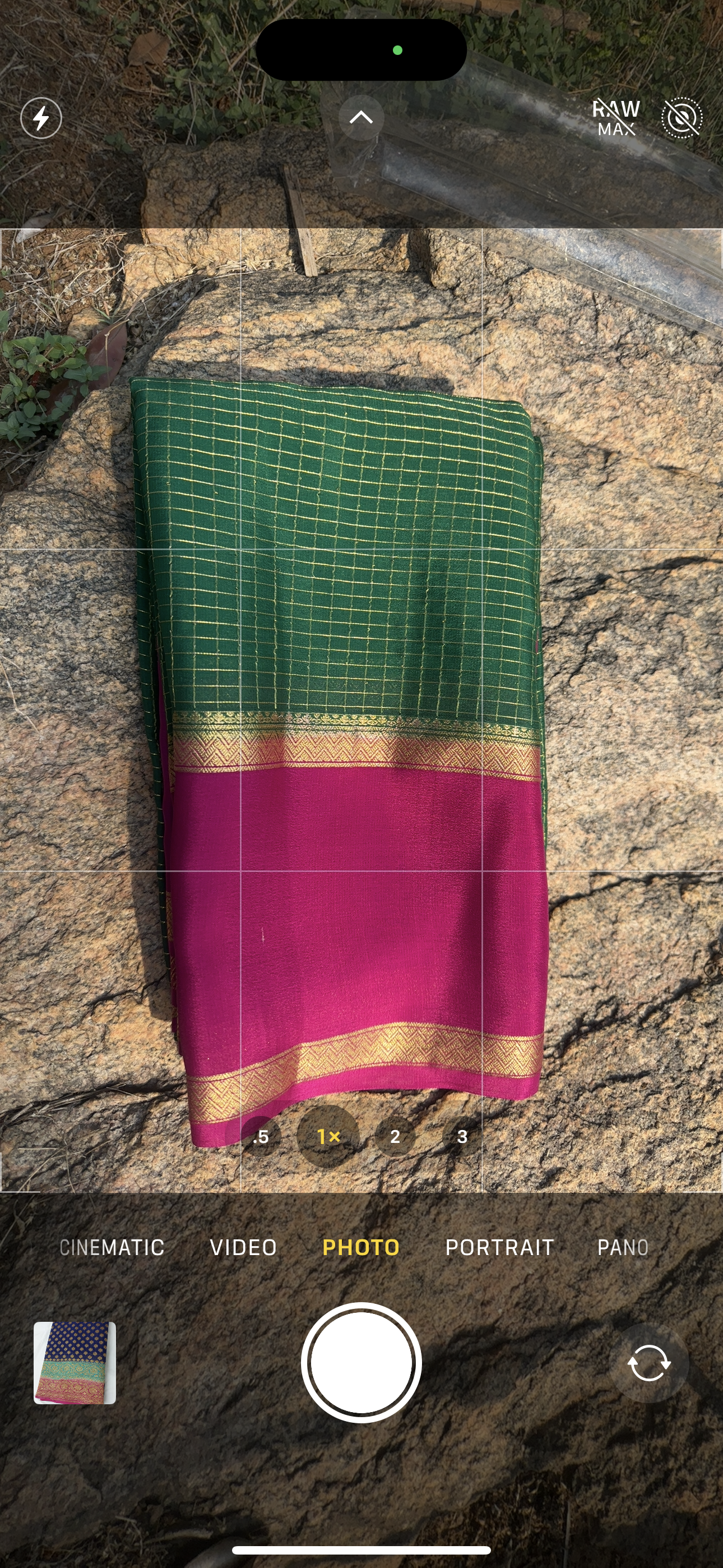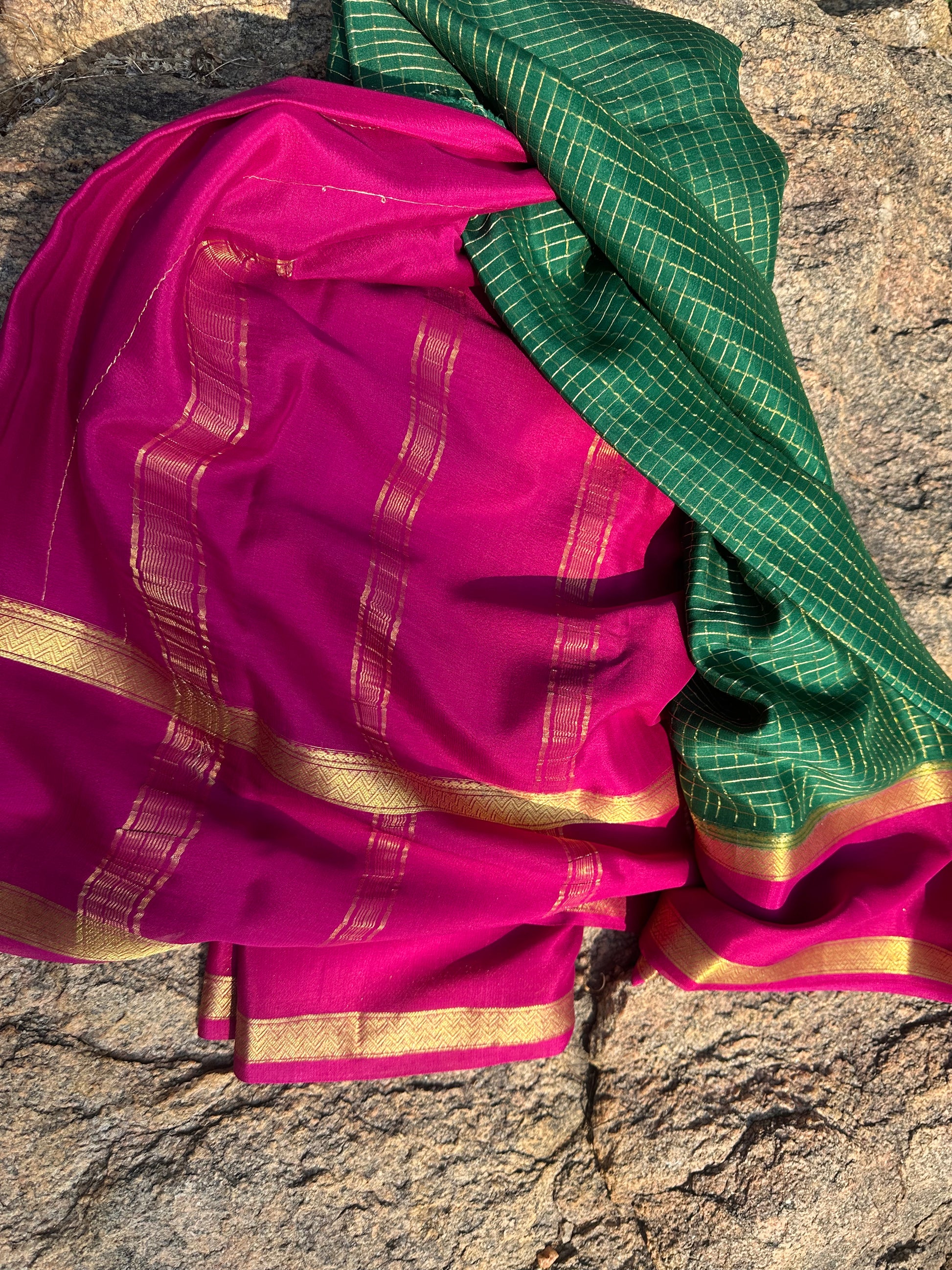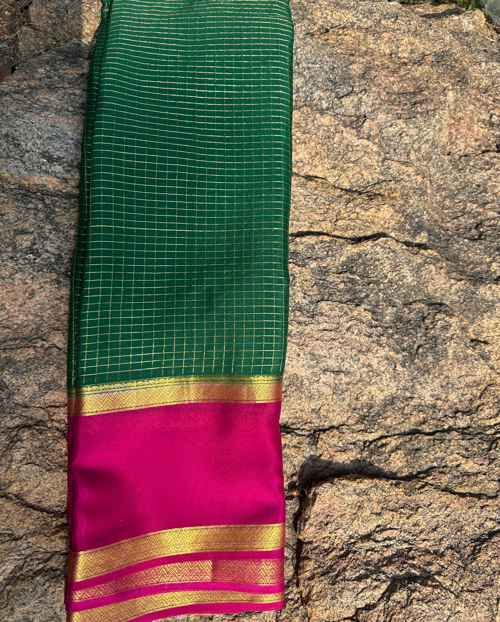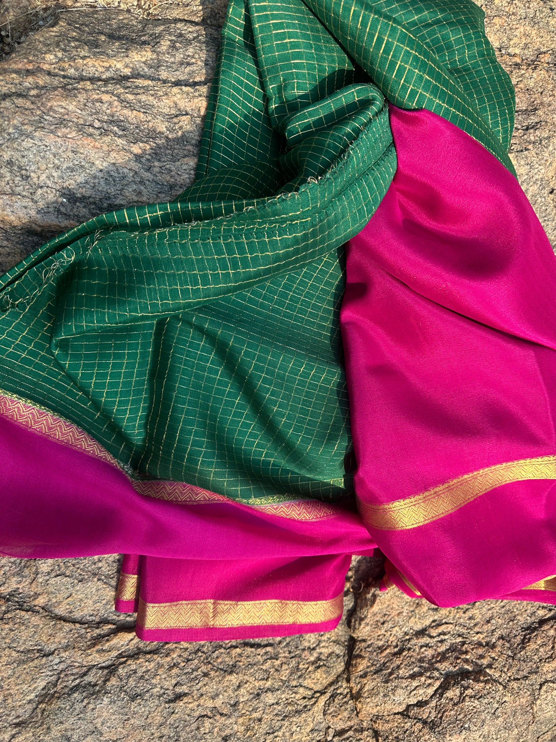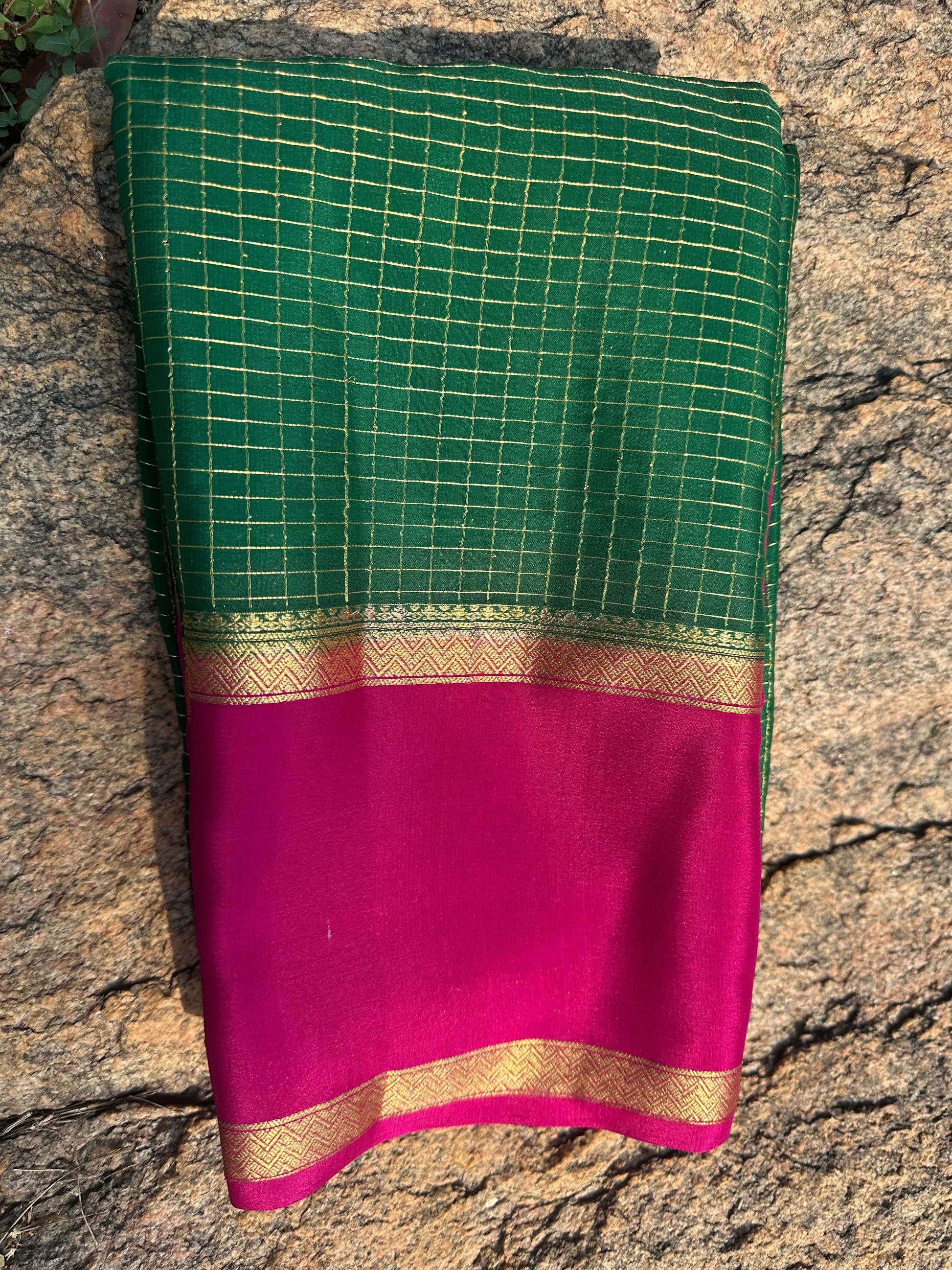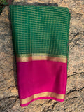 Pink with green Mysore Silk crepe checks with bentex border. 70 grams thickness.