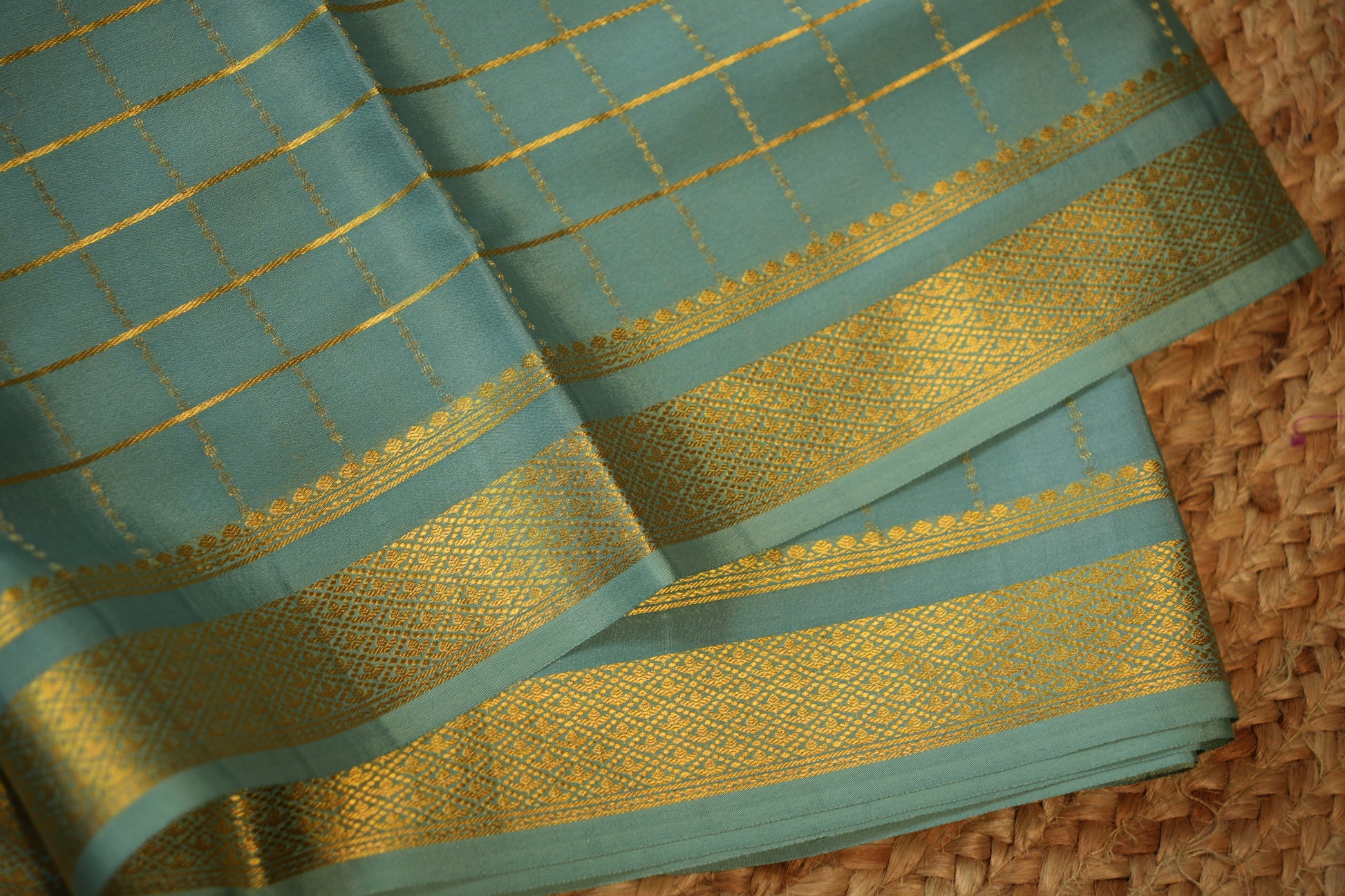 Sea green checks all over the body Pure Mysore silk 120 gsm