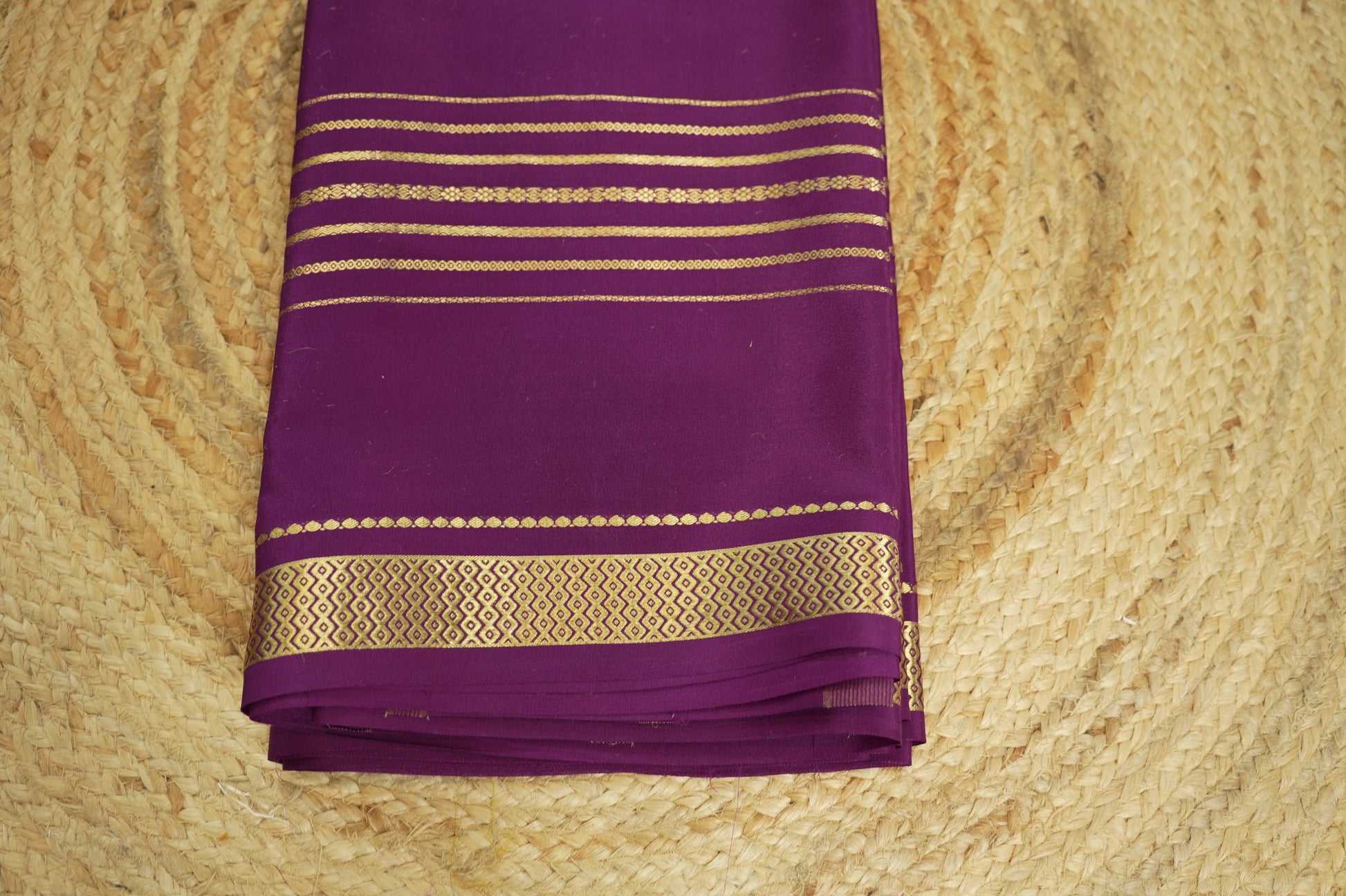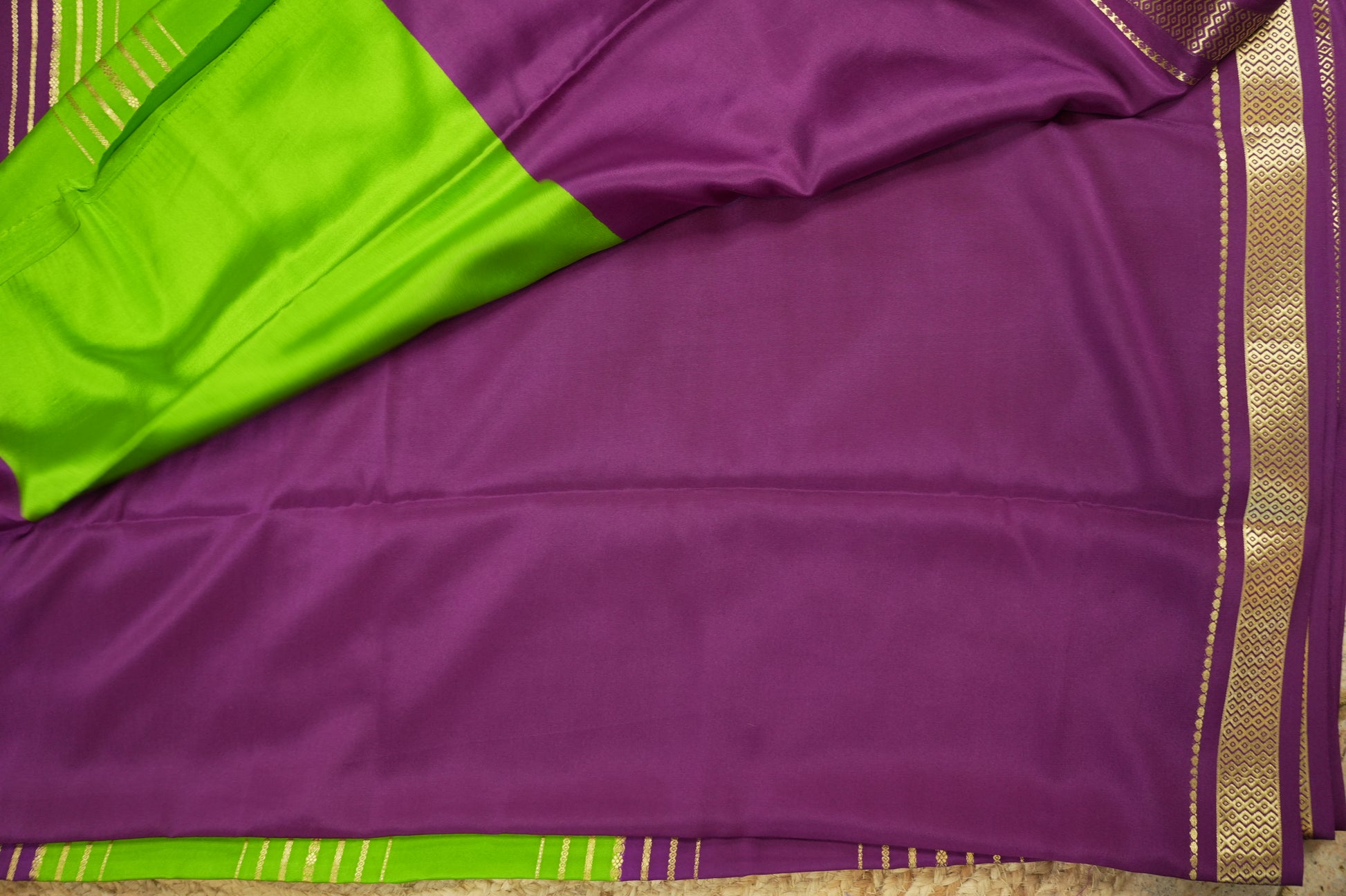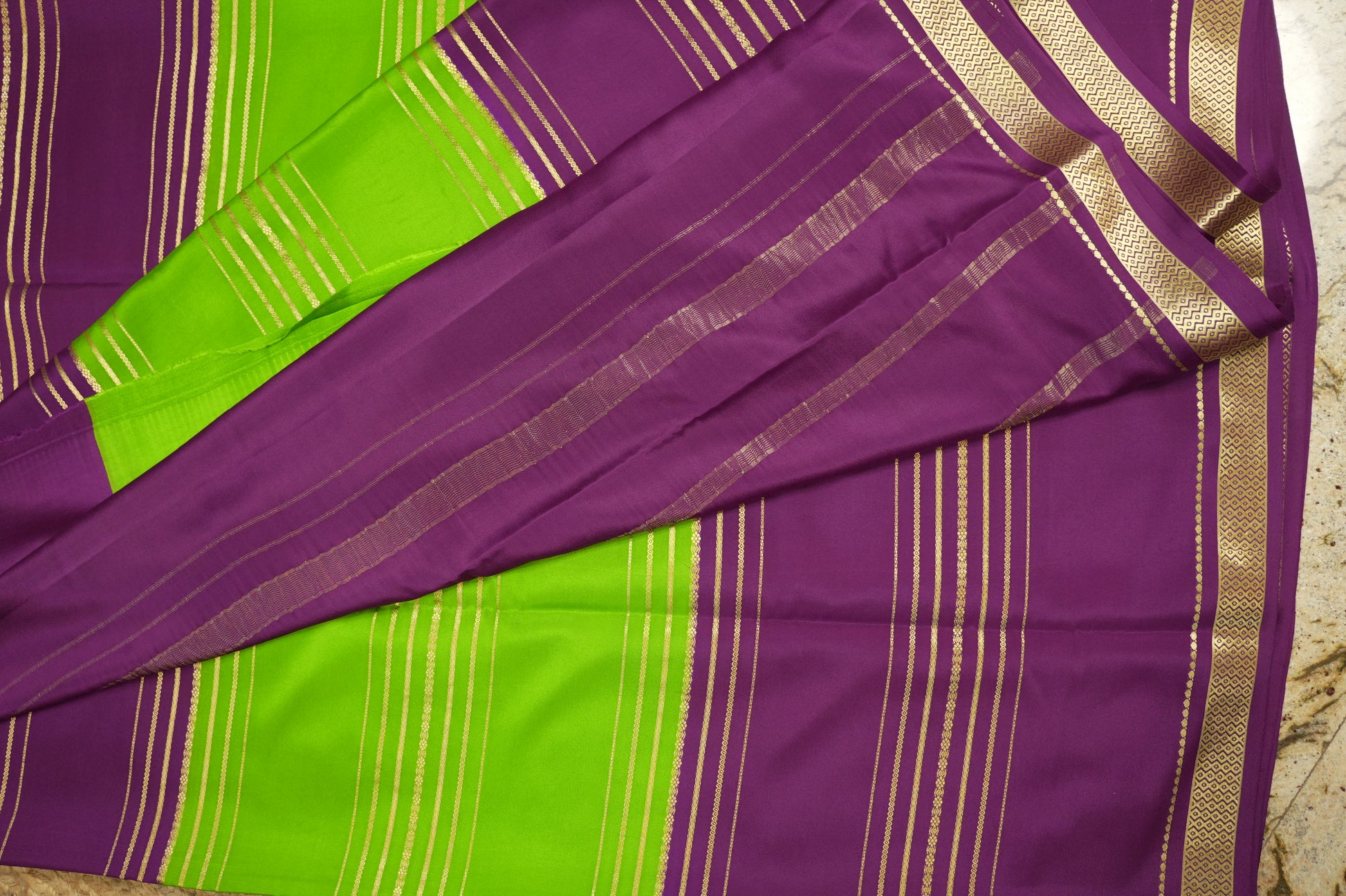 Expertly crafted with 130 gsm pure Mysore silk, this purple and green saree exudes elegance and luxury. Its delicate crepe texture adds a touch of sophistication, making it perfect for any special occasion. Elevate your style with this stunning saree and feel confident in its high quality and timeless beauty.