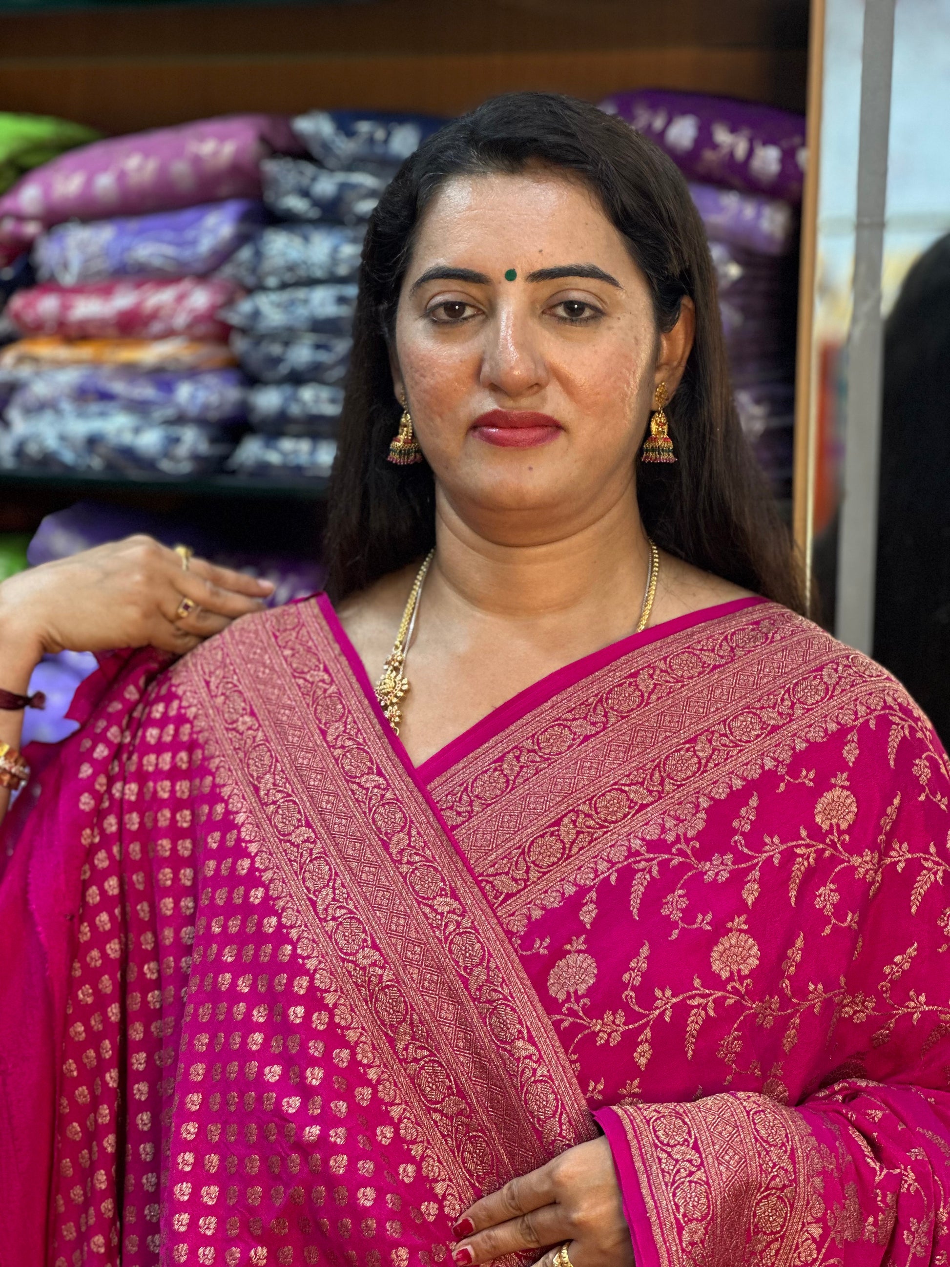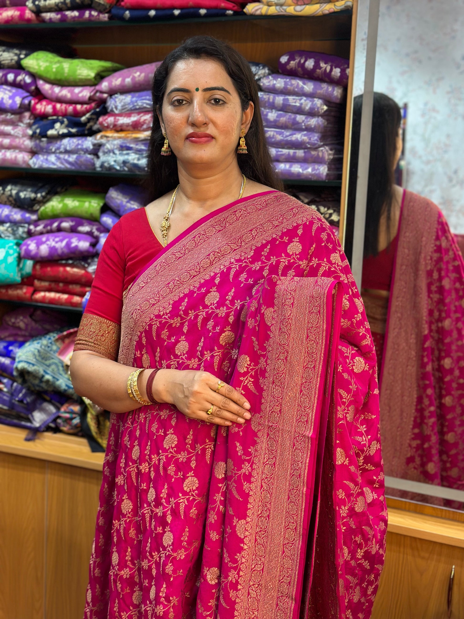 Rani pink pure crepe Banaras jaal pattern with butta blouse