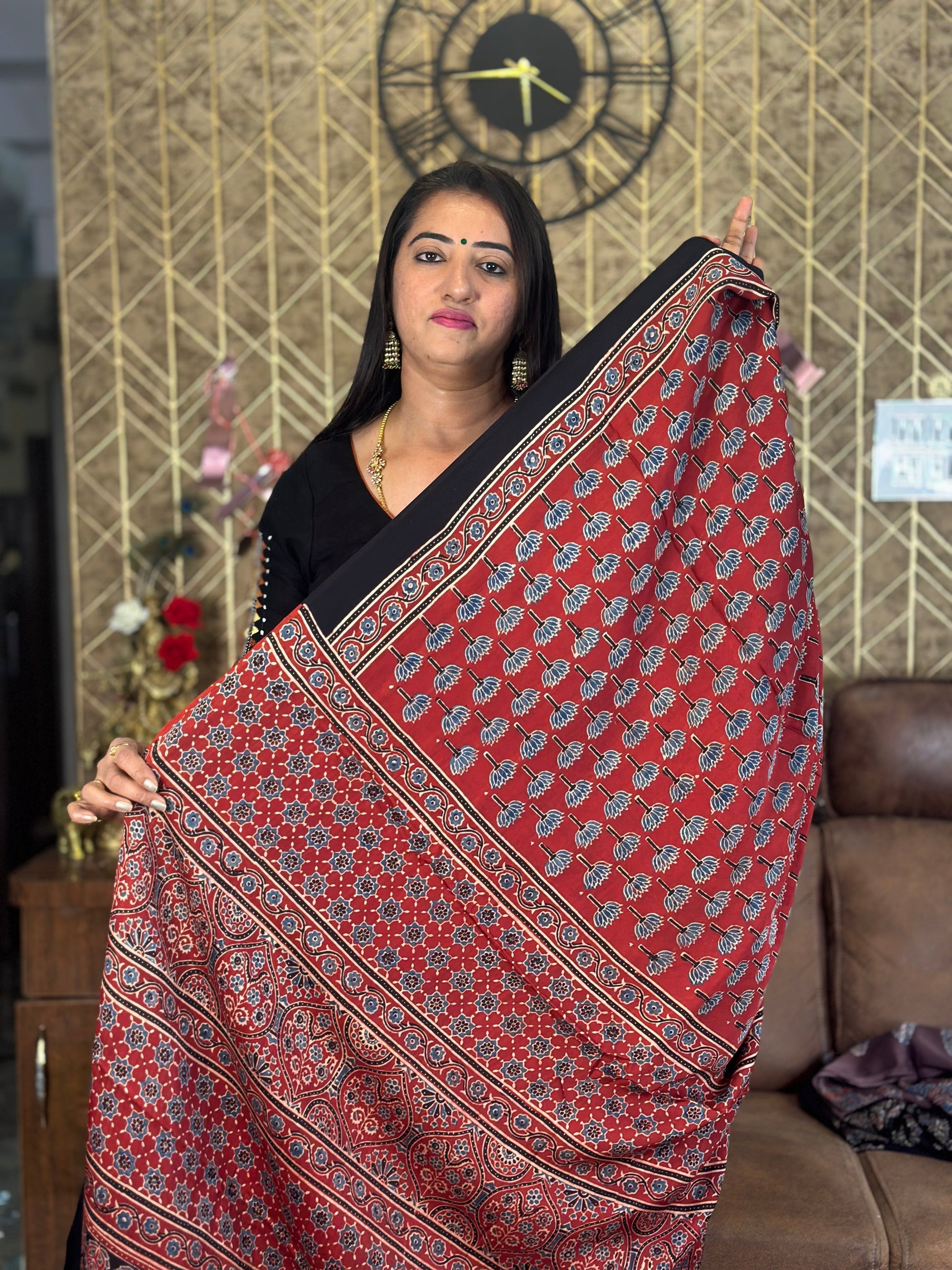 Red and black Ajrak pure modal silk sarees.