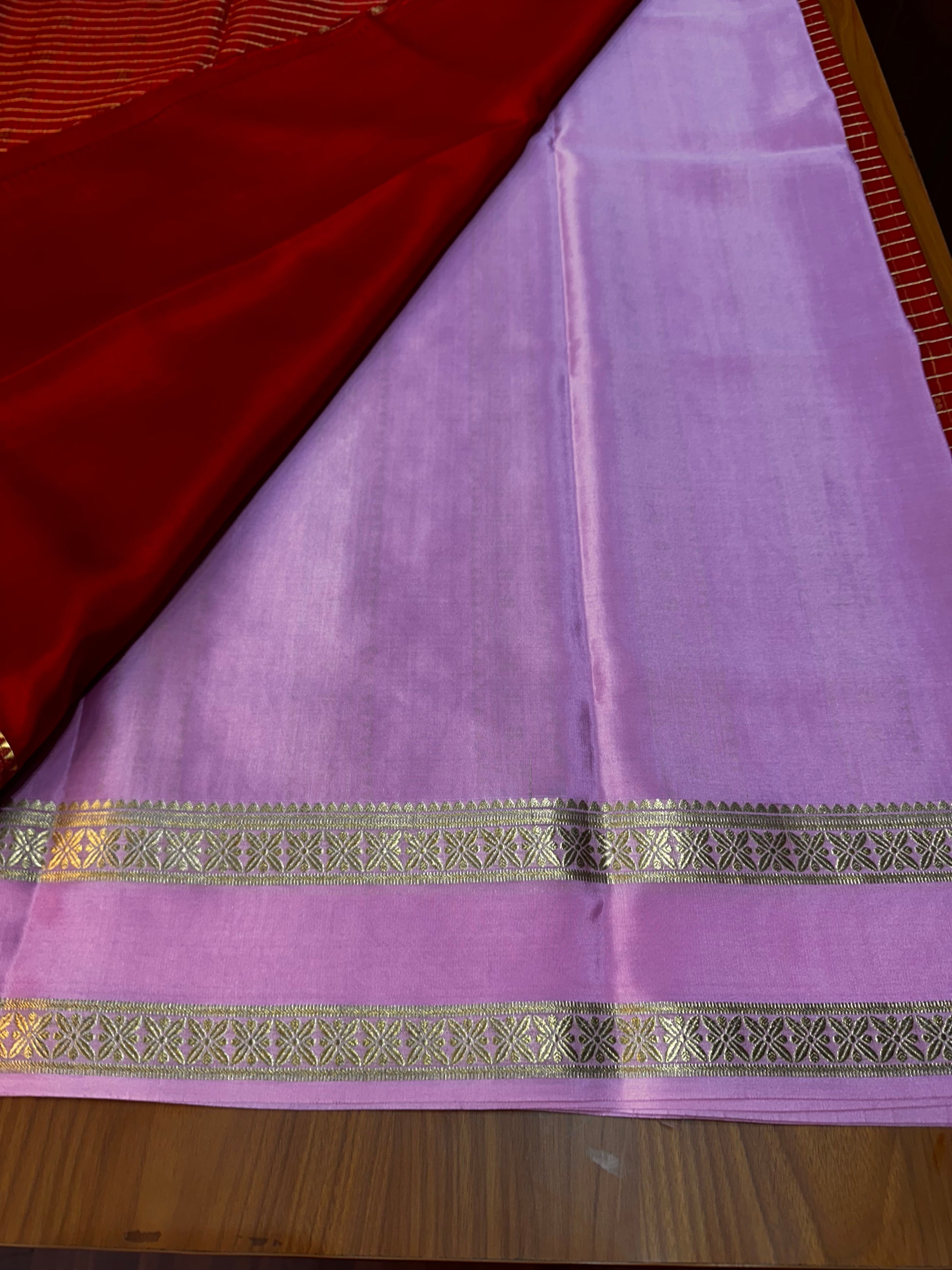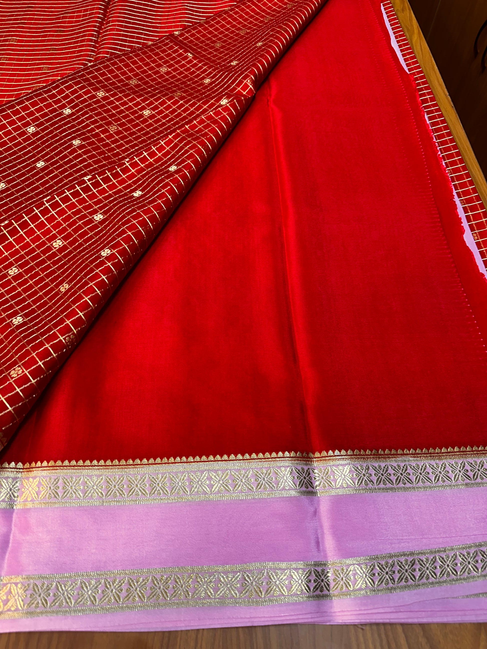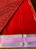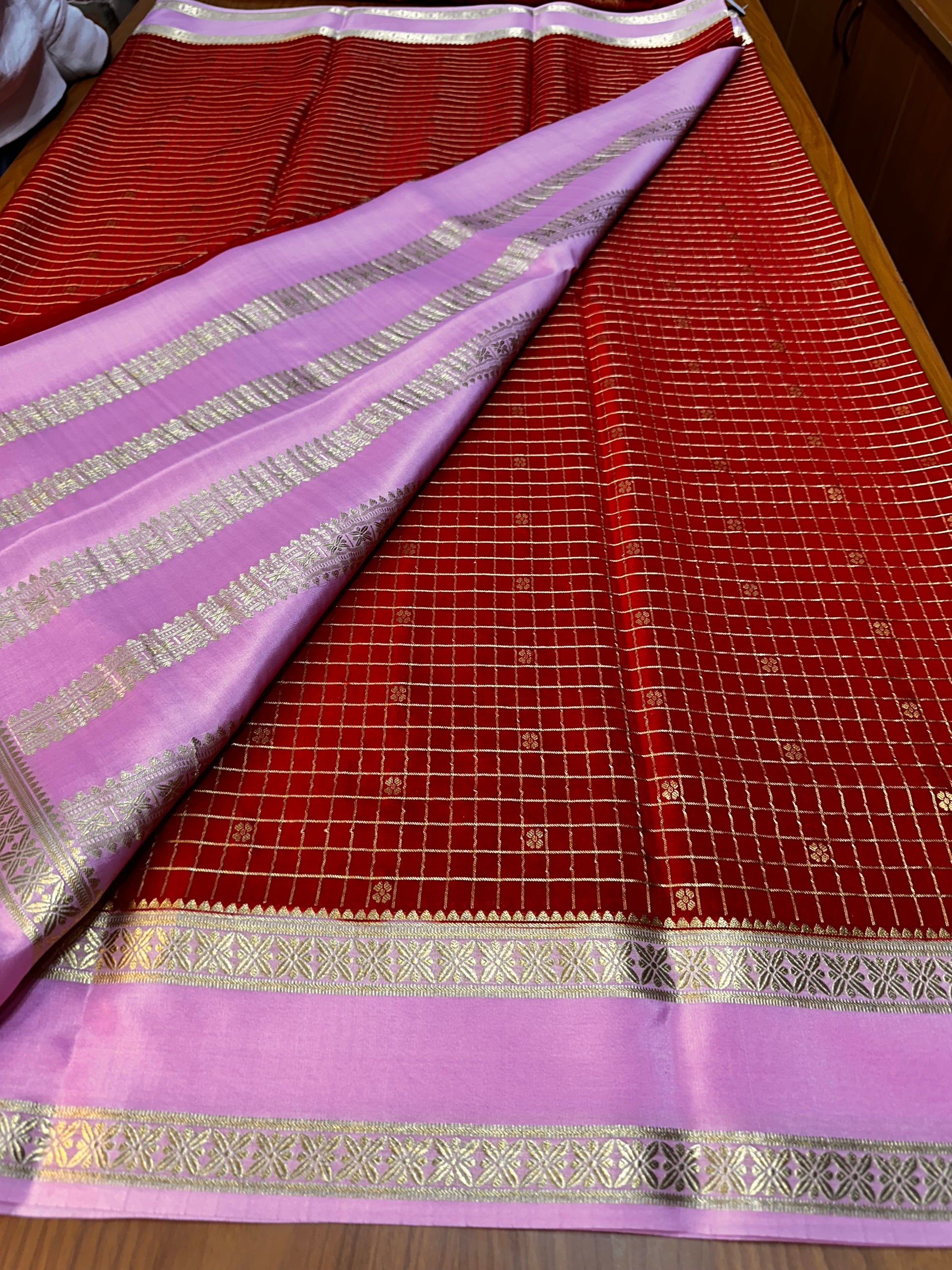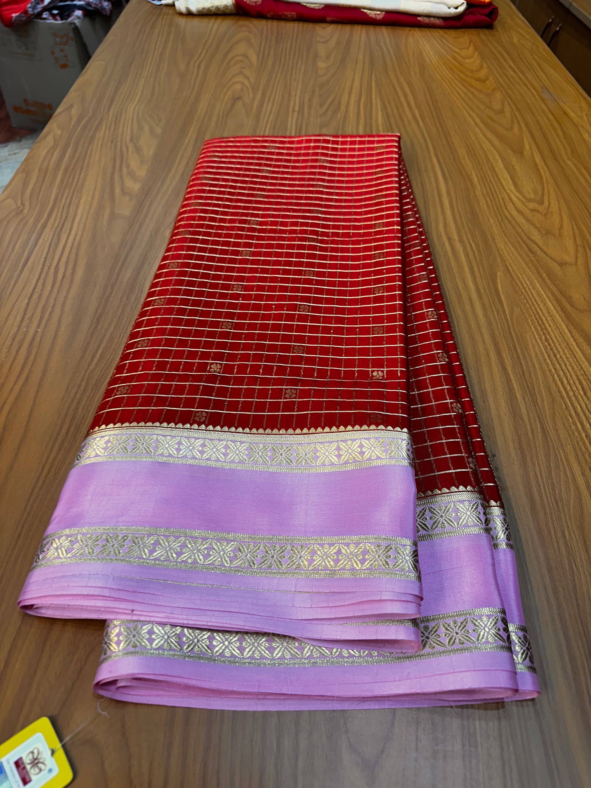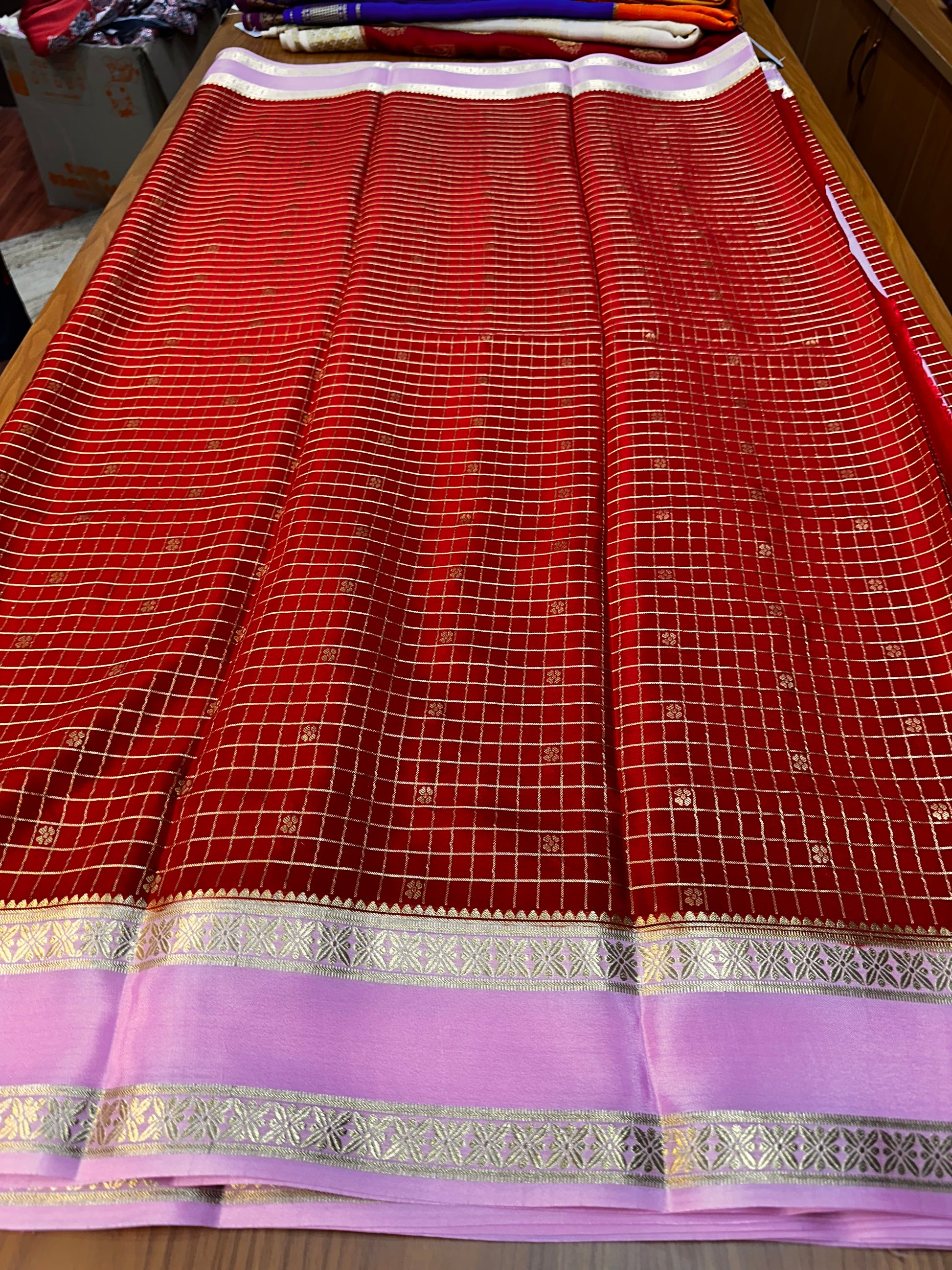 Red and pink pure crepe Mysore Silk checks pattern 120 gsm